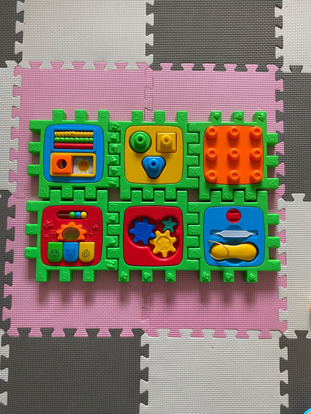 Všetky časti na fotke funkčné - vľavo dole je panel,ktorý po stlačení zvieratiek vydáva zvuky, slniečko svieti a tiež po stlačení vydáva melódiu. Kolieska pri otáčaní rapčia…