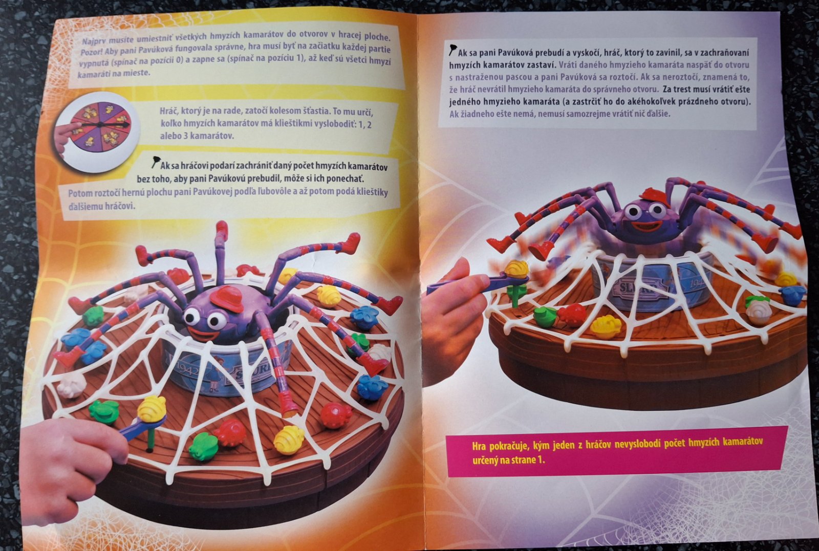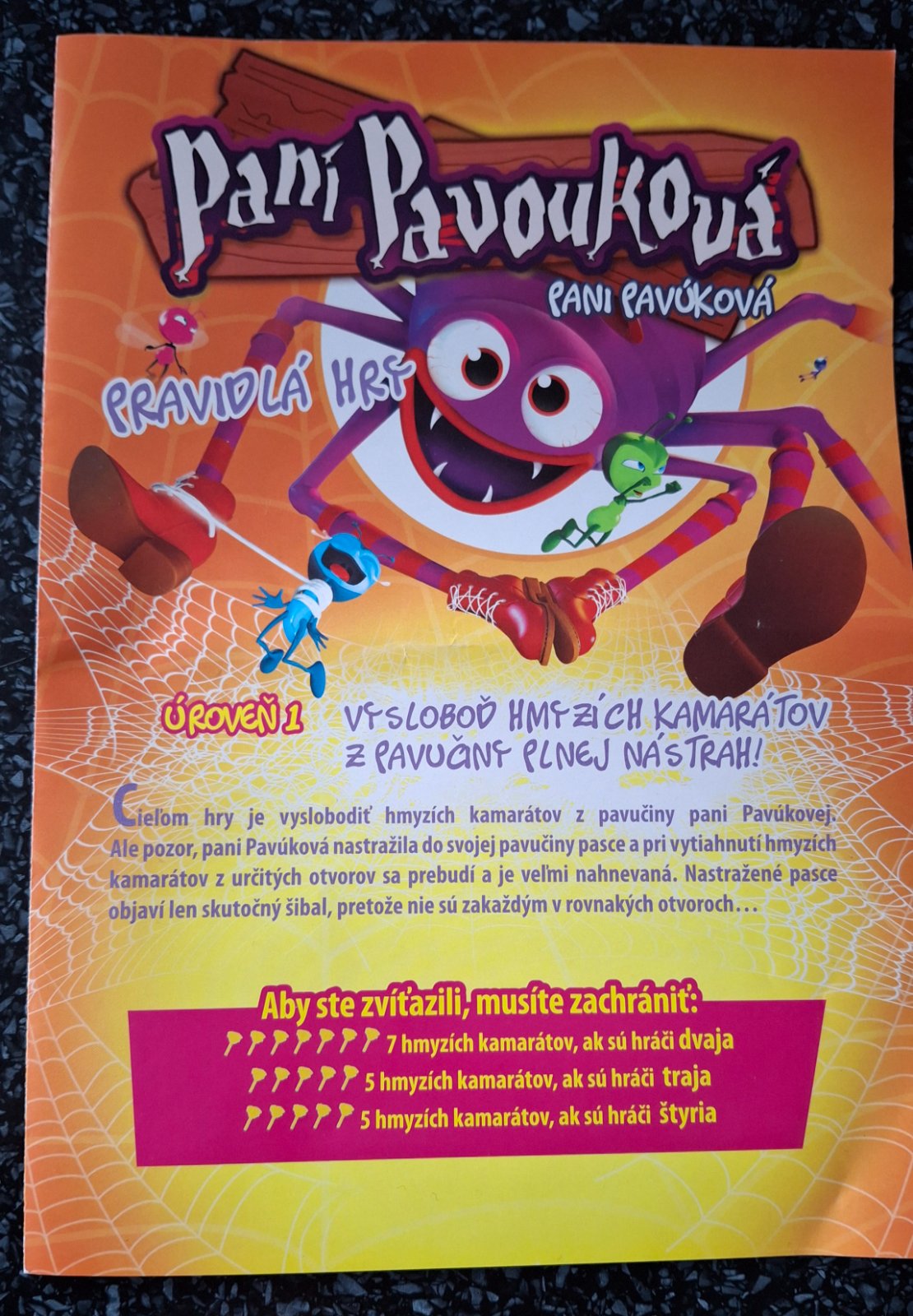 Predám funkčnú a kompletnú zábavnú hru, ktorej cieľom je zo siete pani Pavúkovej oslobodiť hmyzích kamarátov.
