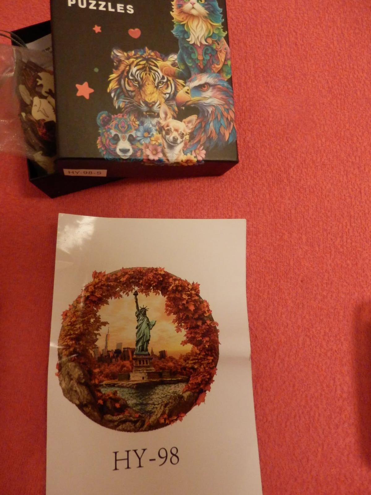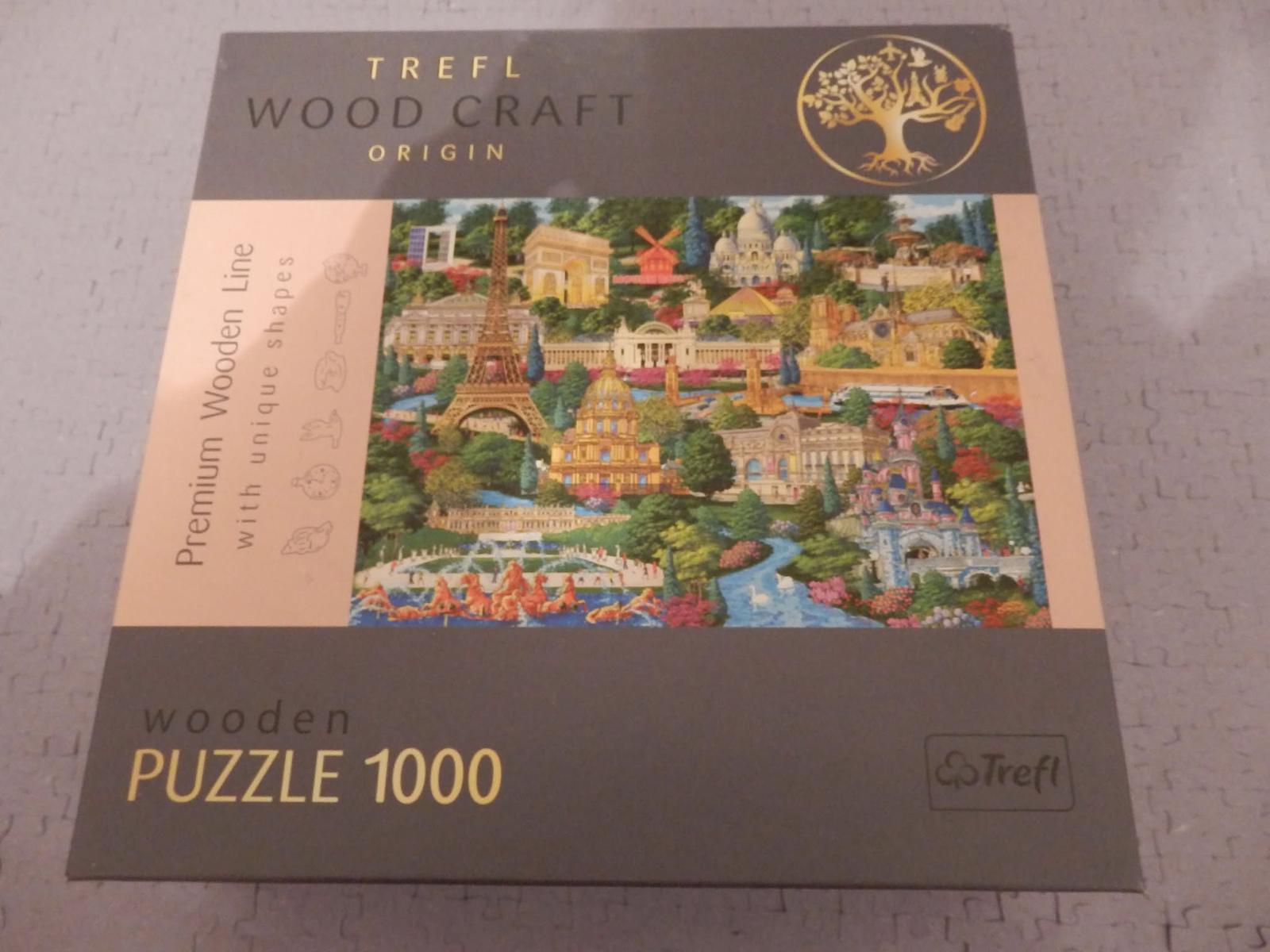 Drevené puzzle, Paríž originál nerozbalené 1000 kusov, značka Trefl Wood Craft - 20 Eur, Socha slobody 7 Eur.