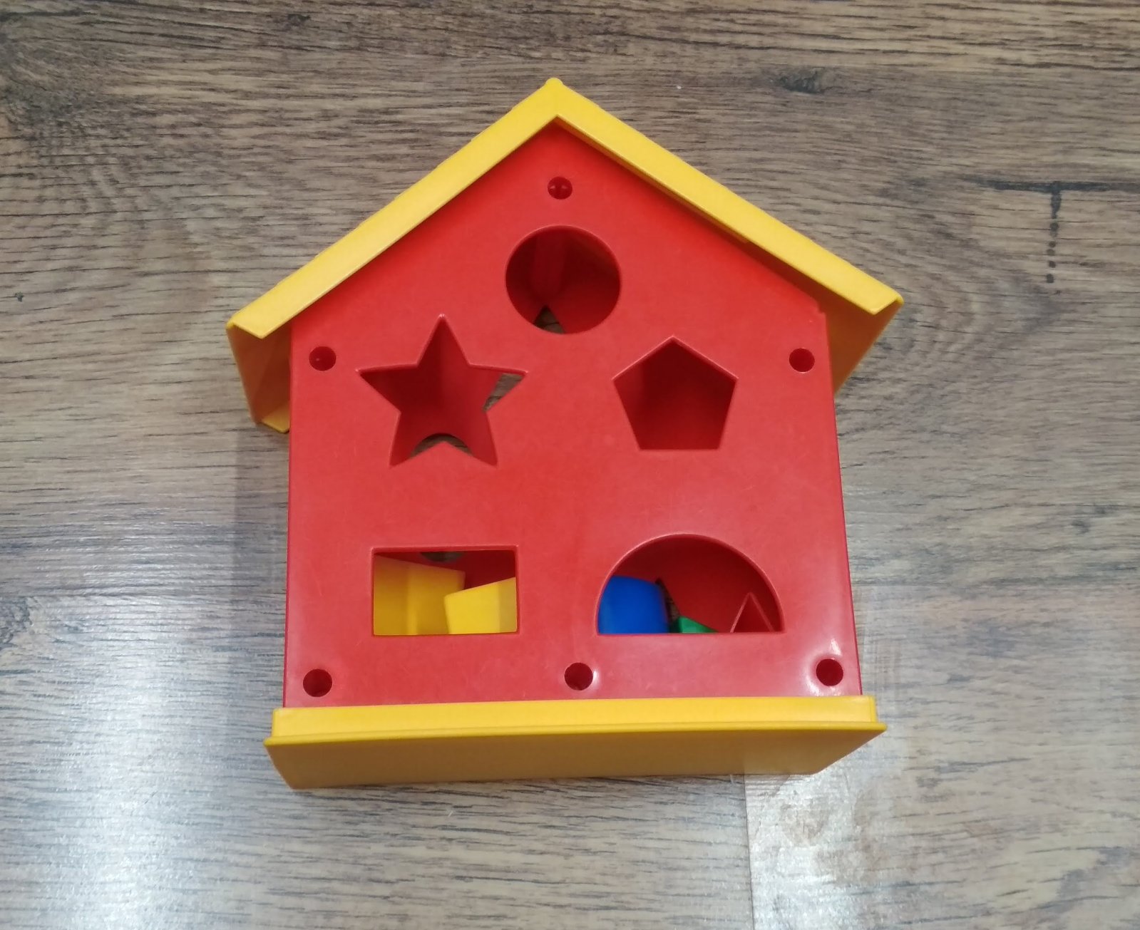 predam domček + geometrické tvary, domček sa dá rozobrať- vkladanie tvarov do správnych otvorov, 2 tvary chýbajú