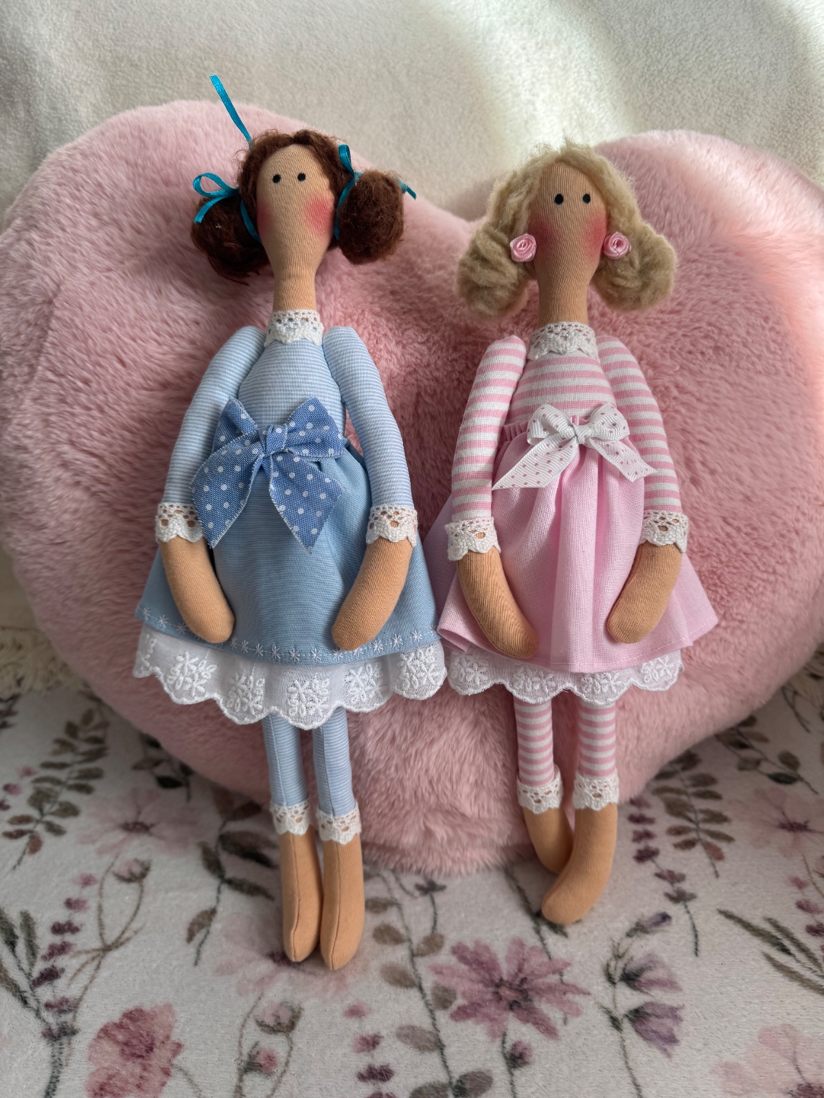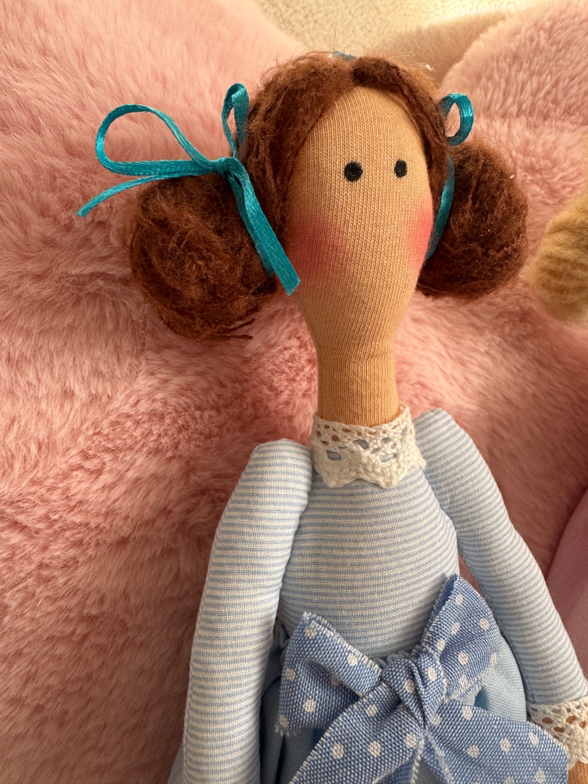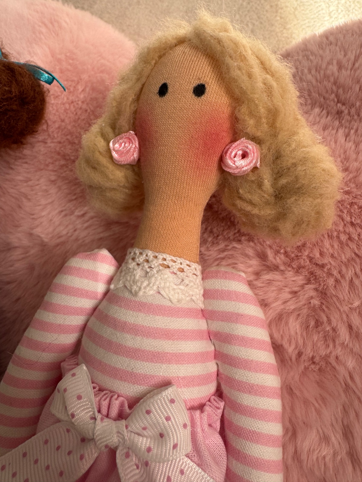 Krásne jarné bábiky ako dekorácia alebo aj pre väčšiu slečnu.Ručná výroba.Plnené dutým vláknom.Ružová je už zadaná.Modrá k odberu.Prípadne vyrobím podobnú,aj v inej farbe😁