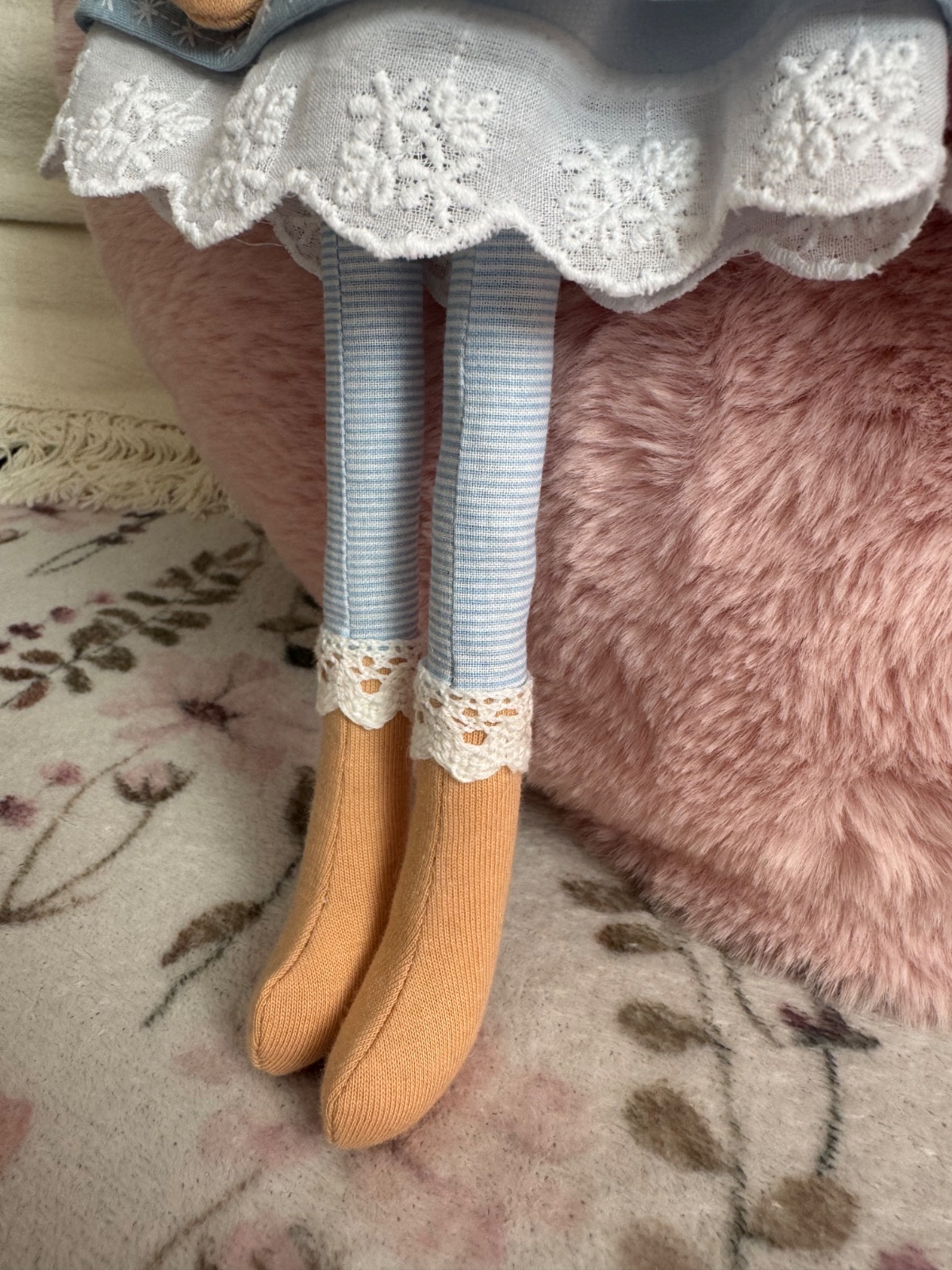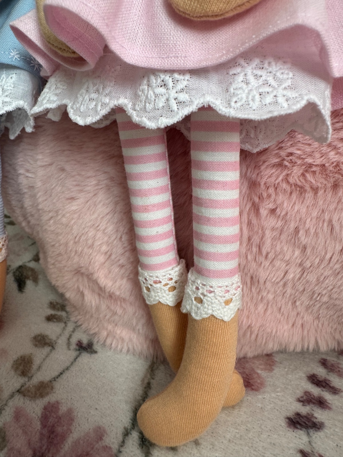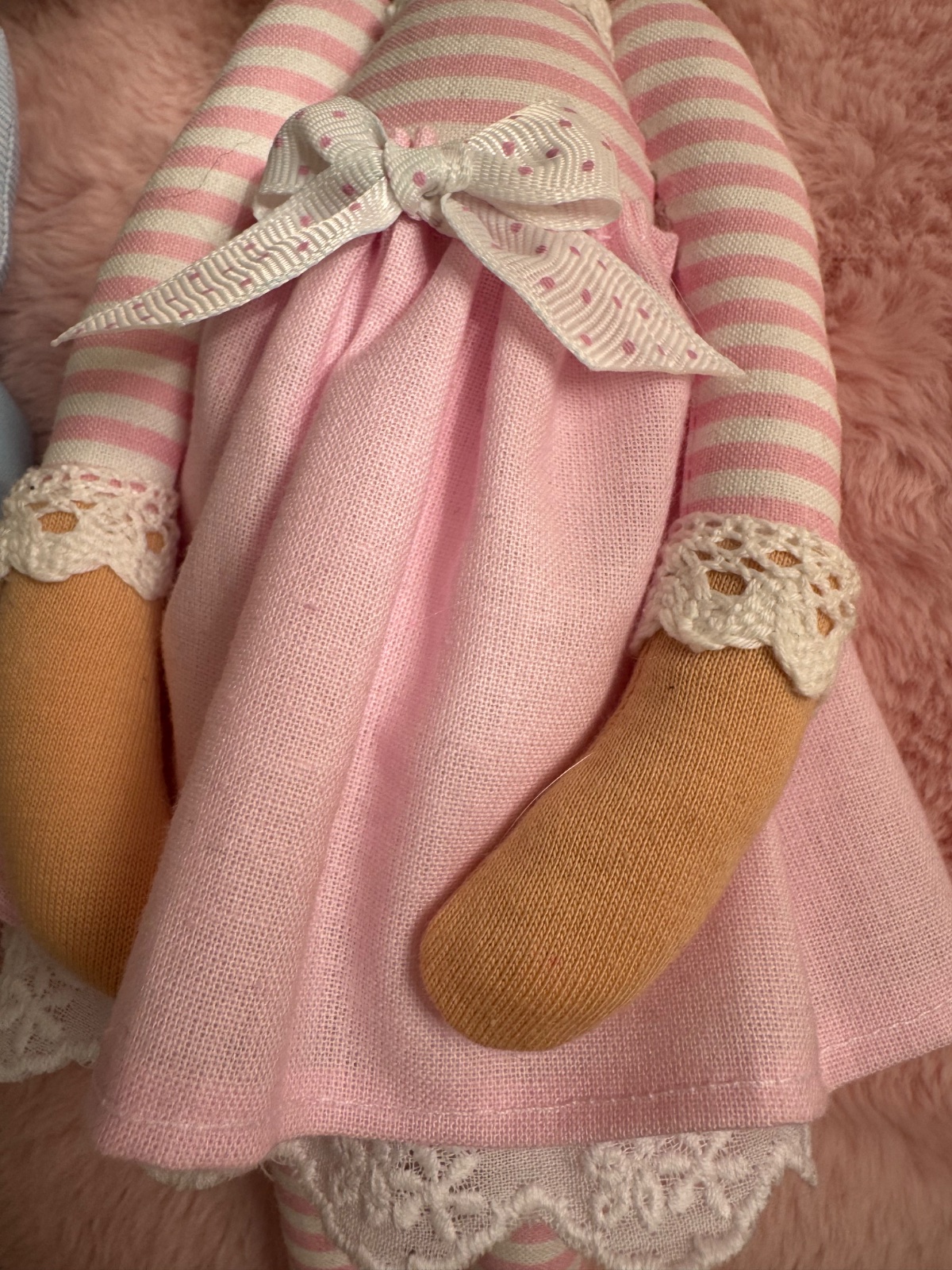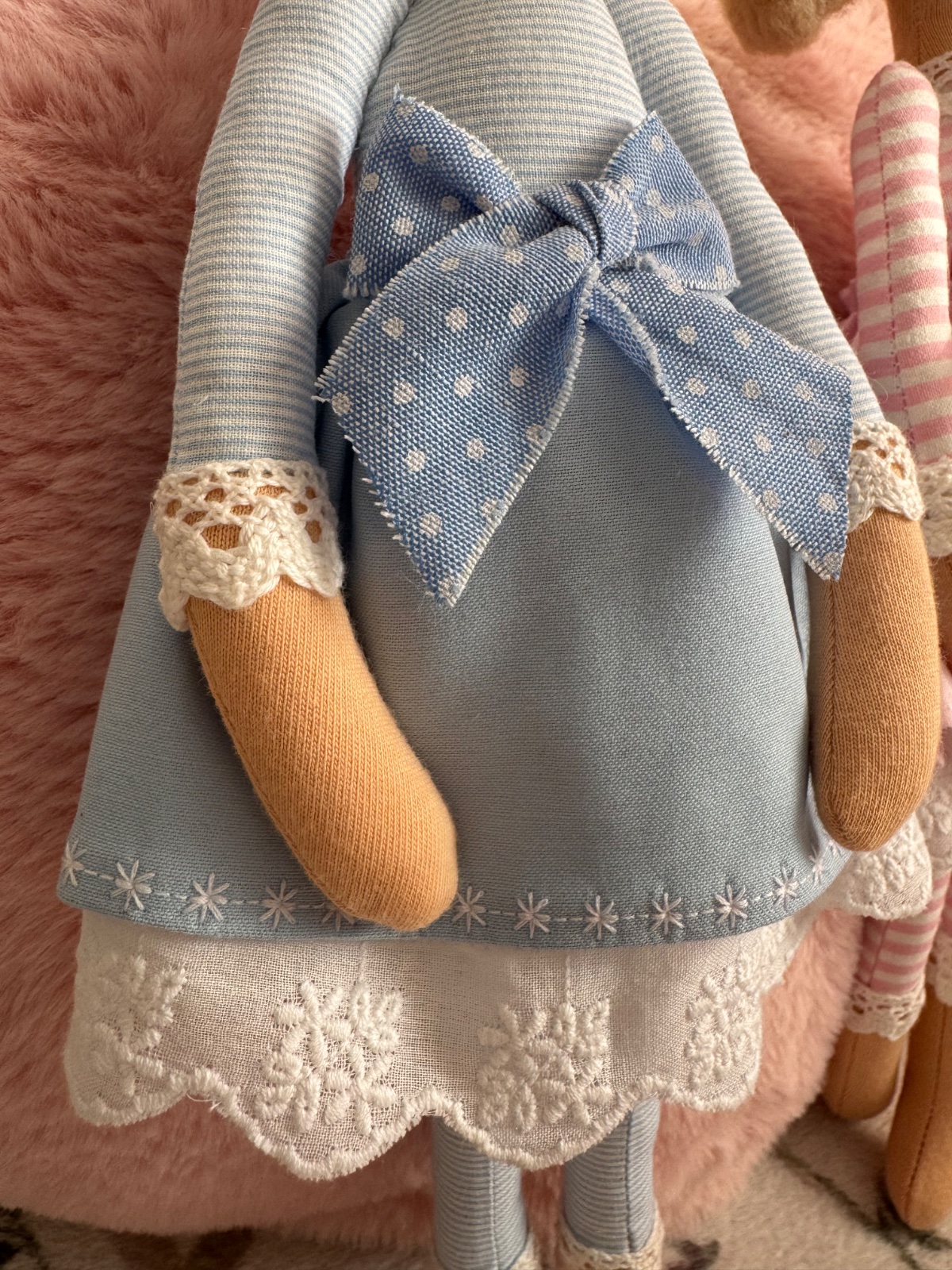 Krásne jarné bábiky ako dekorácia alebo aj pre väčšiu slečnu.Ručná výroba.Plnené dutým vláknom.Ružová je už zadaná.Modrá k odberu.Prípadne vyrobím podobnú,aj v inej farbe😁