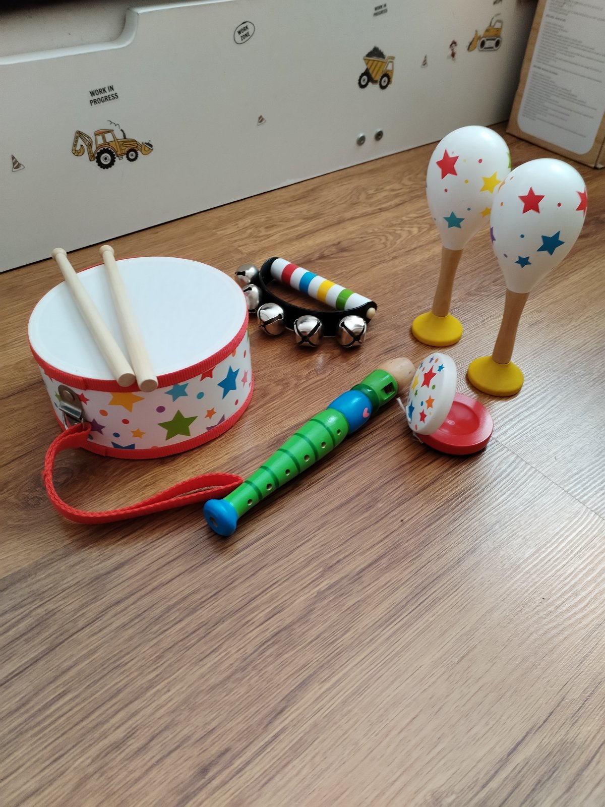 Hudobné nástroje značky Bigjigs, majú príjemný zvuk, bubon drevene telo, kastaneta drevená, 2 rumba gule, rolničky a flauta.