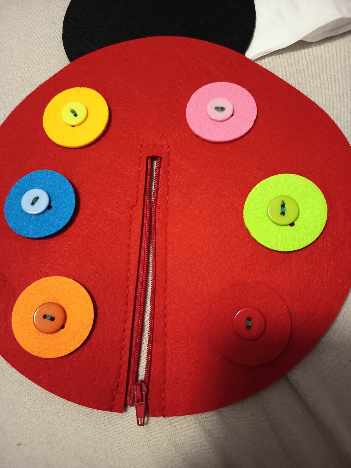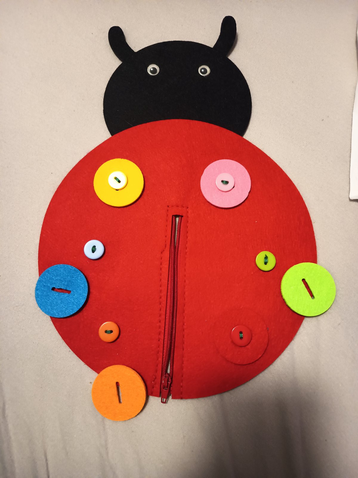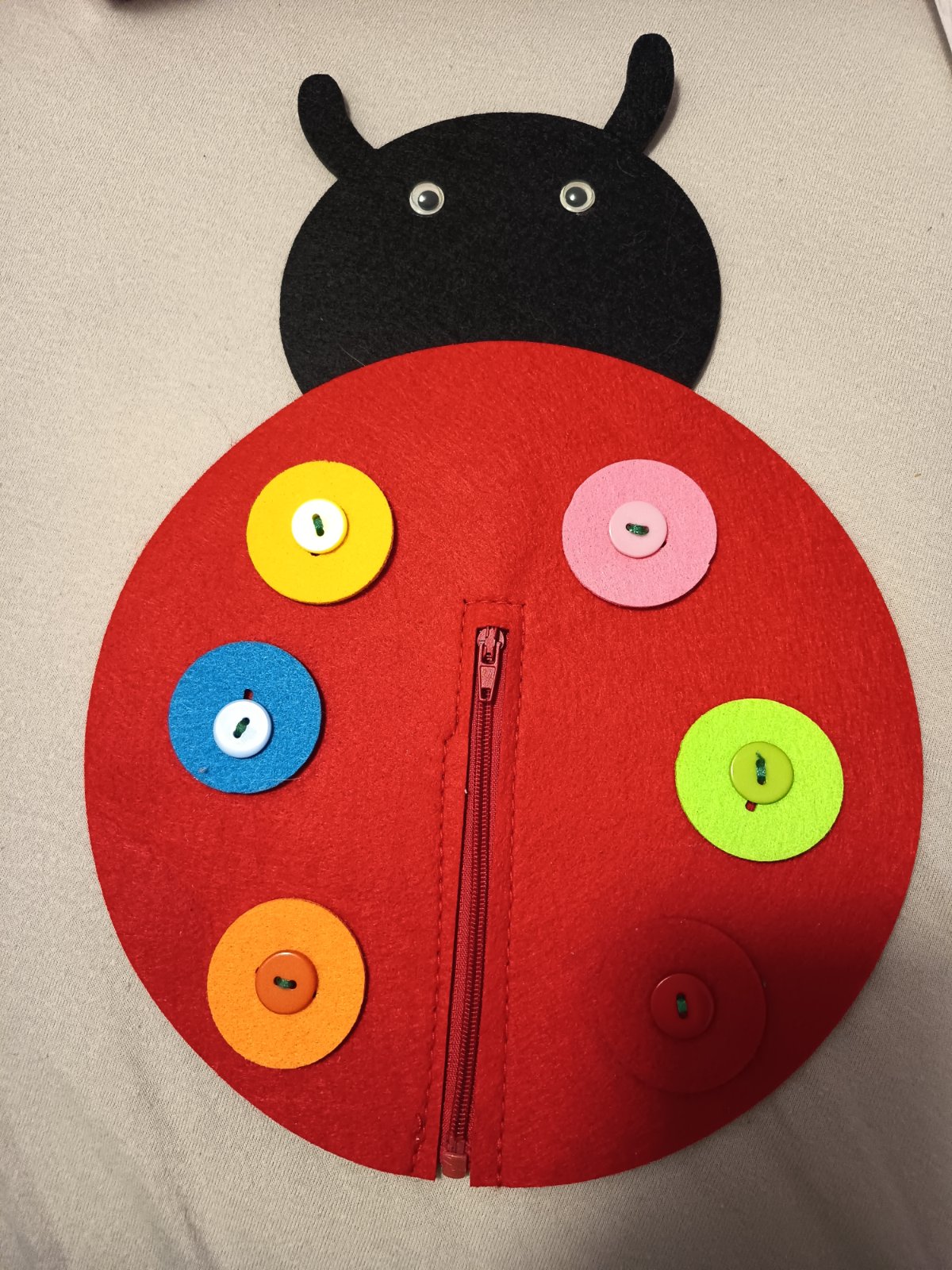 Lenka s farebnými gombíkmi a zipsom na trénovanie jemnej motoriky a farieb. Gombíky sa dajú dať dole, zips sa dá rozopnúť.