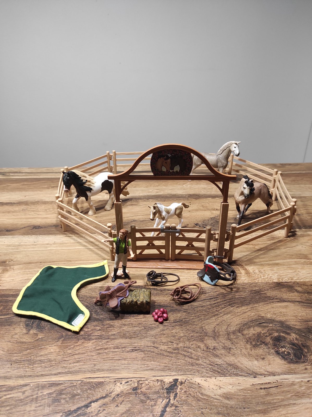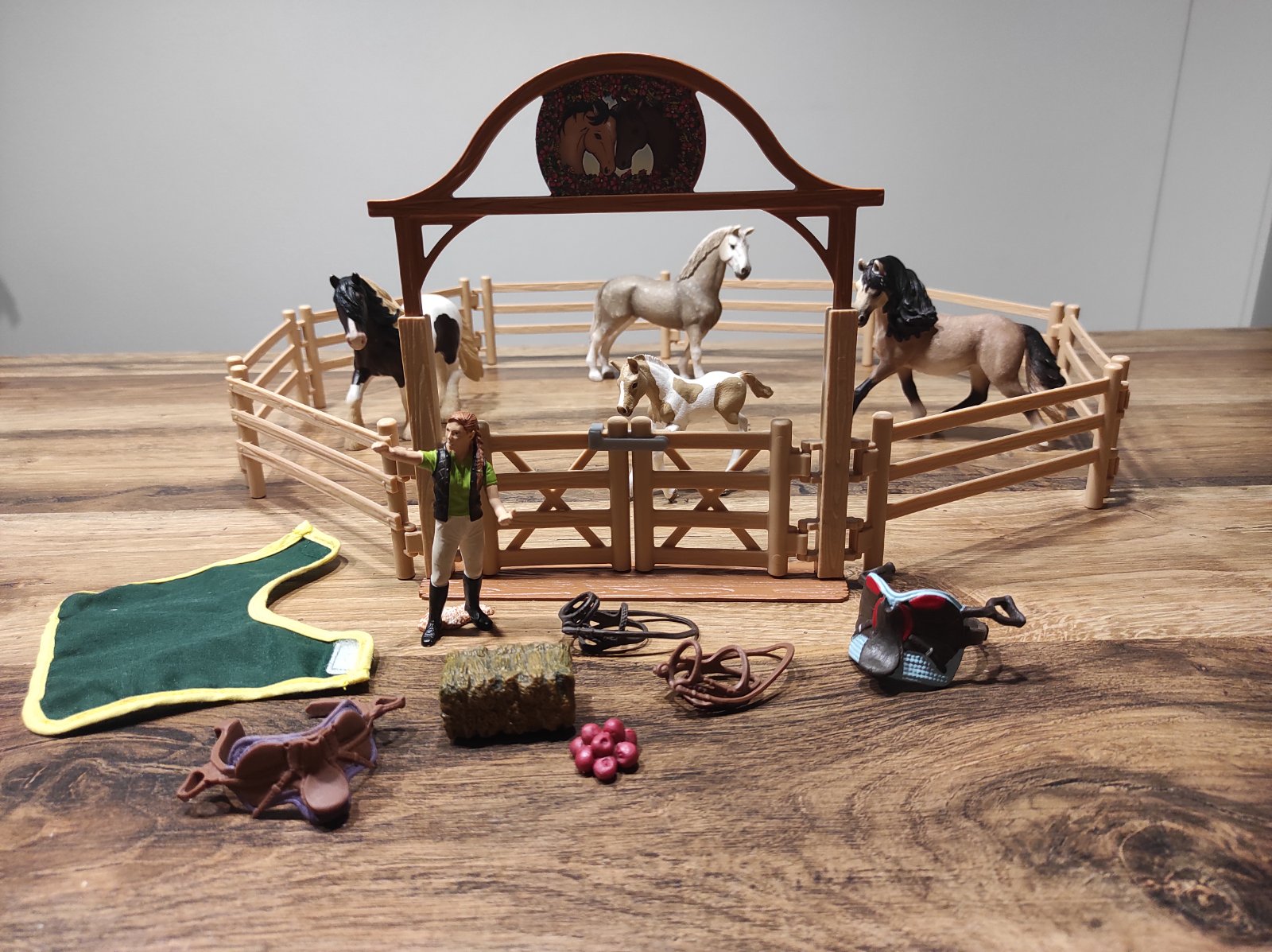 Obsahuje 3 veľké kone a 1 malého koníka, 2x sedlo, ošetrovateľku, deku, 2x vôdzku, jablká, seno a ohradu