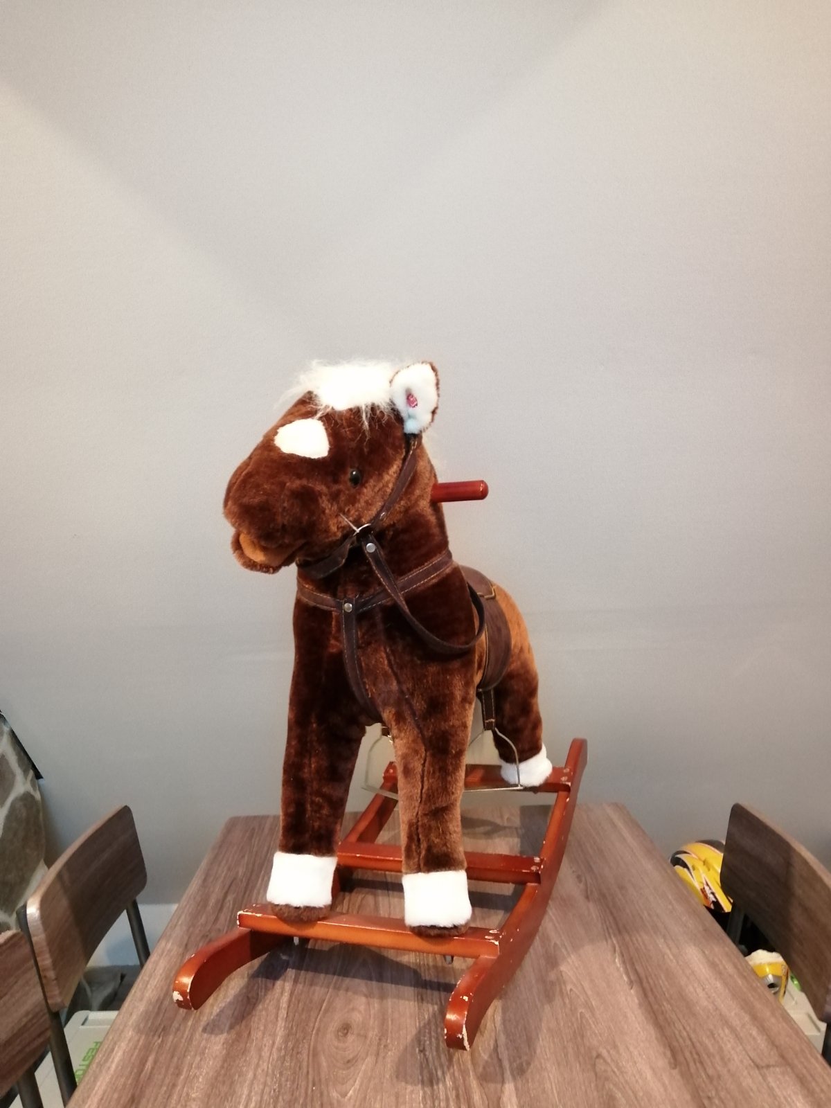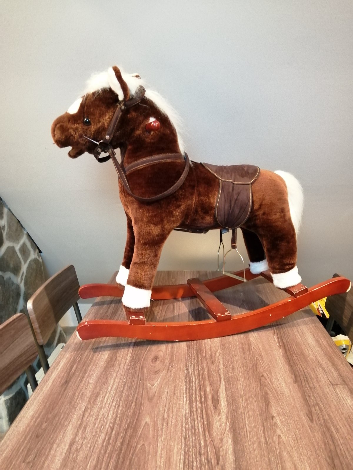 Hpjdací koník, zvuky už nefungujú, drevené kolísanie ma odrvenu farbu. Radosť urobí, aj pekne dotvára interiér.
