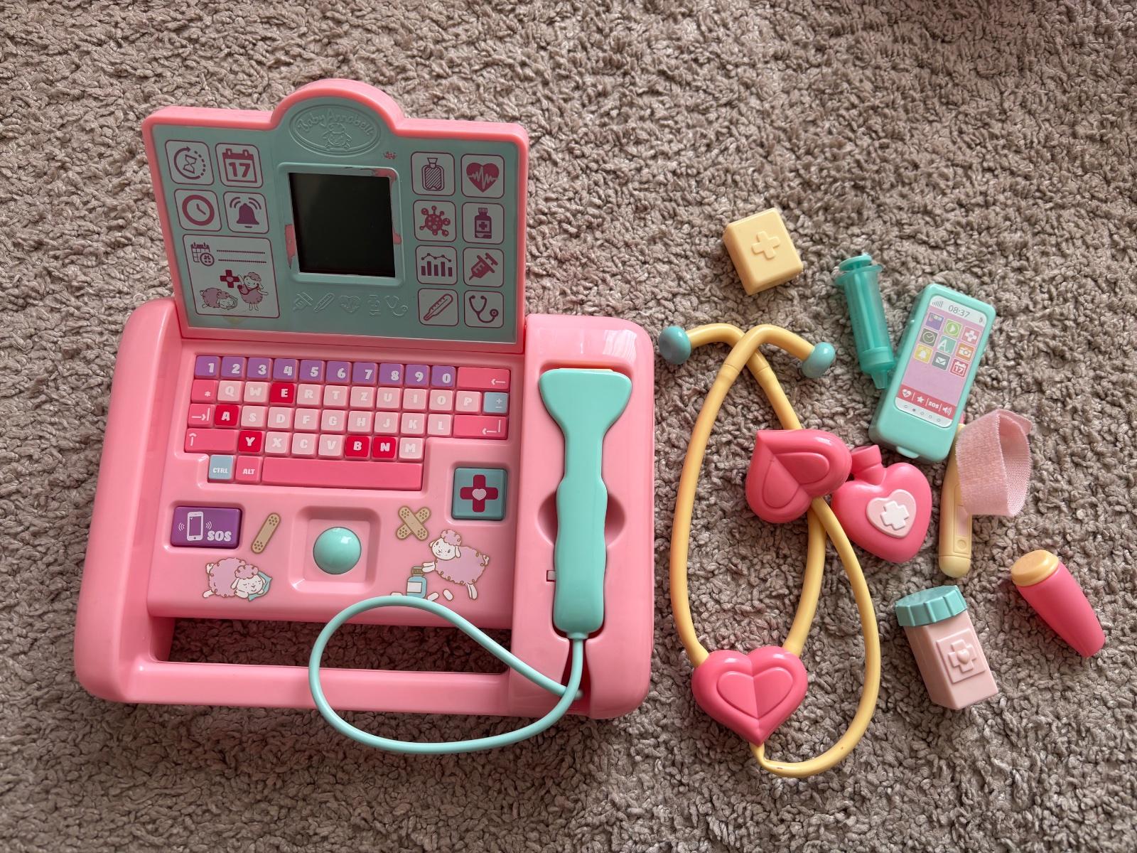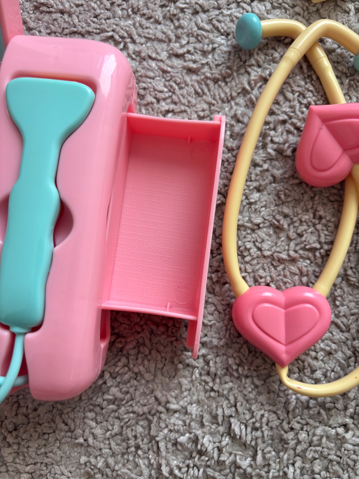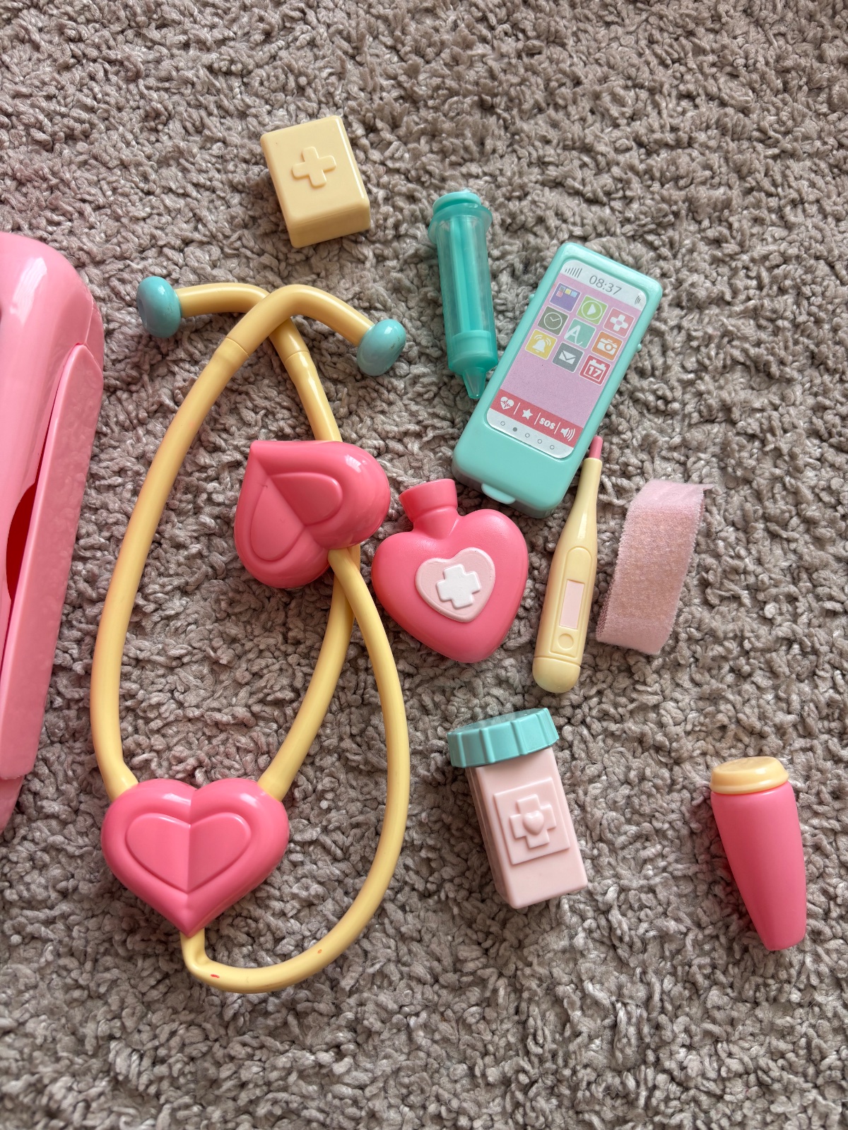 Sem tam je ošúchaná farba, diagnostický prístroj je na baterky a funguje vydáva zvuky, ukáže ako liečiť bábiku, ostatné príslušenstvo len plast