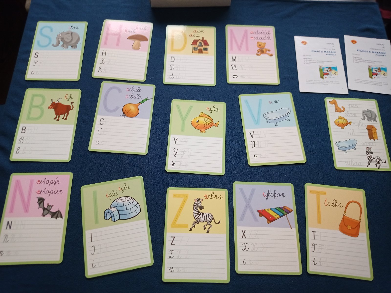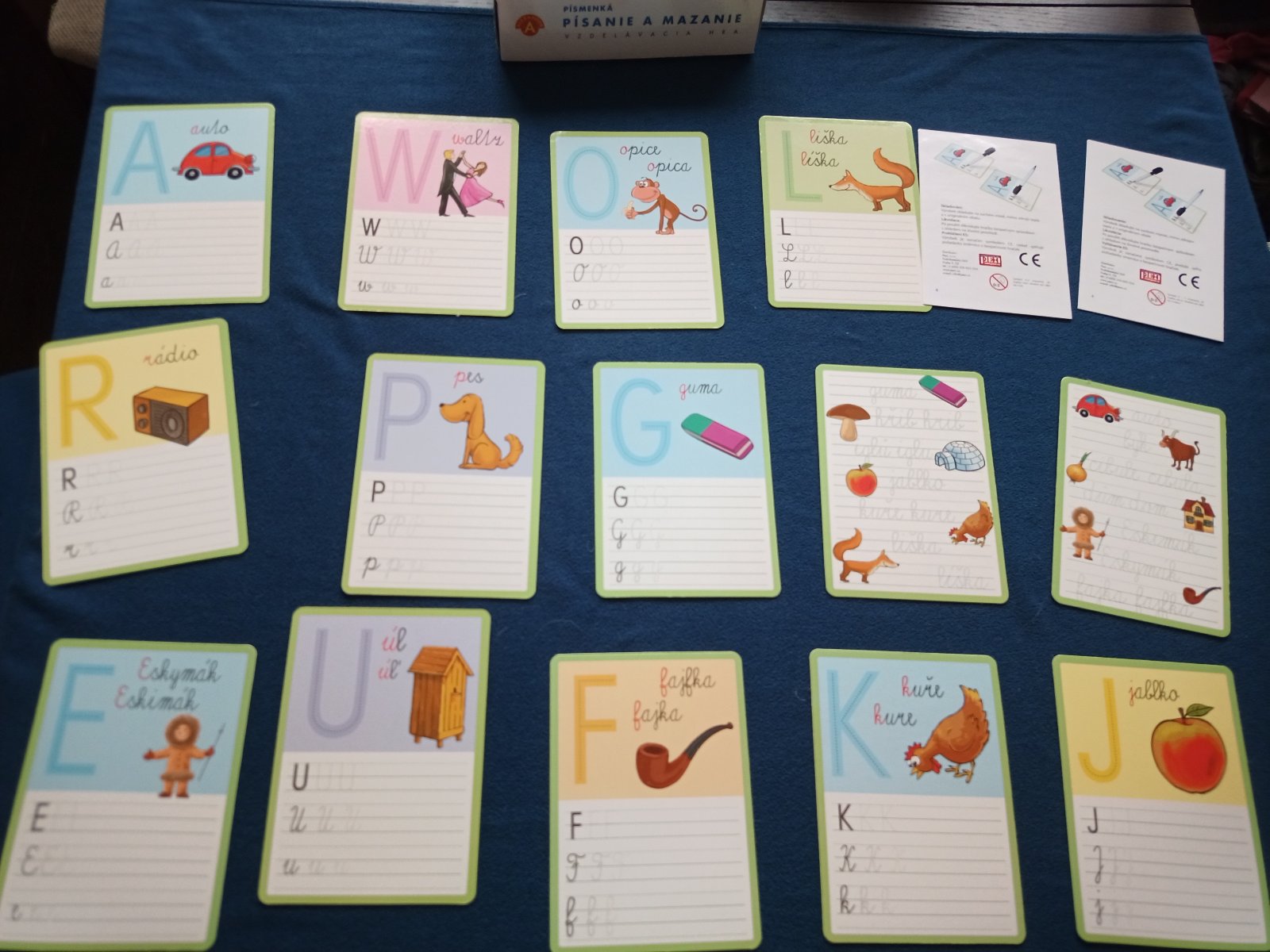Písanie a mazanie, písmenká. Obojstranné kartičky pre nácvik písania písmen. Jazykovo neutrálne, vhodné pre slovenskú aj českú abecedu. Nová fixa so stieracím hrotom. 100 % stav. Vhodné ako darček