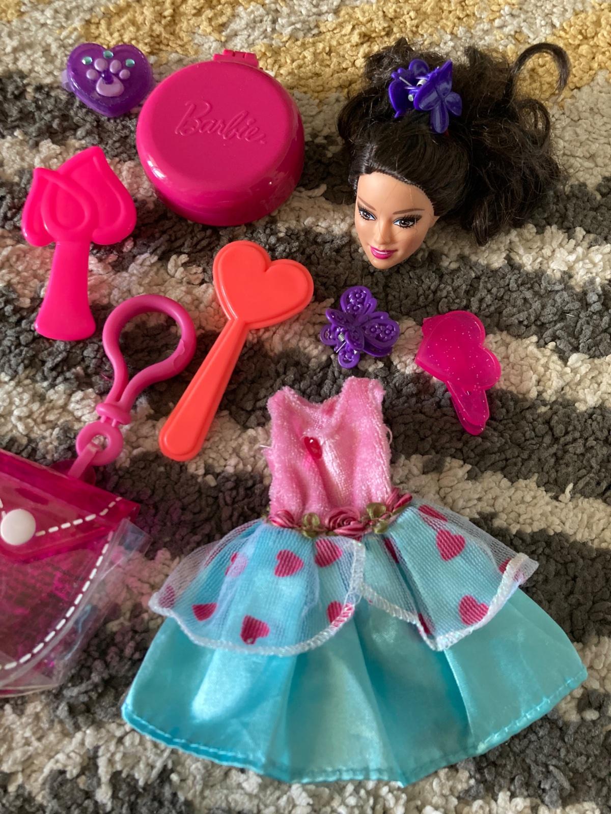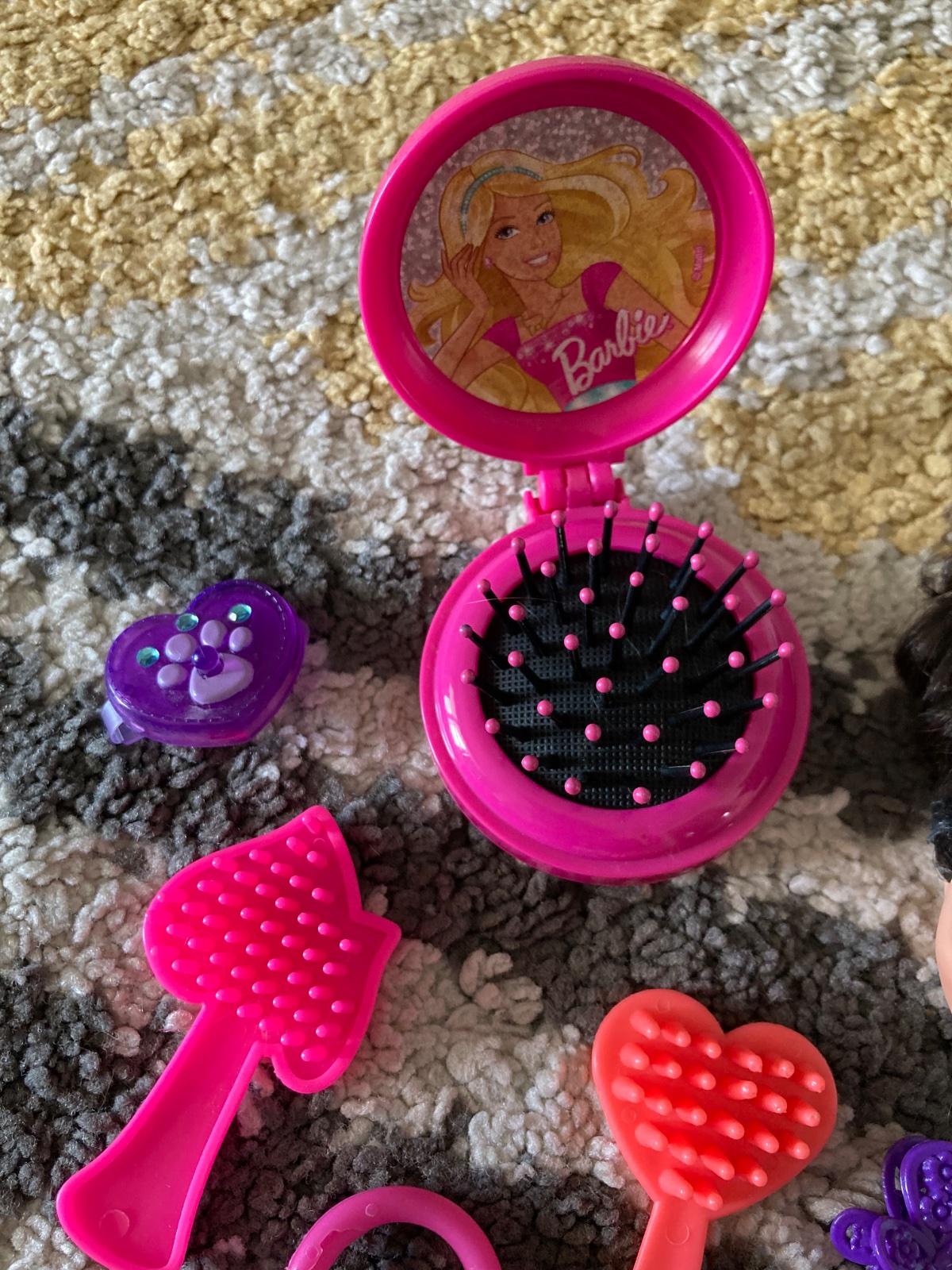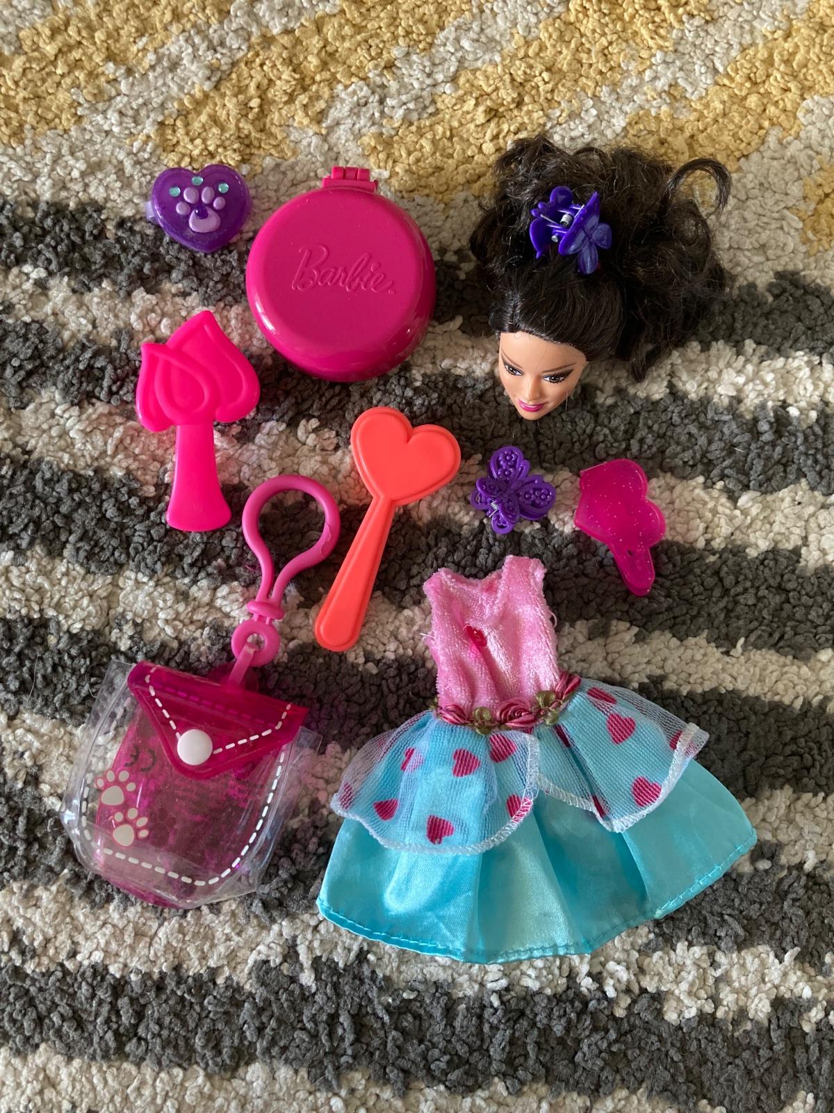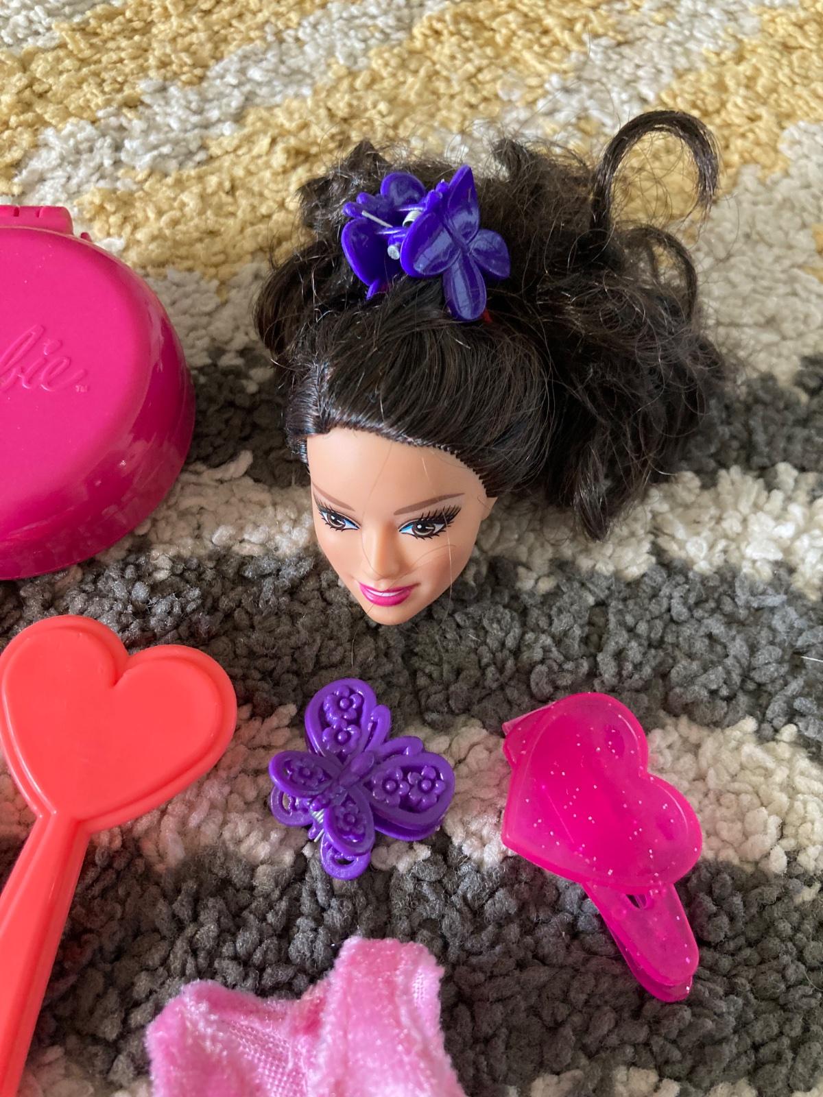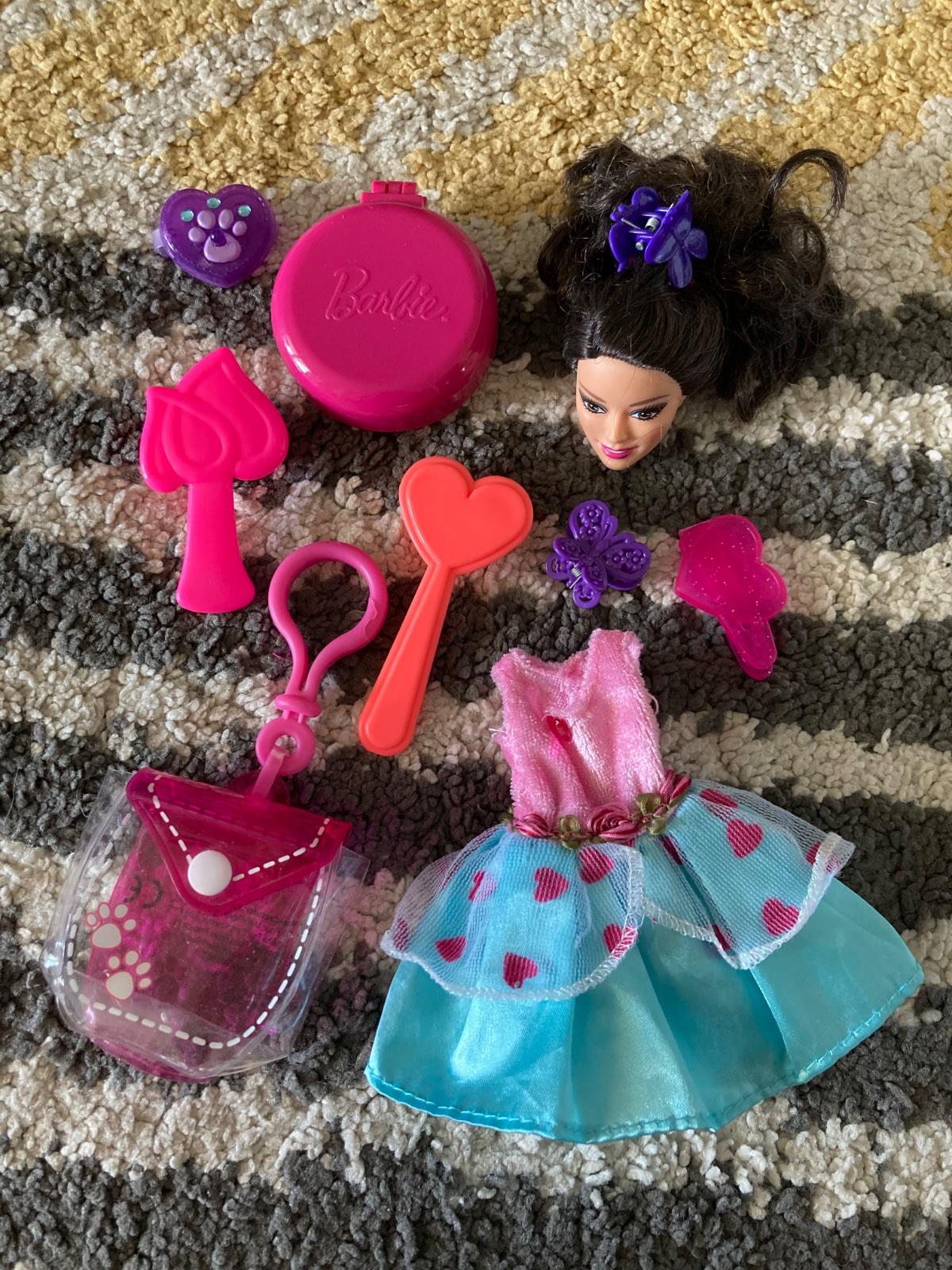 šaty, hlava Barbie na česanie, prívesok na doplnky, kefy na vlasy a sponky
