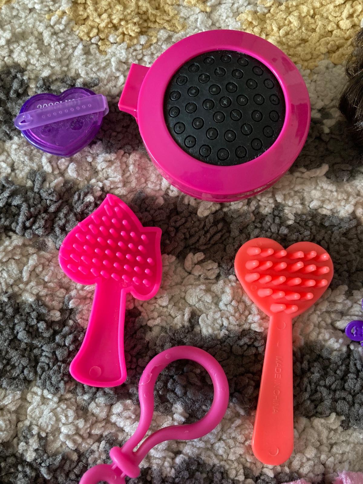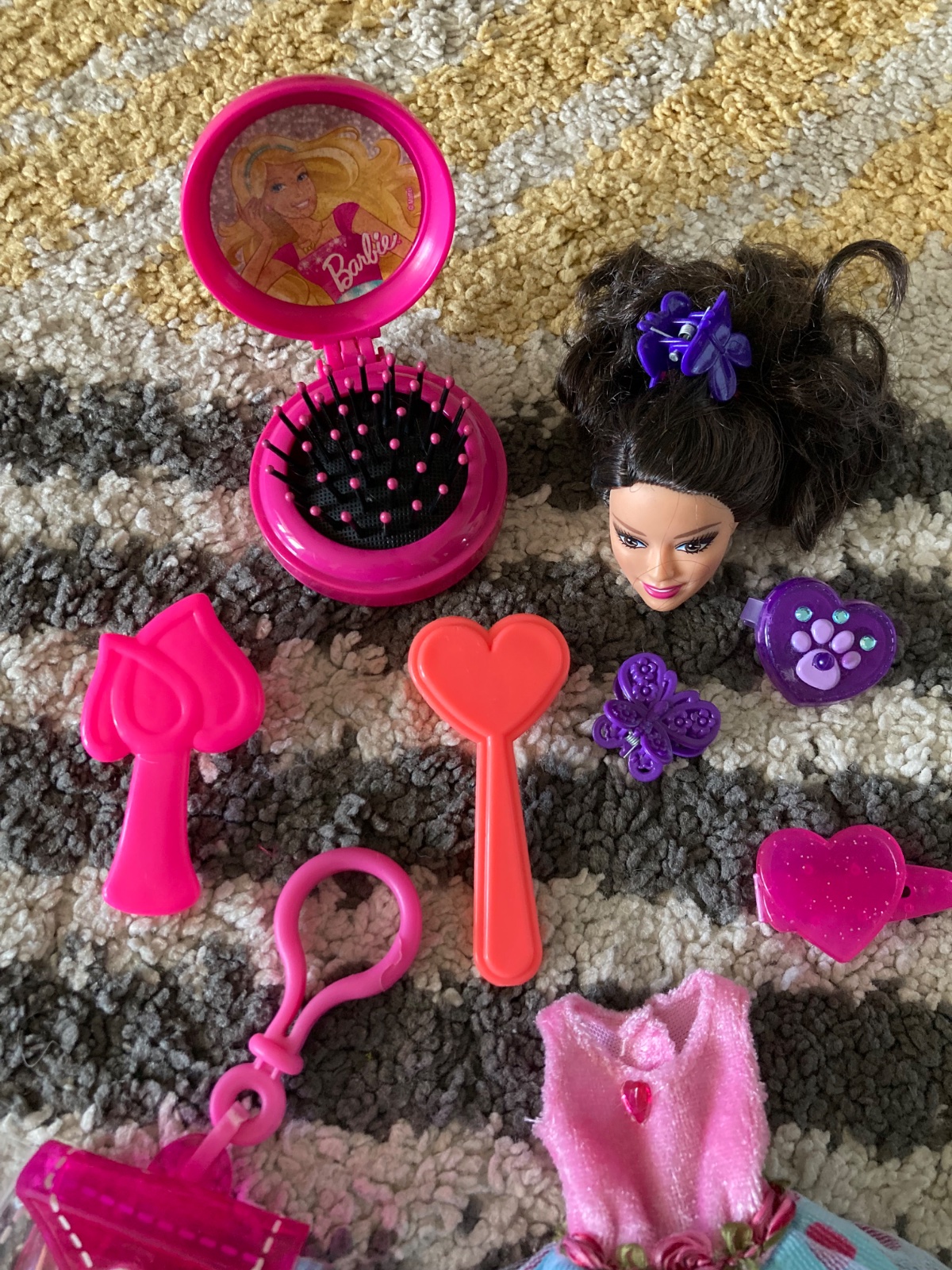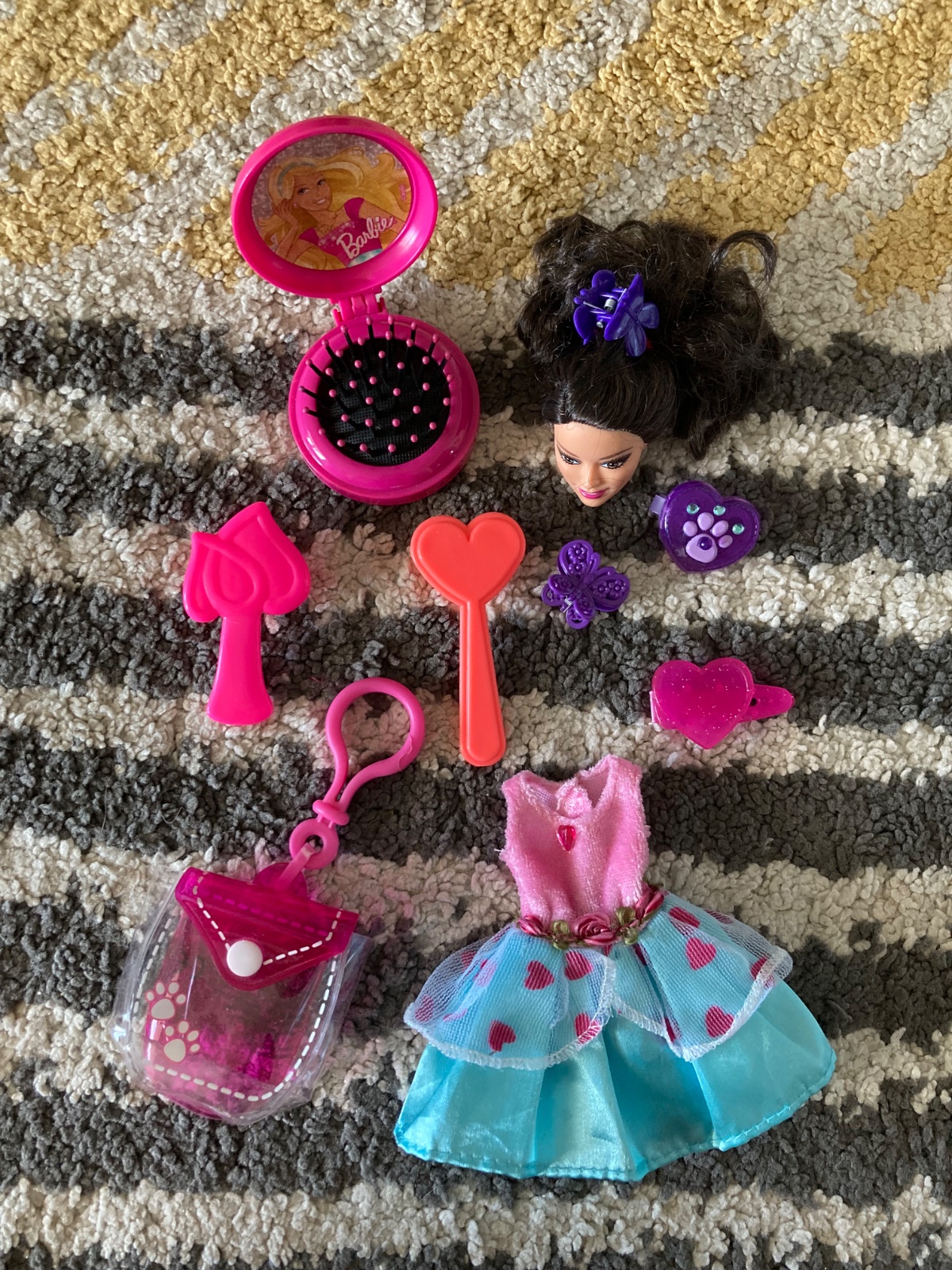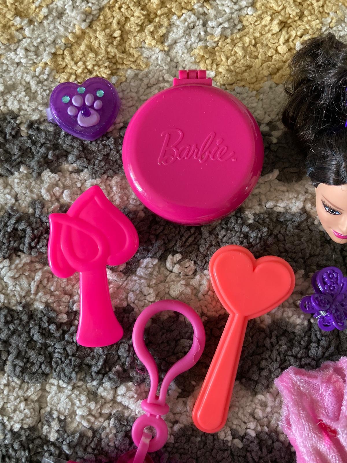 šaty, hlava Barbie na česanie, prívesok na doplnky, kefy na vlasy a sponky