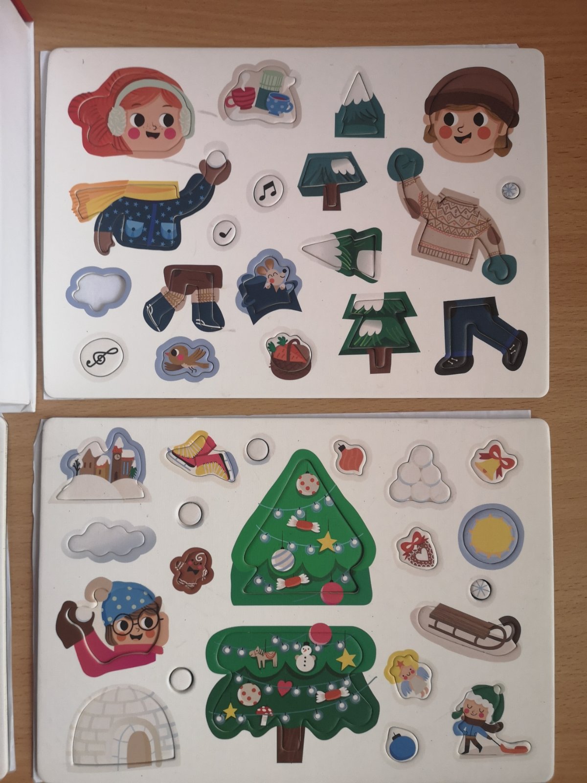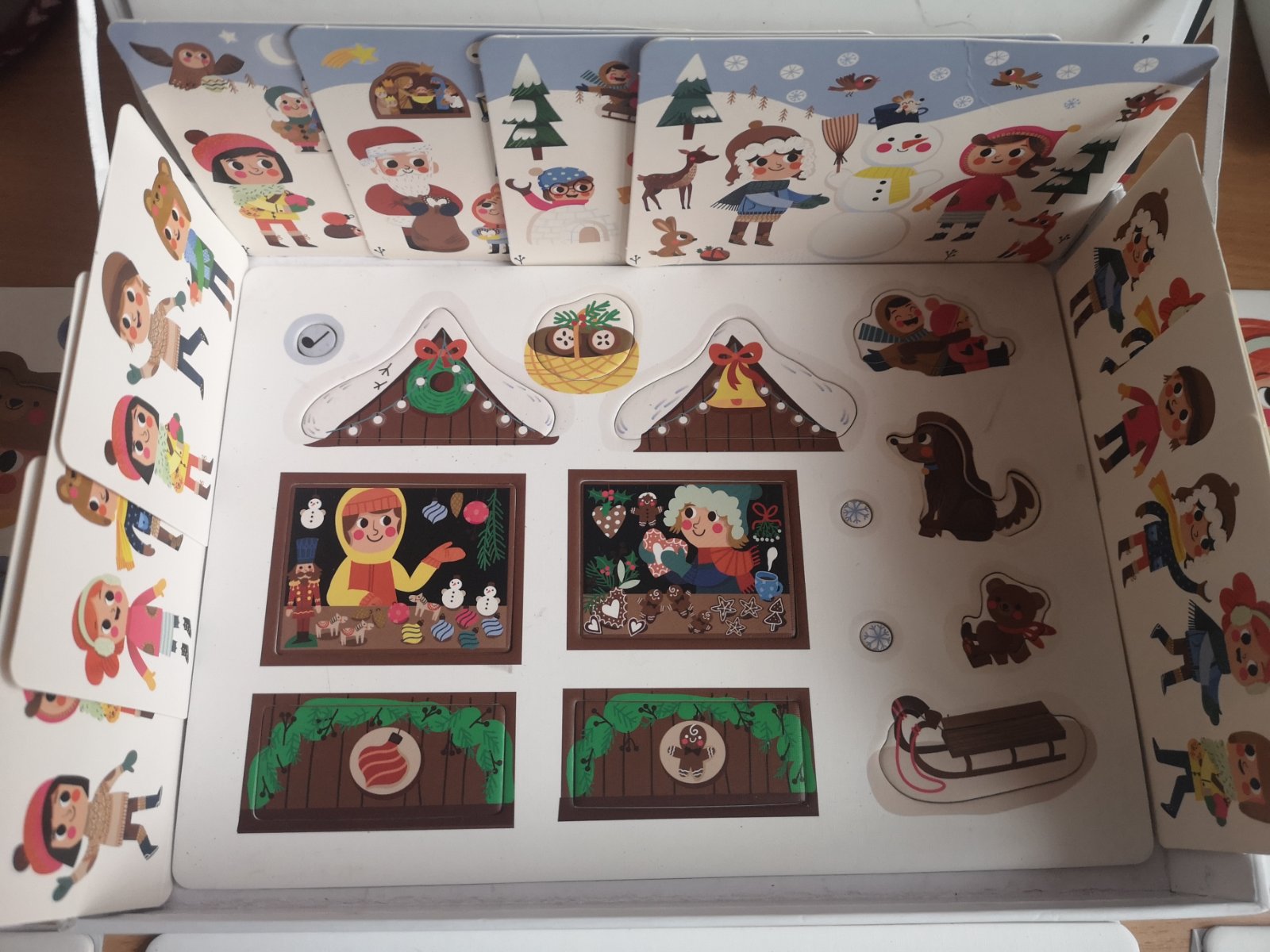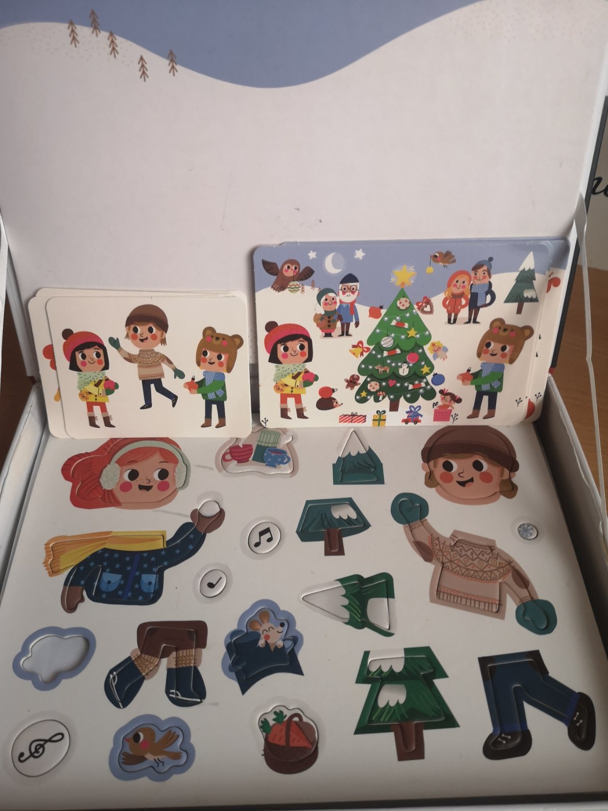 Na výber máte 4 predlohové kartičky, podľa ktorých si môžete z magnetiek postaviť svoju obľúbenú zimnú činnosť (stavanie snehuliaka, guľovačku s kamarátmi), alebo vianočnú činnosť (čakanie na Mikuláša, ozdobovanie stromčeka). Stačí poukladať magnetky na vnútornú (bielu) stranu vrchnáka a môžete si zahrať jeden z príbehov.