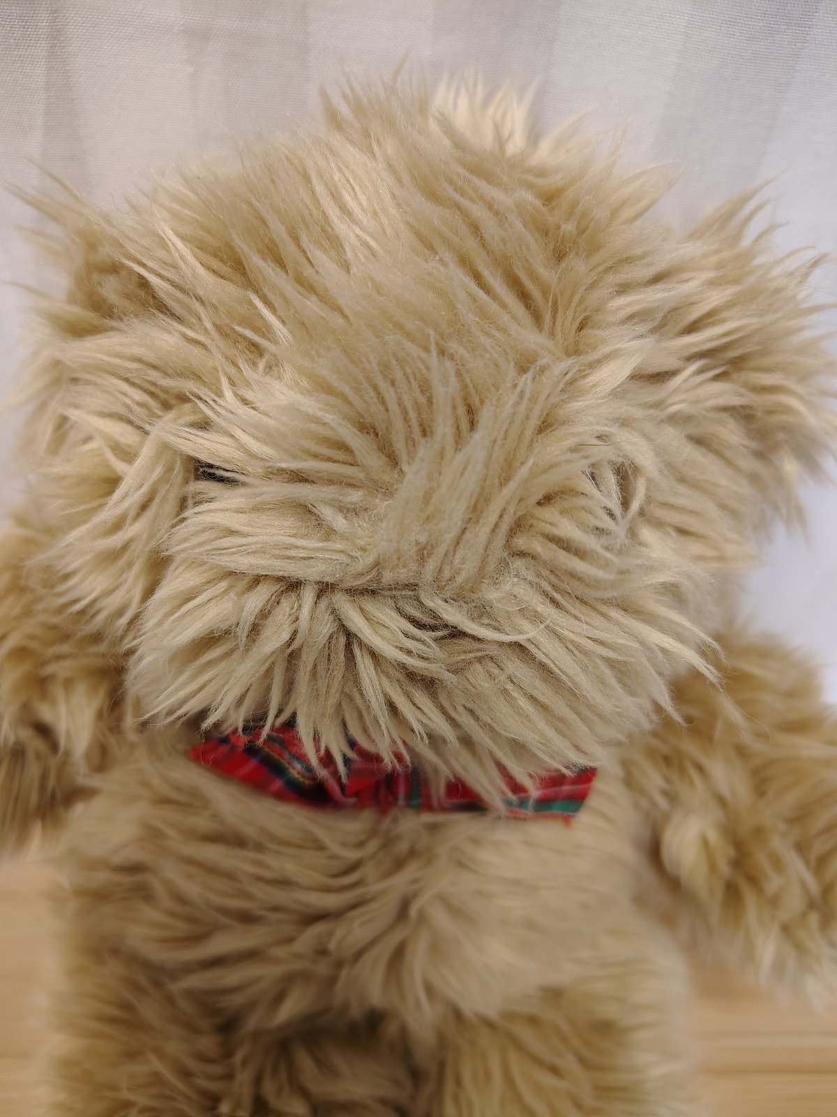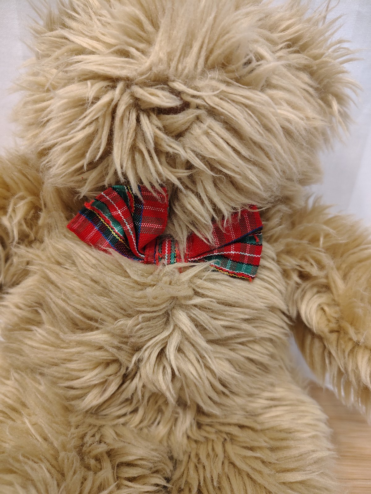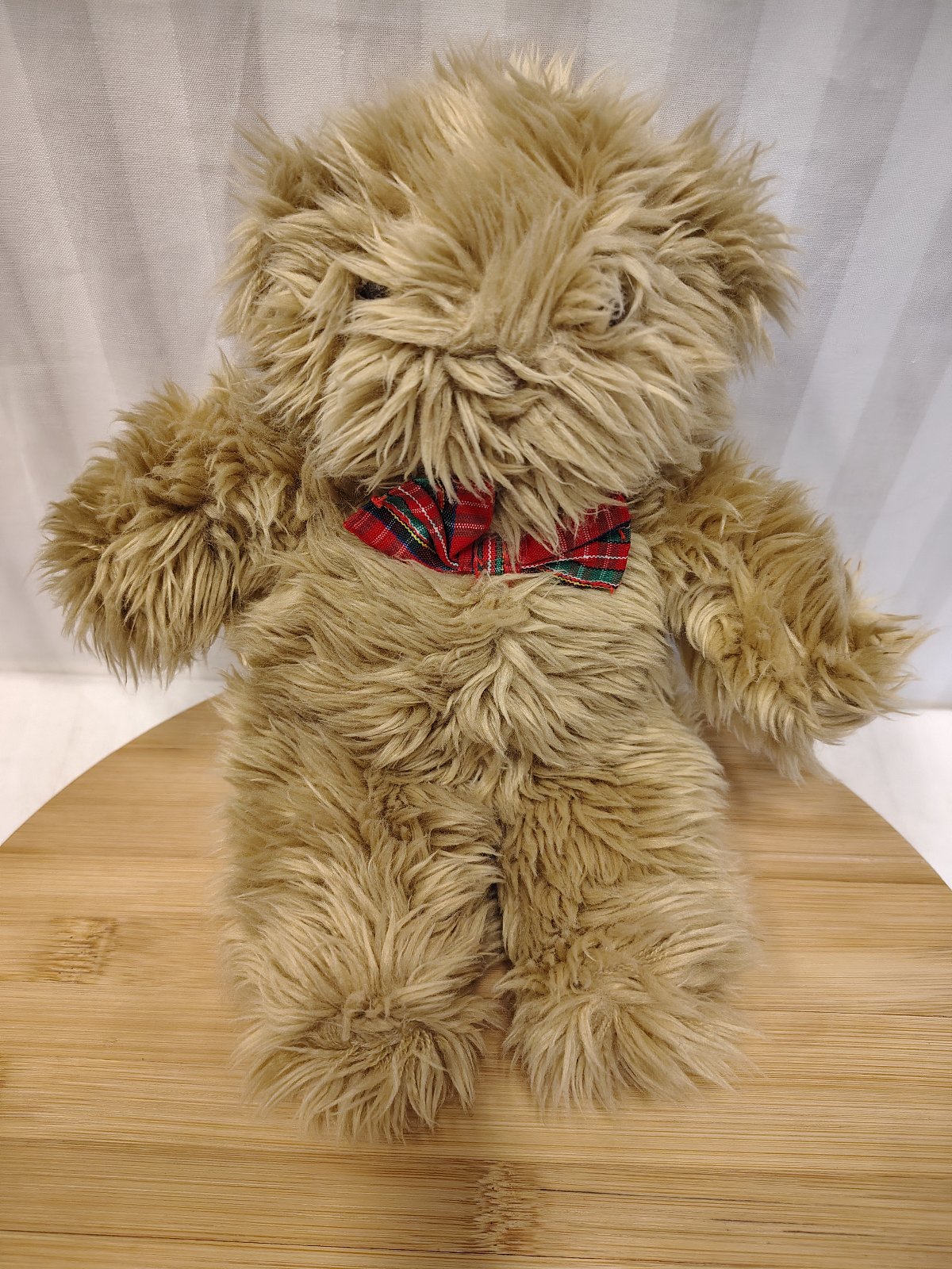 Plyšový chlpatý hnedý medveď s mašlou, M&S, 26 cm, okolo krku má červenú kockovanú mašlu, vyrobený z kvalitného jemného a mäkkého plyšového materiálu,