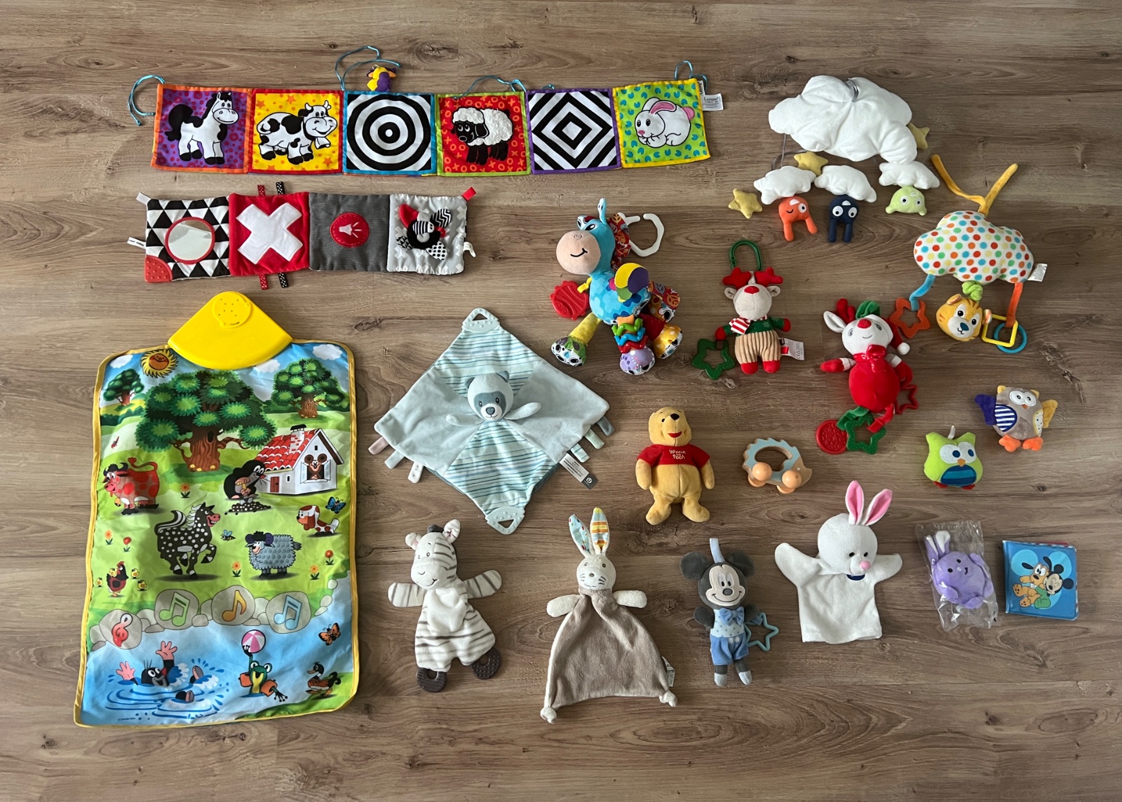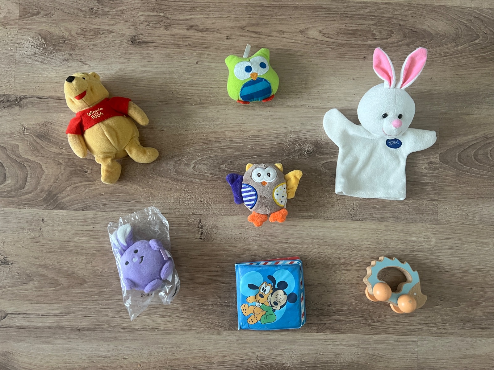 Mix hračiek. Zvuková deka neviem či funguje a jedna závesná hračka čudne hrá 😀 Ináč ostatné hračky pekný stav. Playgro závesná hračka zebra, mini sovičky, zajko ktorému šuštia ušká a zebra, modrá Minie a iné.