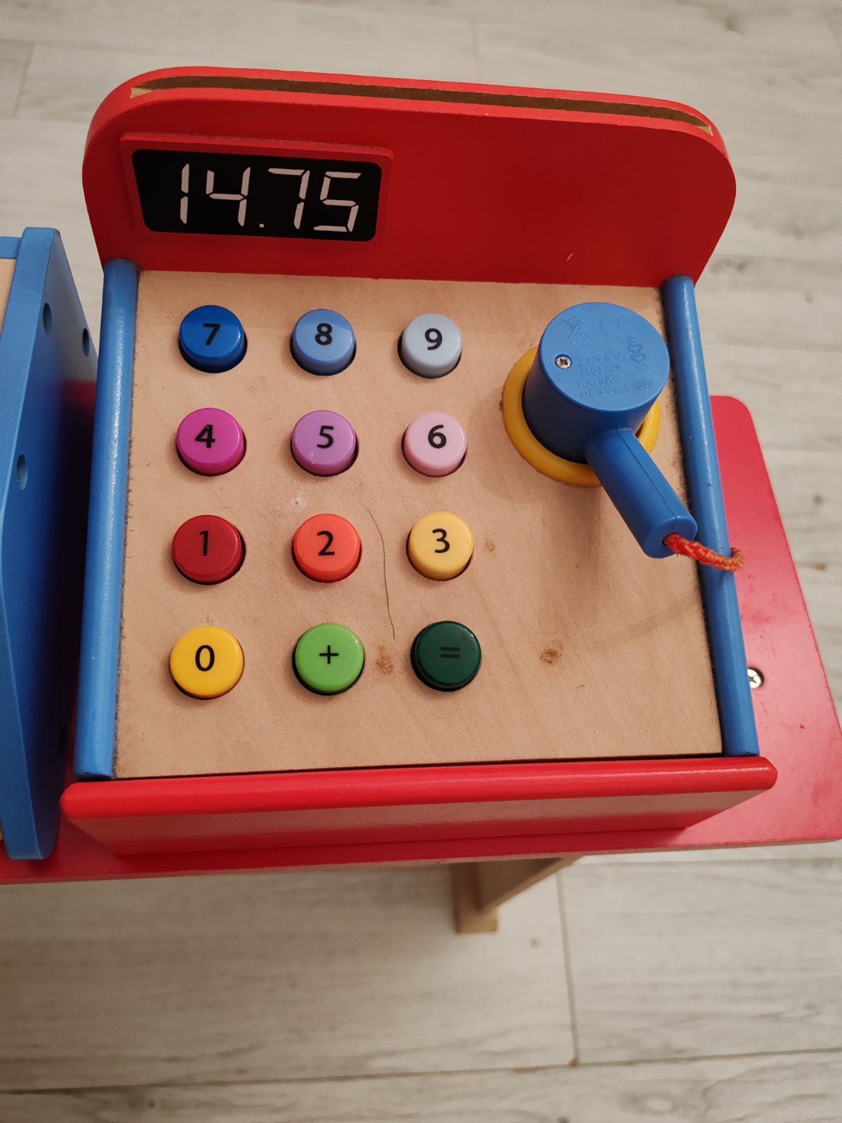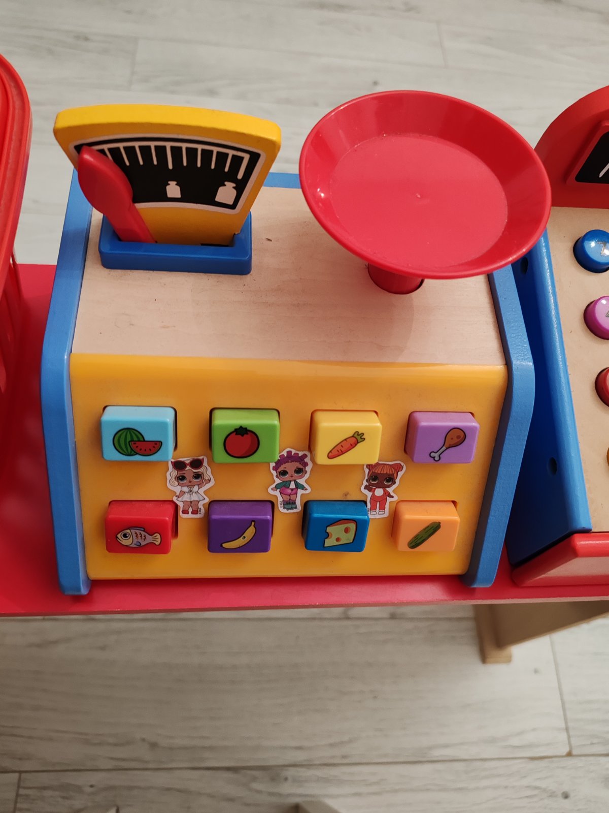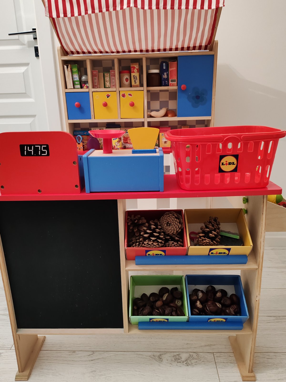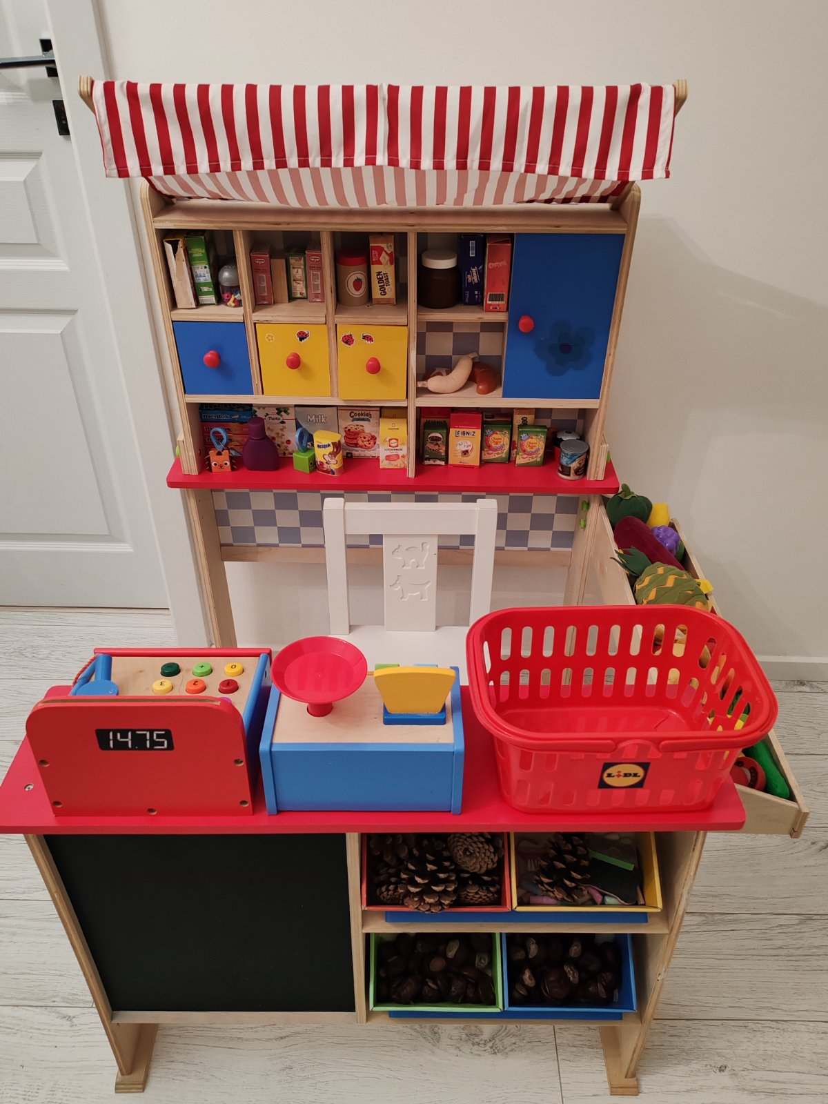 Predám detský drevený obchod na hranie spolu s príslušenstvom. Množstvo rôzneho tovaru na predaj, drevená váha a kasa, nákupný košík (tieto neboli súčasťou obchodu, všetko sa dokupovalo). Obchod je nepoškodený.