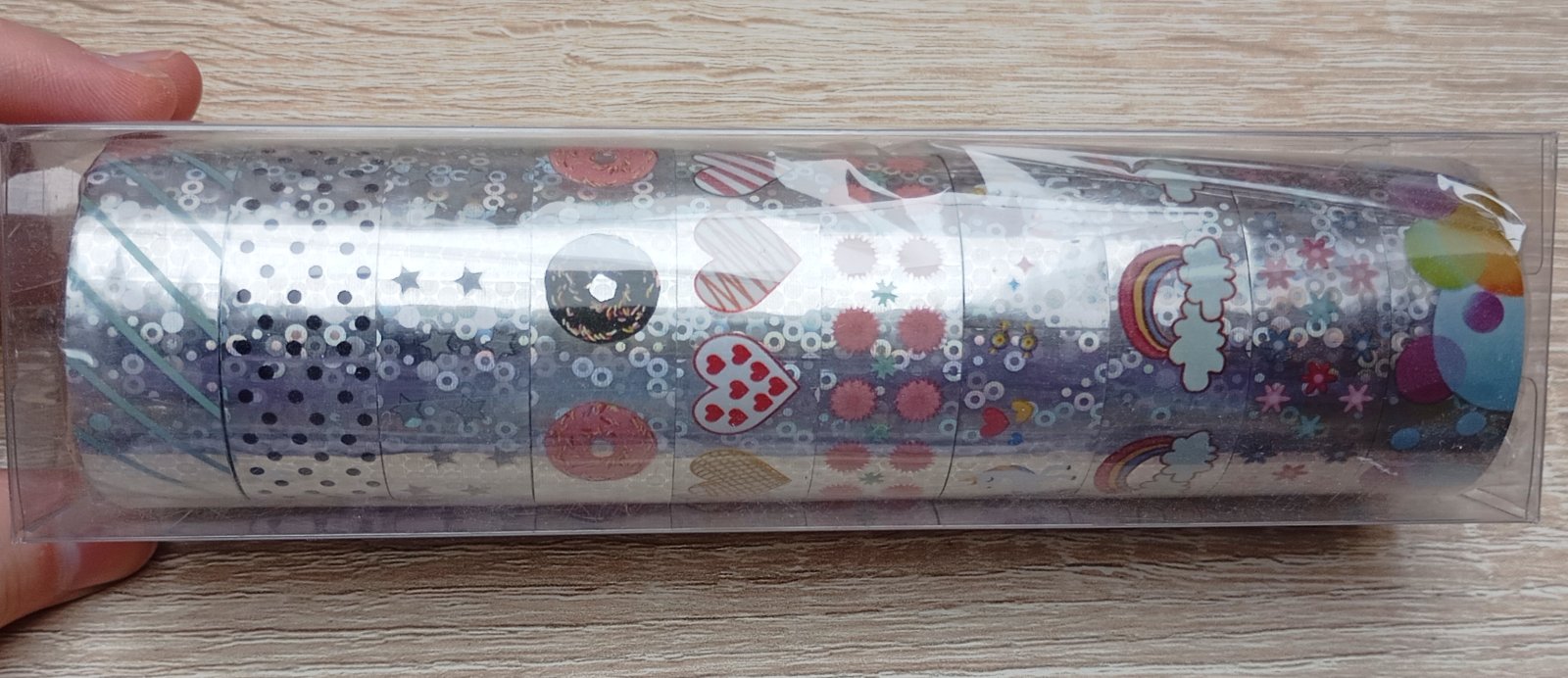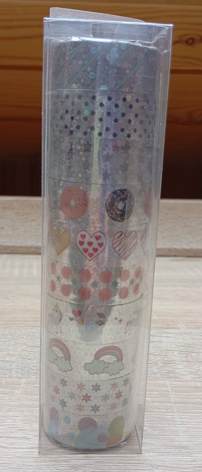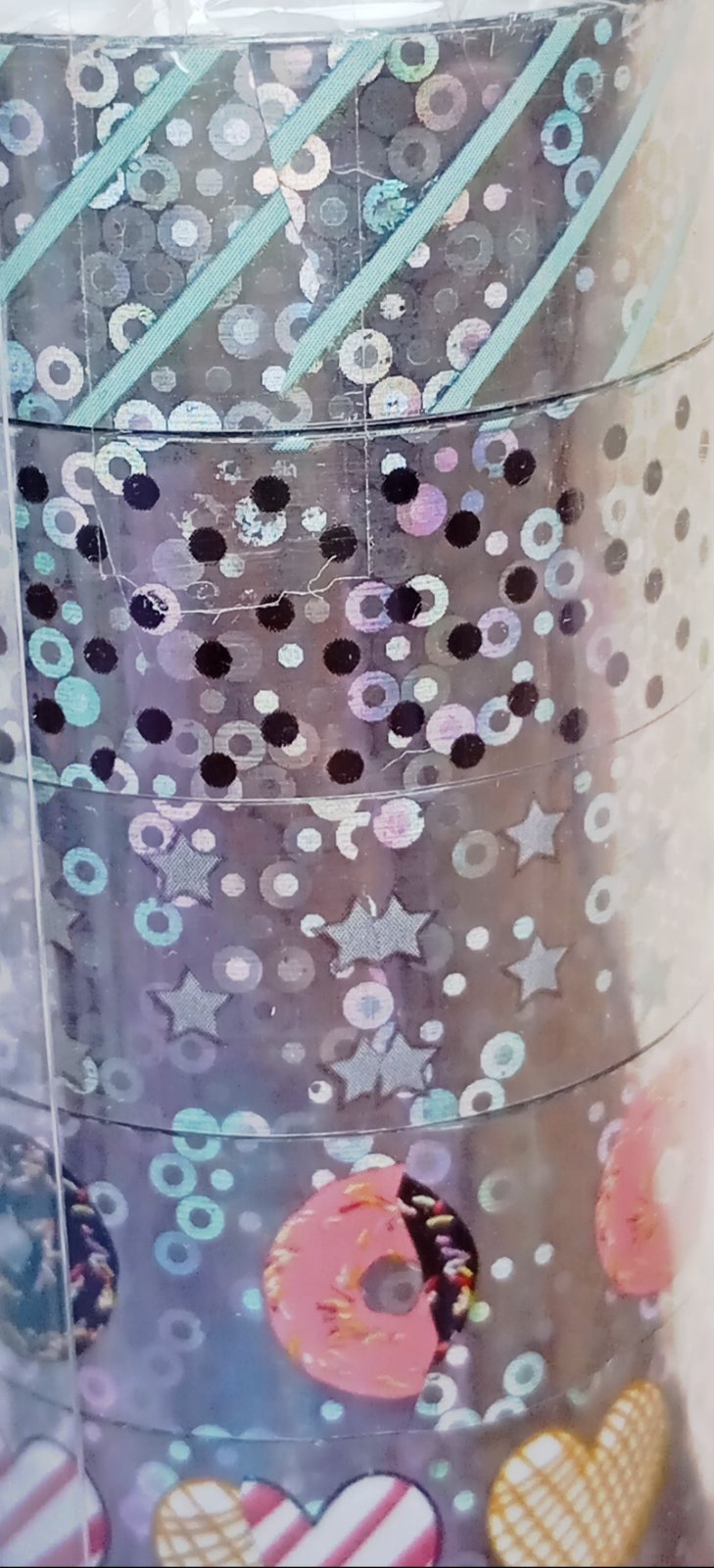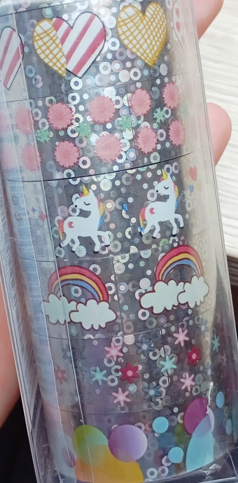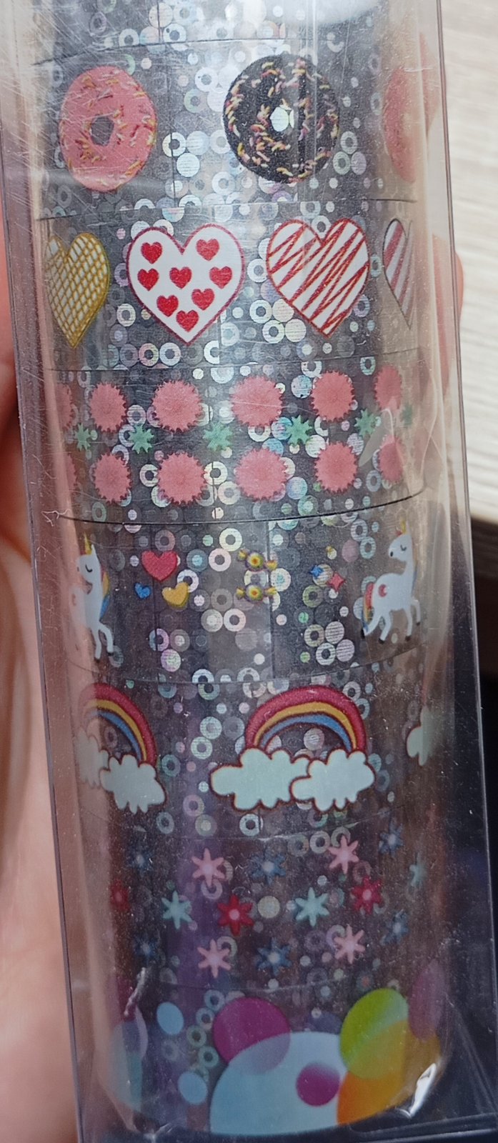Všetky pásky majú lesklý holografický metalický základ striebornej farby, na ktorom sú rôzne veselé vzory ako jednorožce, dúhy, srdiečka, donuty, hviezdy, kvietky a viac.