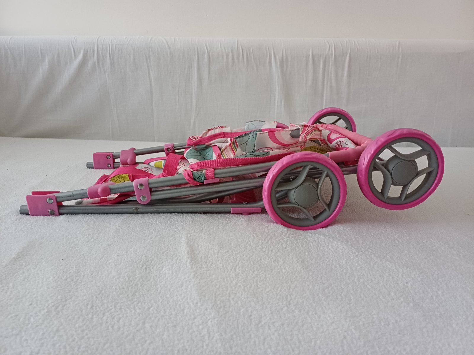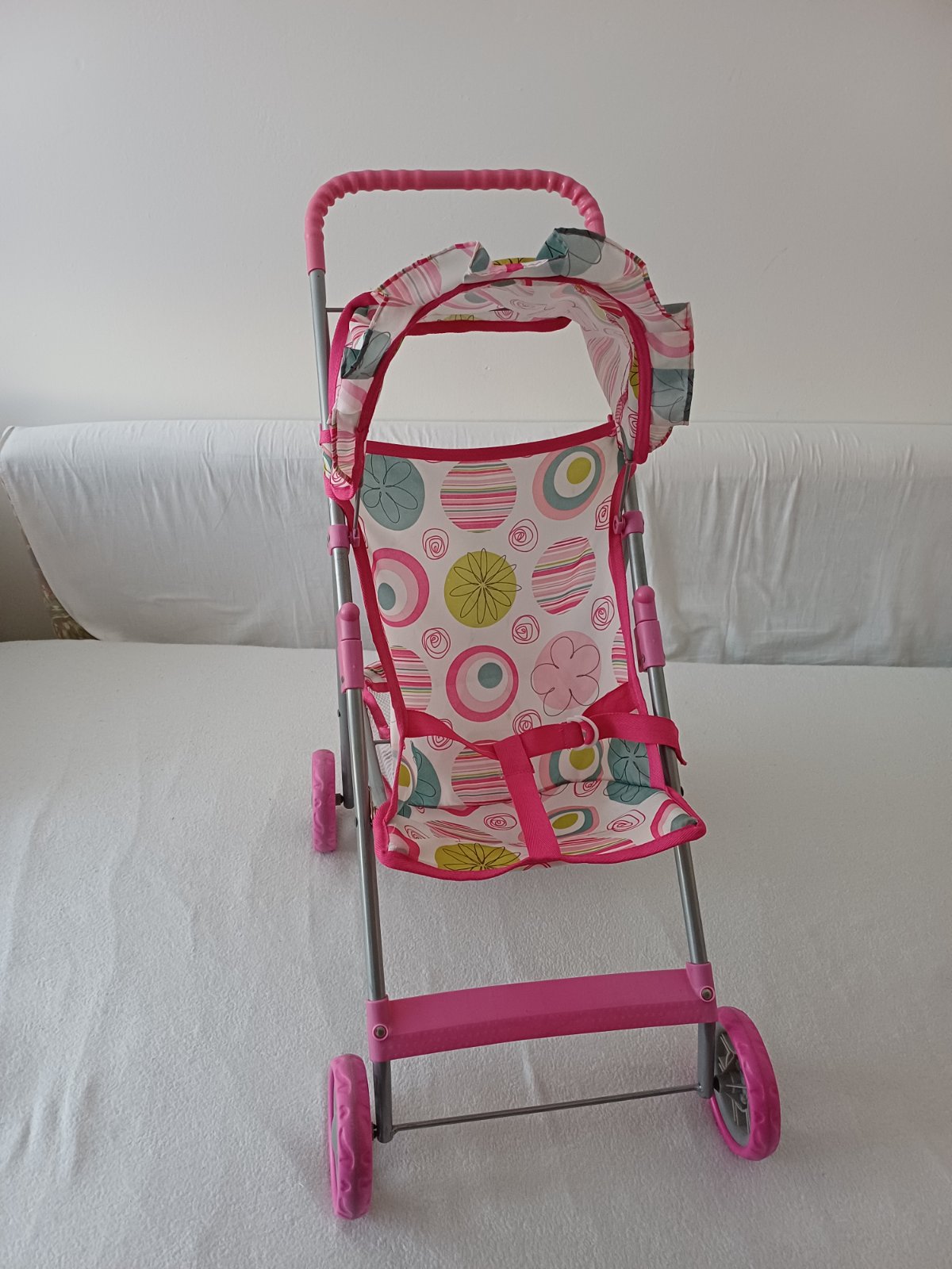 Krásny, kvalitný a veľmi zachovalý kočík pre bábiky. Je vhodný pre deti cca 3-4 ročné. Výška rukoväte 50cm.