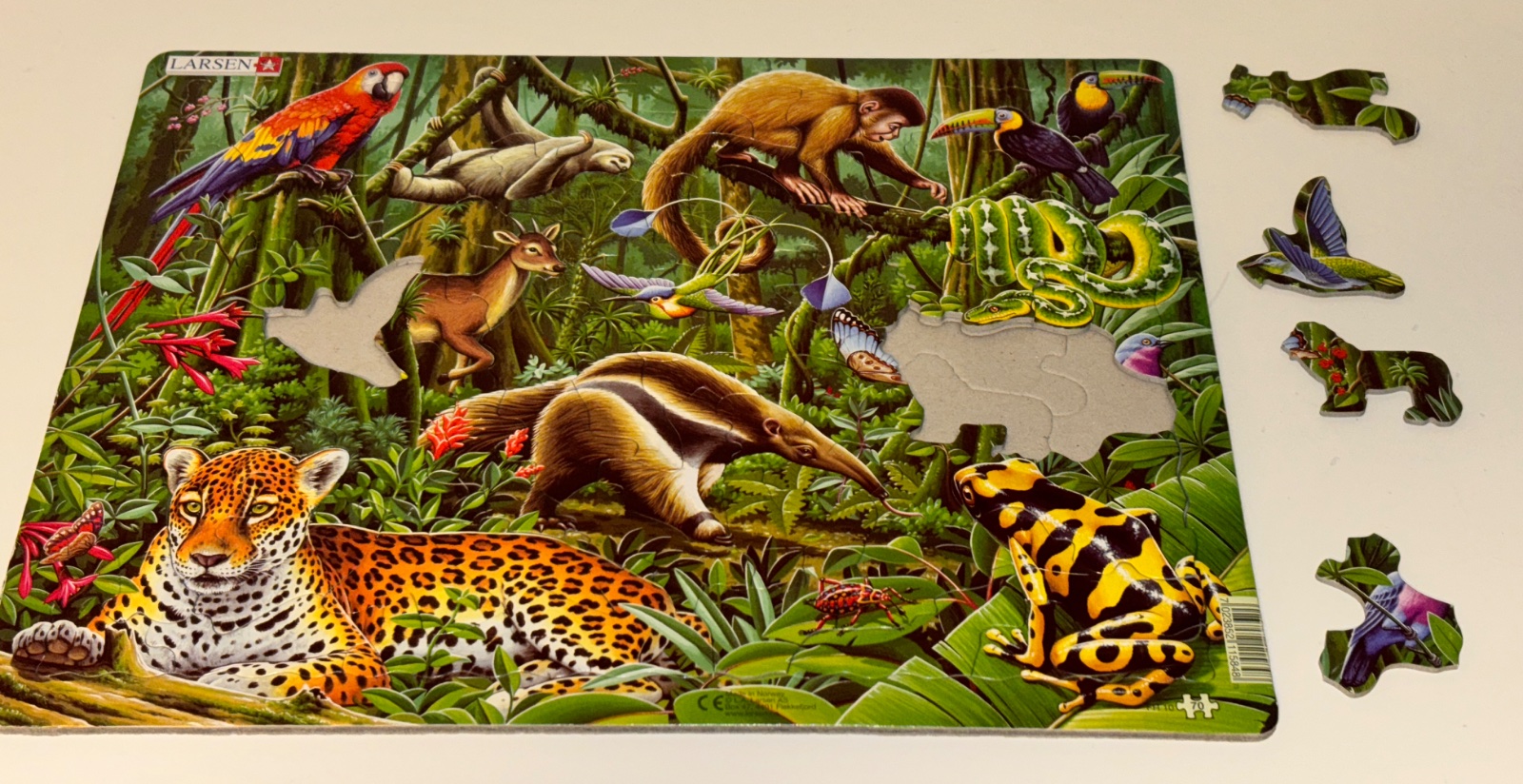 Krásne puzzle so zvieratami z dažďového pralesa značky Larsen, kazdý kúsok iného tvaru. Rozmer 36x28 cm.
