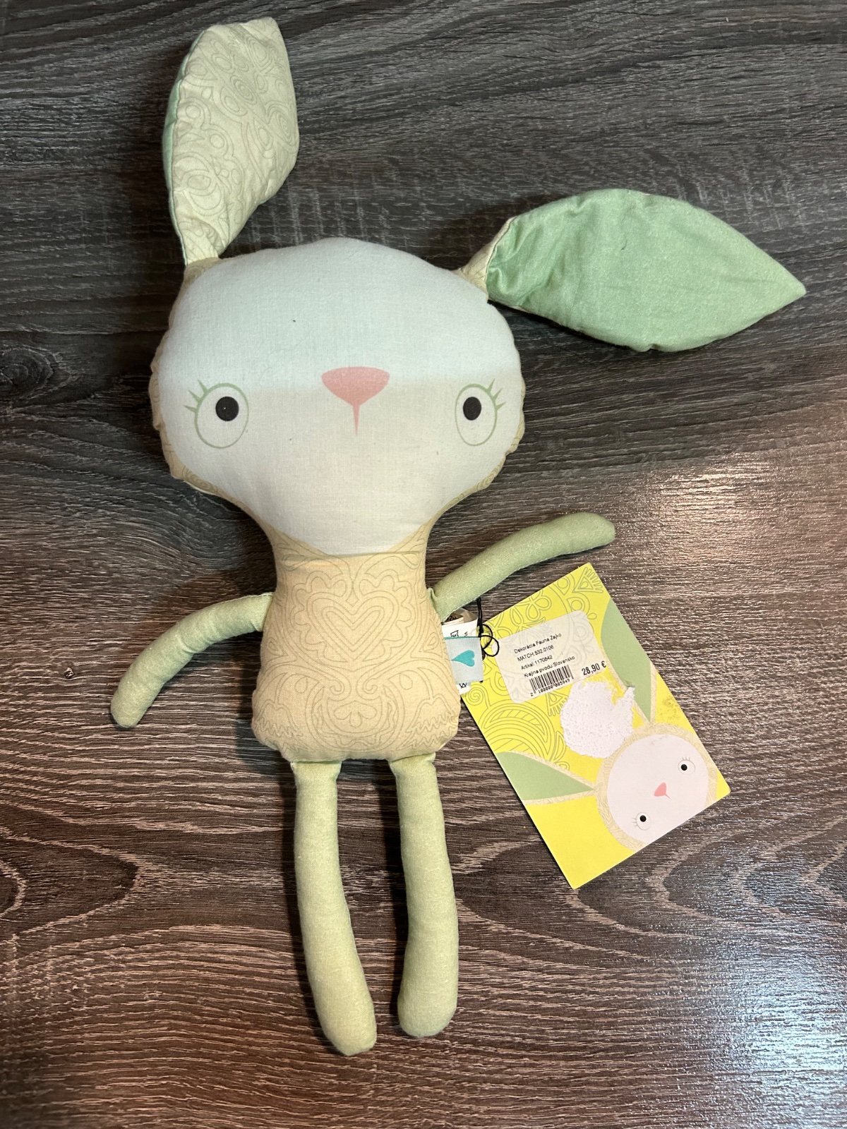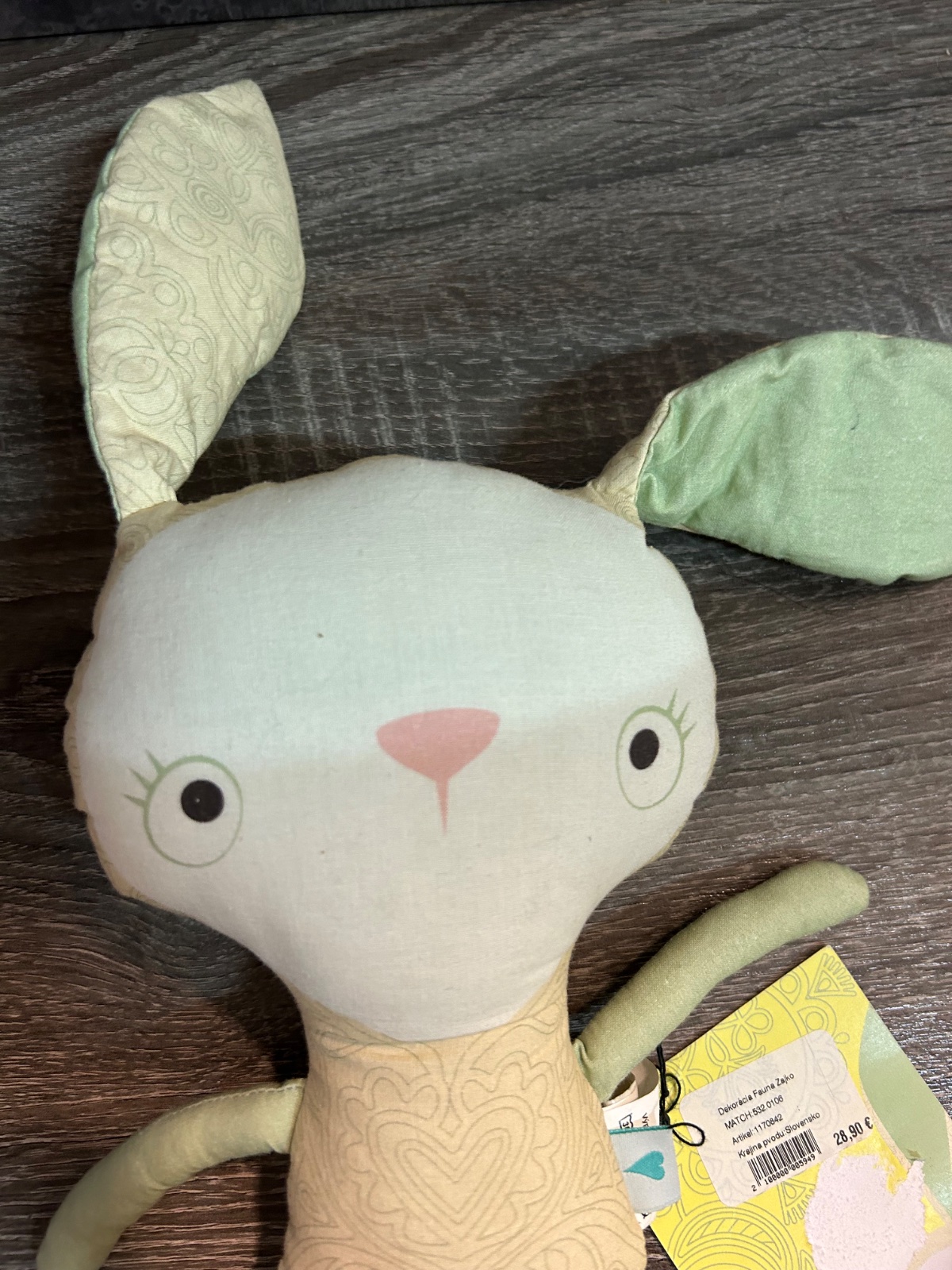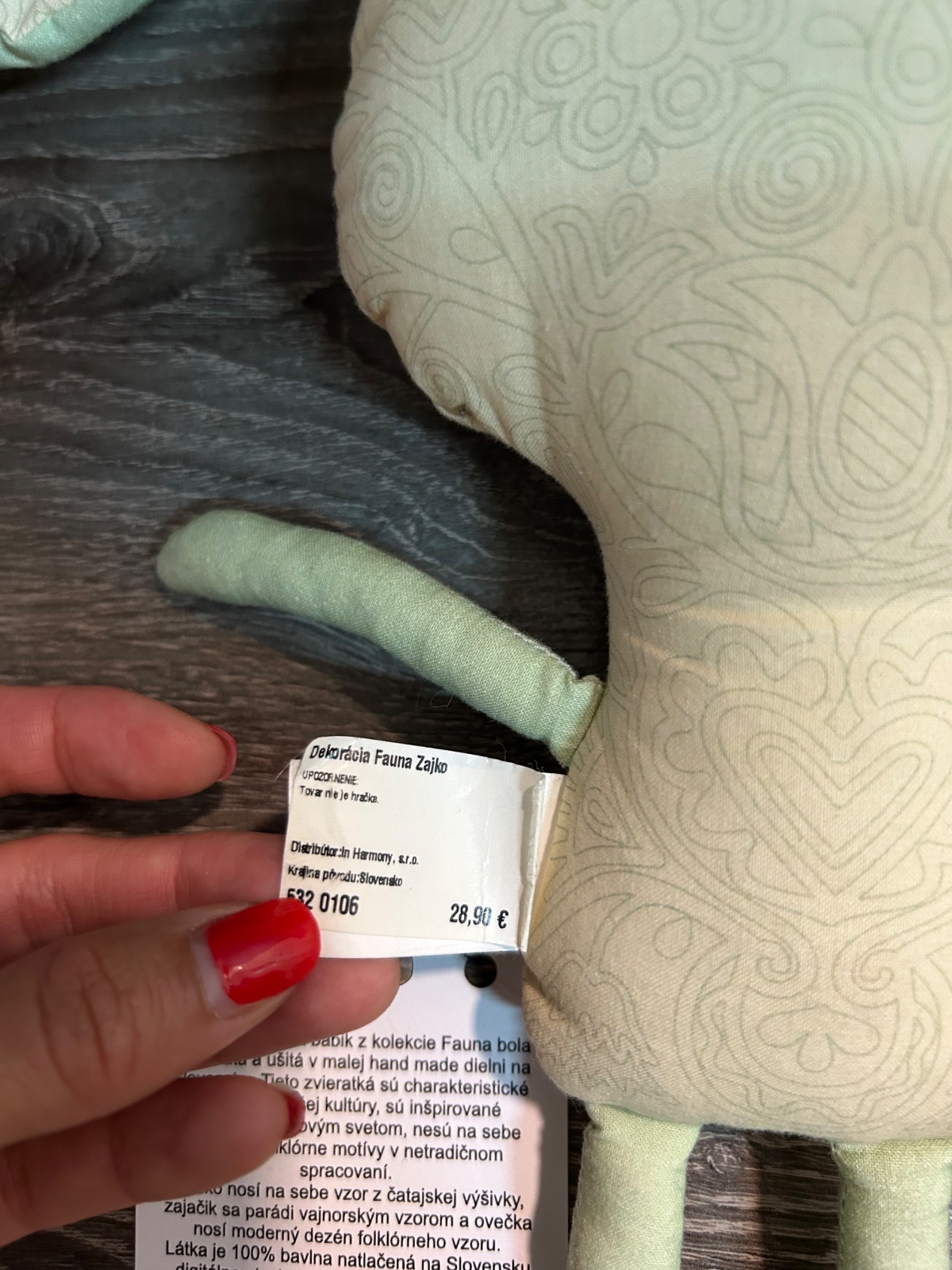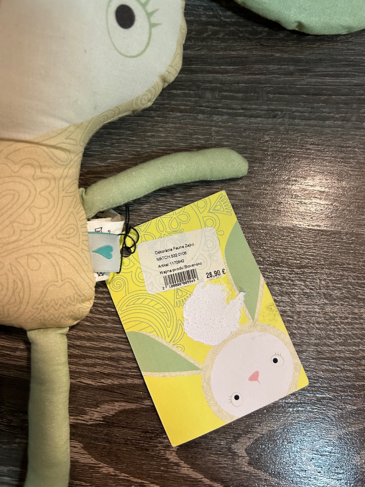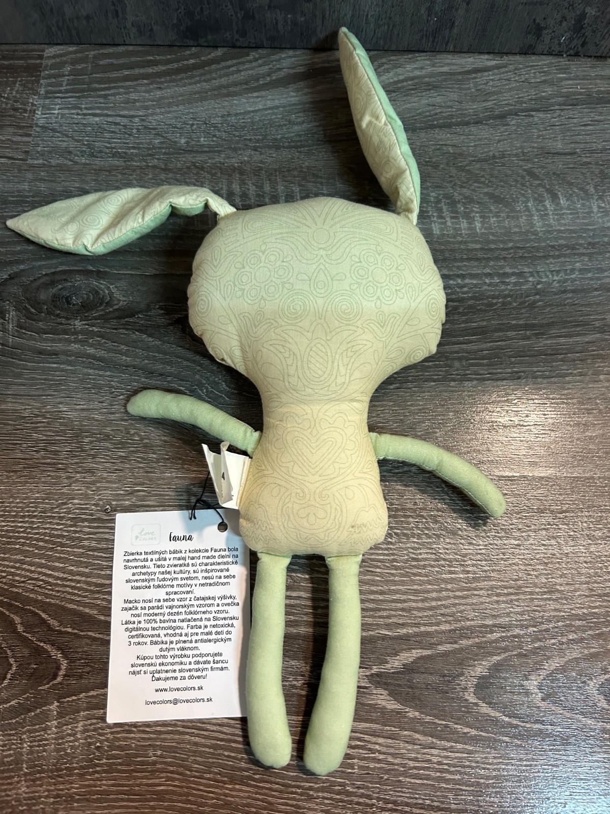 19p6k.Tento zeleno béžový zajko s dlhými ušami a tenkými nožičkami a ručičkami musel byť náš. Je z dielne šikovnej Julky, ktorá tvorí nádherné veci pod značkou Love Colors by Julianna Rencés Kovács. Zvieratko je zo série Fauna a telíčko má potlačené vzorom z vajnorskej výšivky.