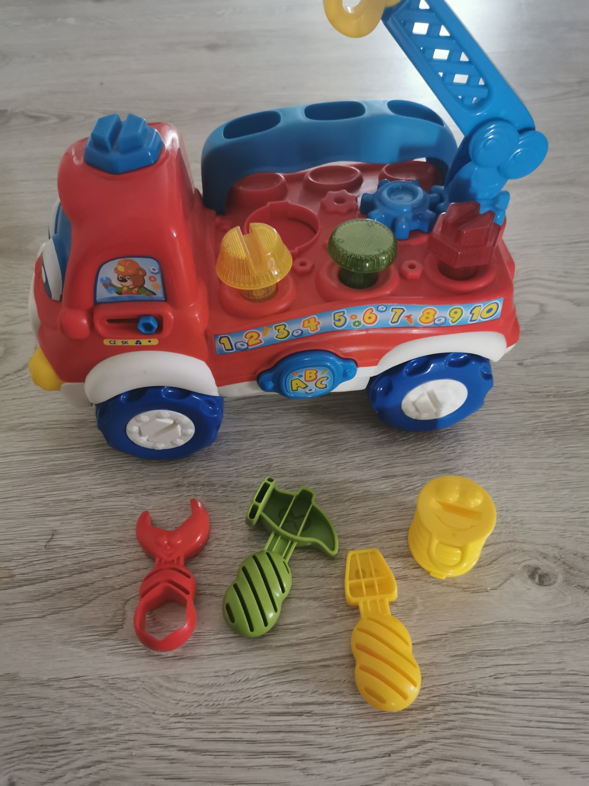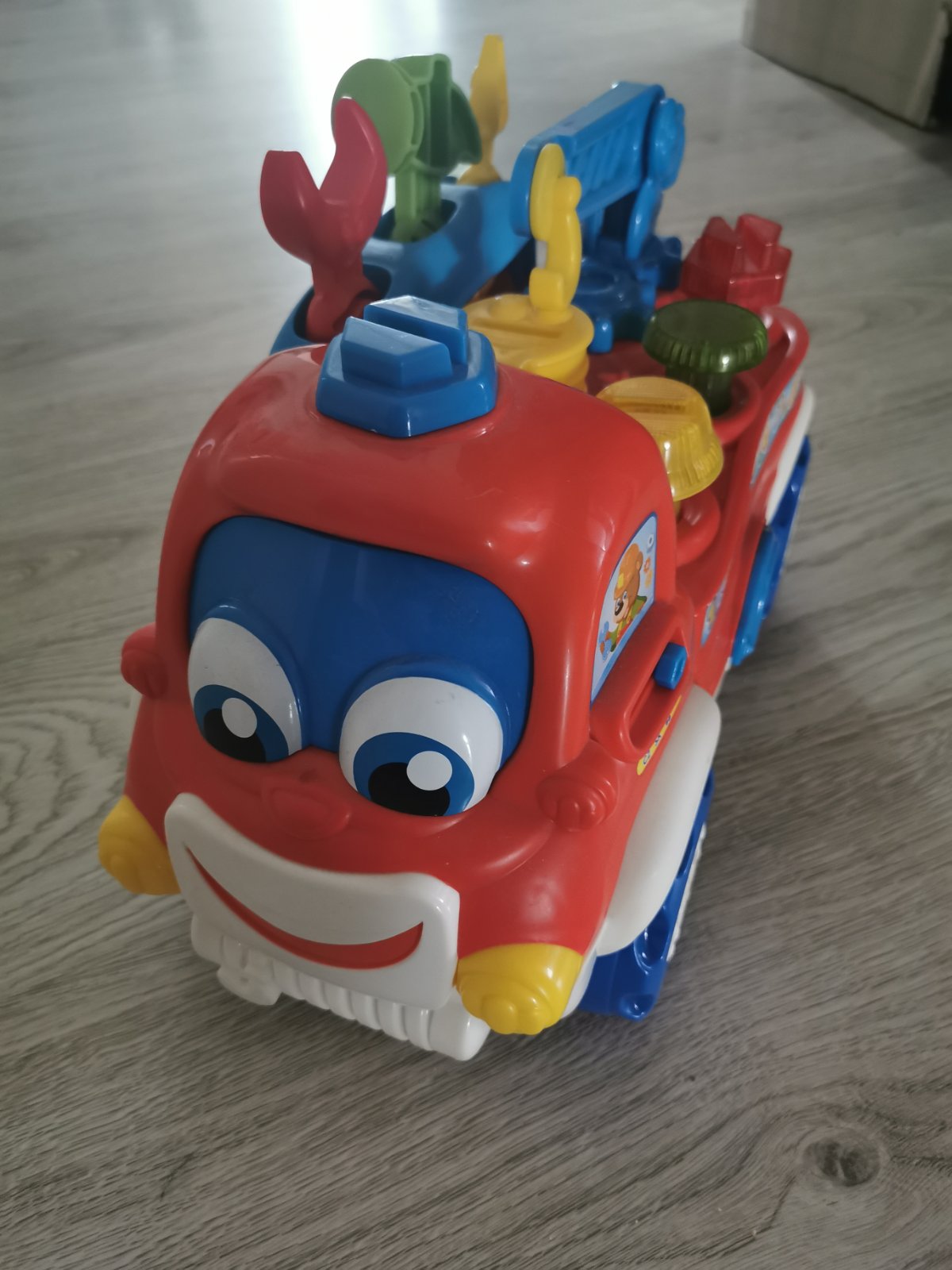 Autíčko, ktoré má aj žeriav na zdvihnutie nákladu, je k nemu aj náradie, ktoré sa dá vybrať a použiť. Auto má rôzne melódie, svieti, rôzne gombíky na stlačenie. Má aj český aj slovenský jazyk, dá sa prepínať. Funguje na batérie. PC bola 29€. Málo hrané, vhodné aj ako darček.V