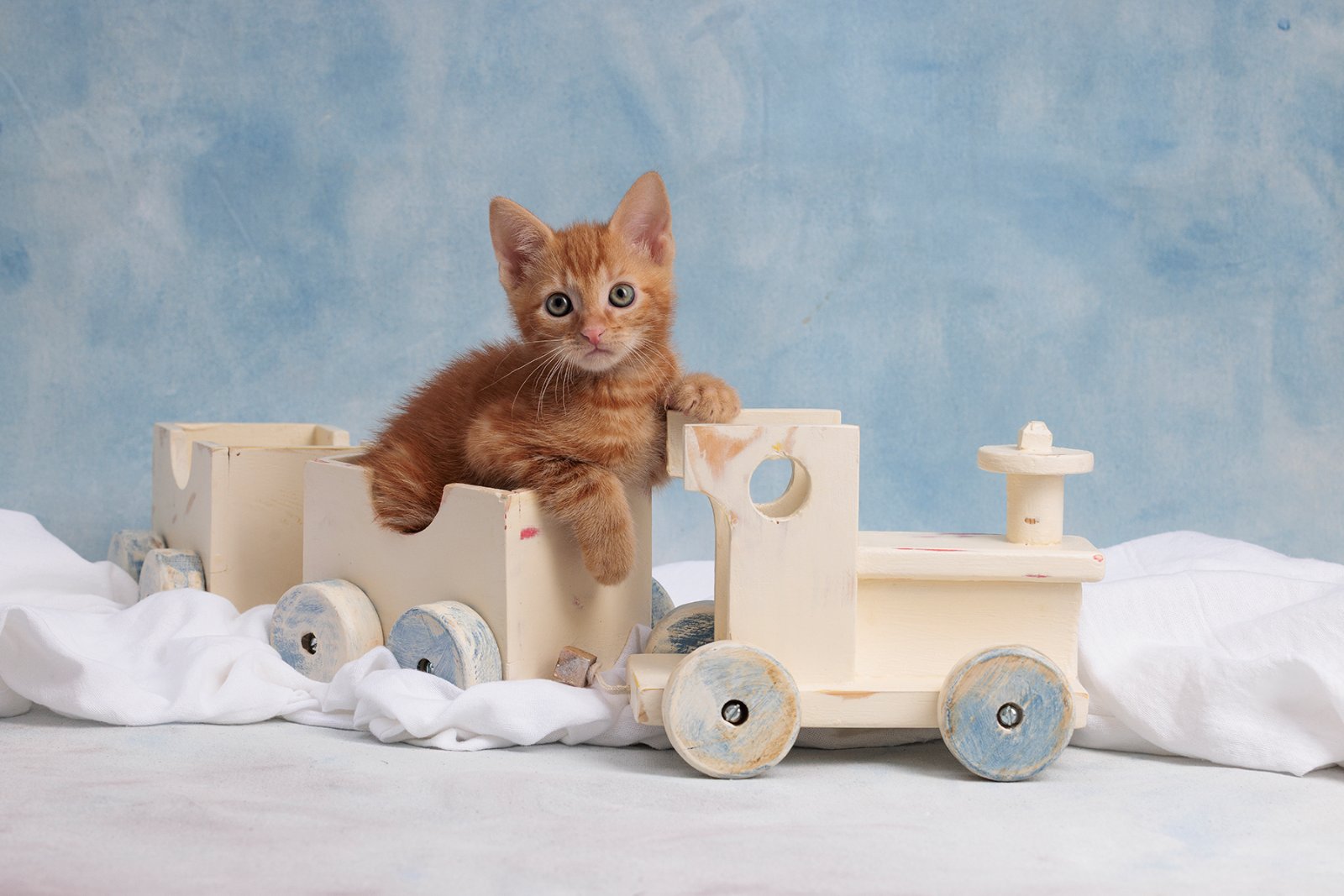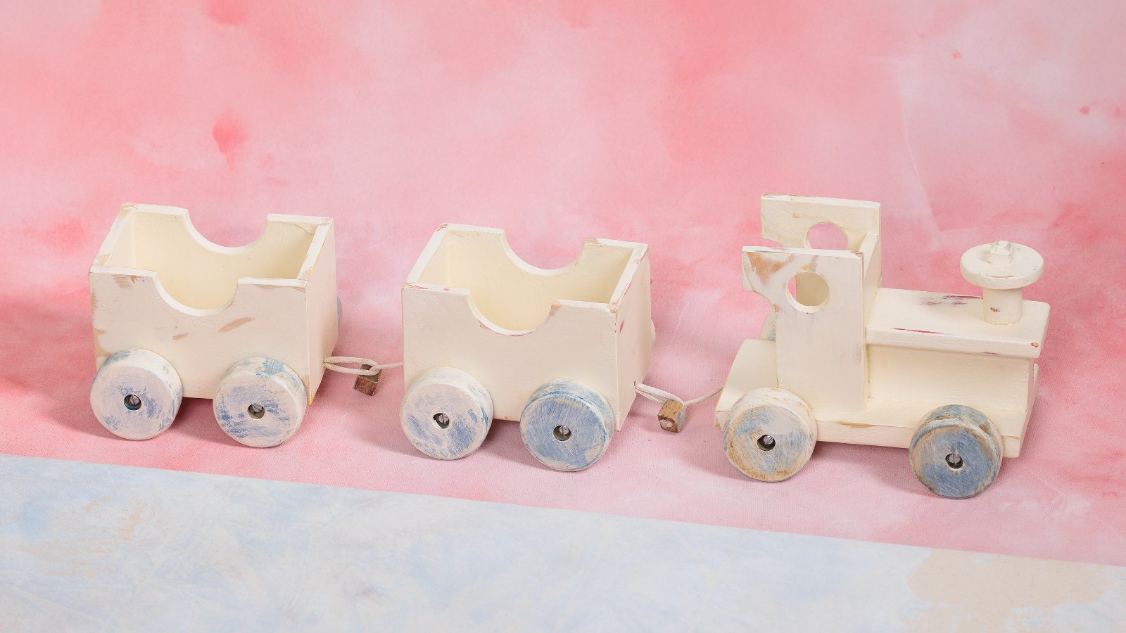 Starý drevený vláčik, prebrúsený, namalovaný kriedovými farbami a nalakovaný. Kolieska som opravila tak, aby sa točili.