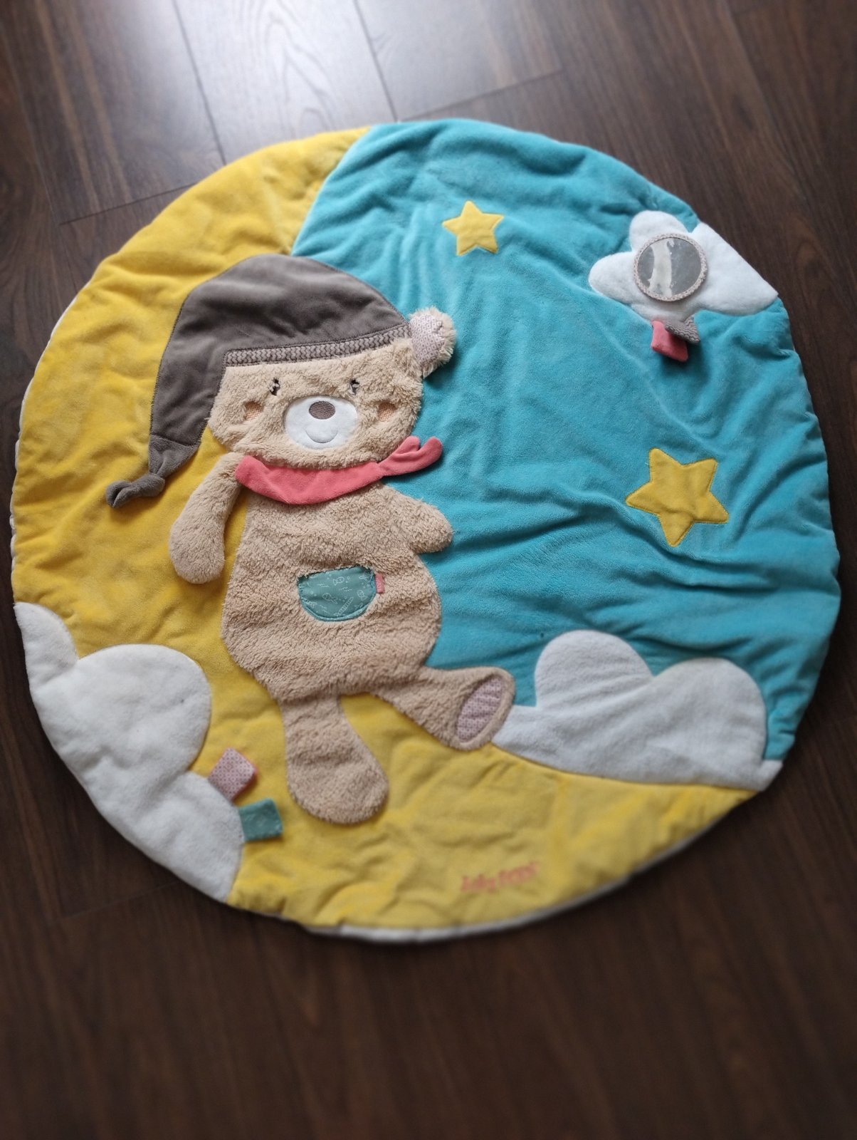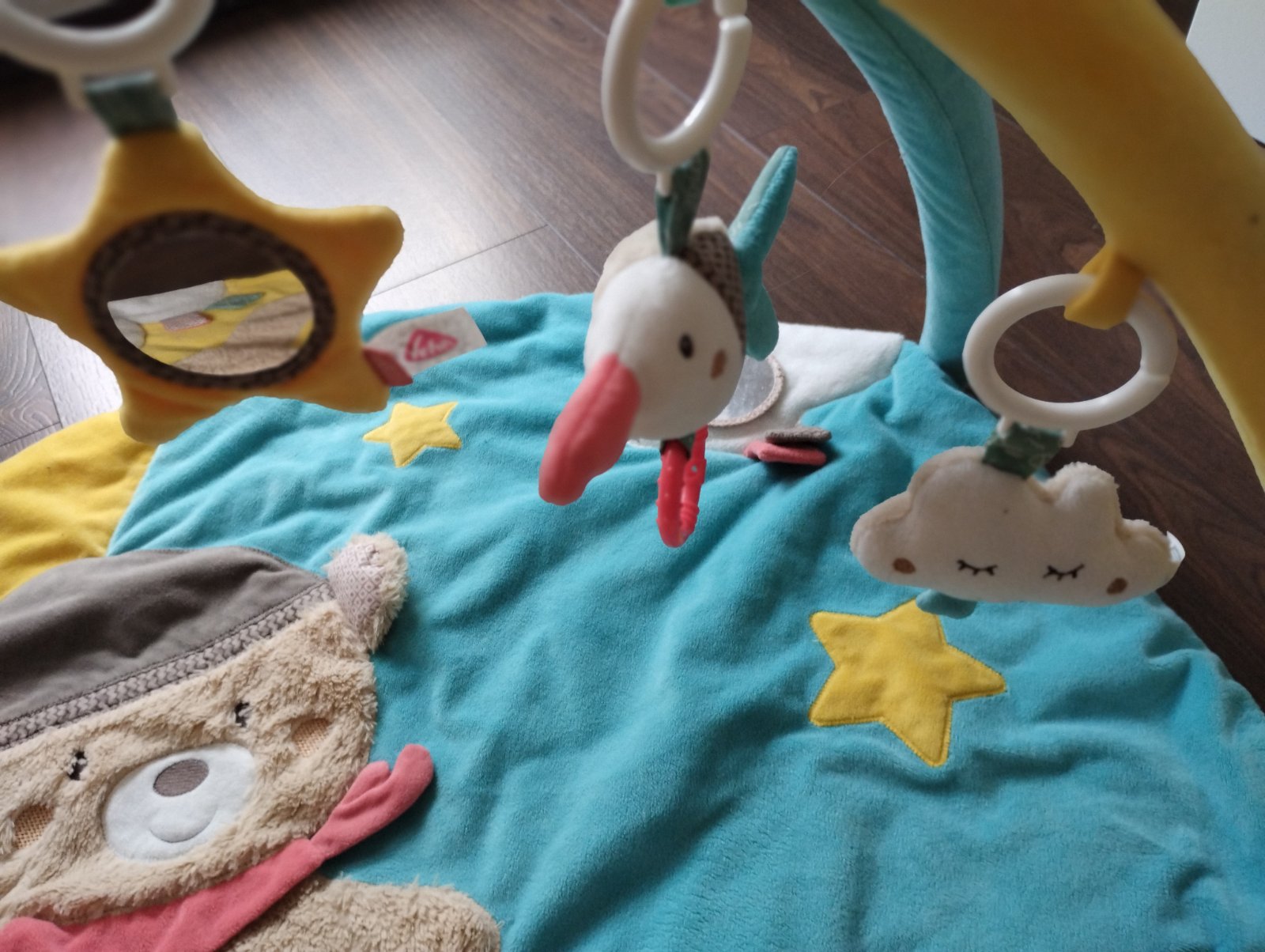 Vo vybornom stave, iba na jednom zo zrkadielok vidno trosku pouzivanie. Hrazdicka je odnimatelna, hracky hrkaju, piskaju, sustia a daju sa zavesit aj do kocika alebo na vajicko (5ks). Deka ma tiez rozne prvky na rozvoj jemnej motoriky. 85*85*45cm