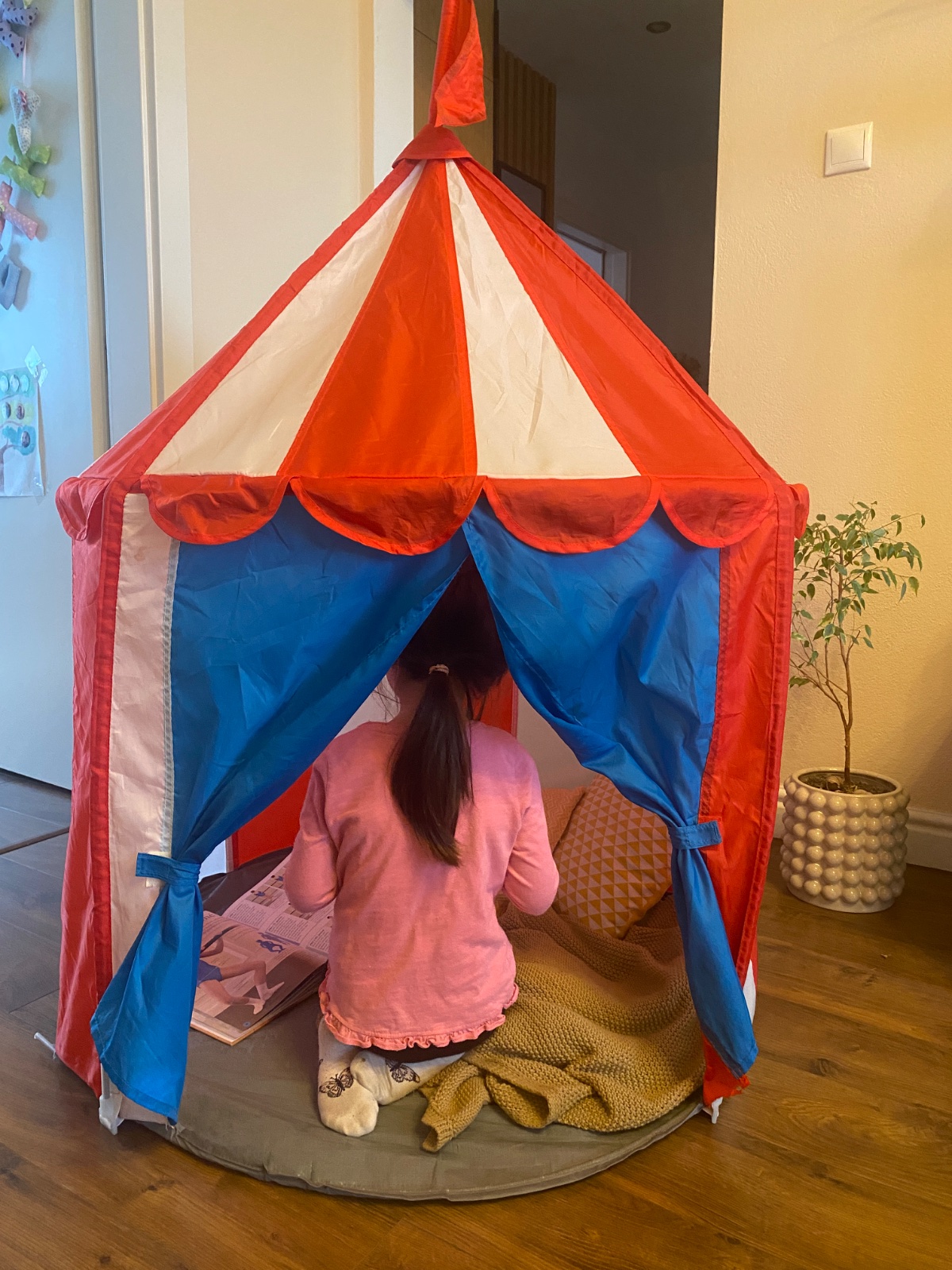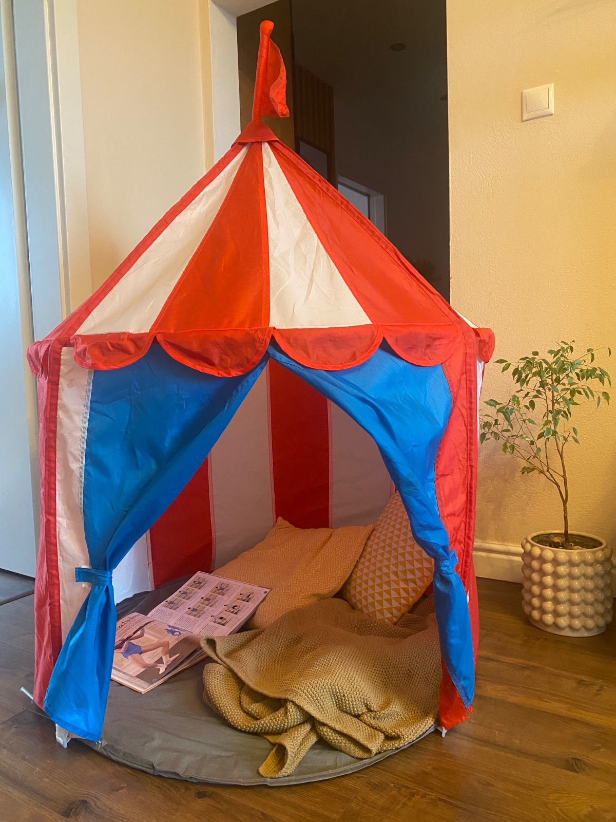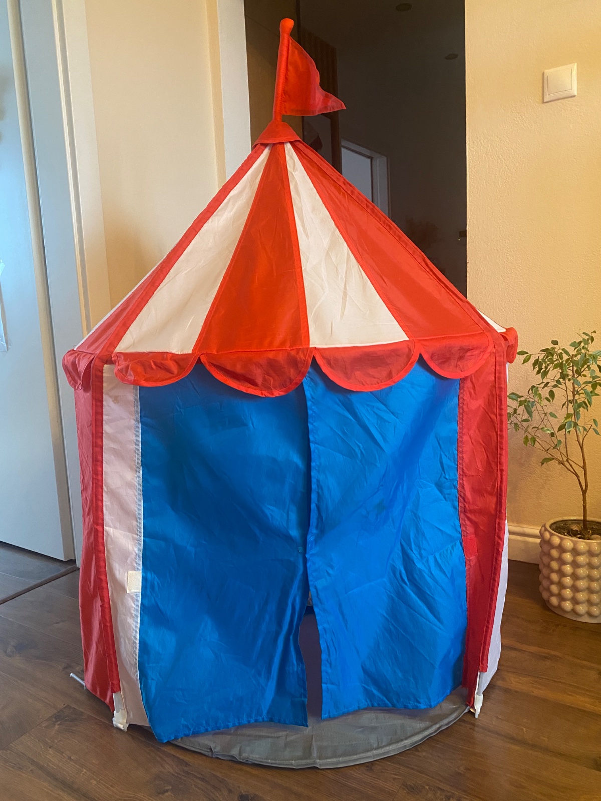 Predám stan kupovaný v Ikei CIRKUSTÄLT. Má len malú chybu, v spodnom leme je dierka a vyťahuje sa tyč, ale je možné ju zatlačiť dovnútra :) (chybičku vidno vo fotkách) stan aj s touto chybičkou bez problémov stojí a je možné sa v ňom hrať.