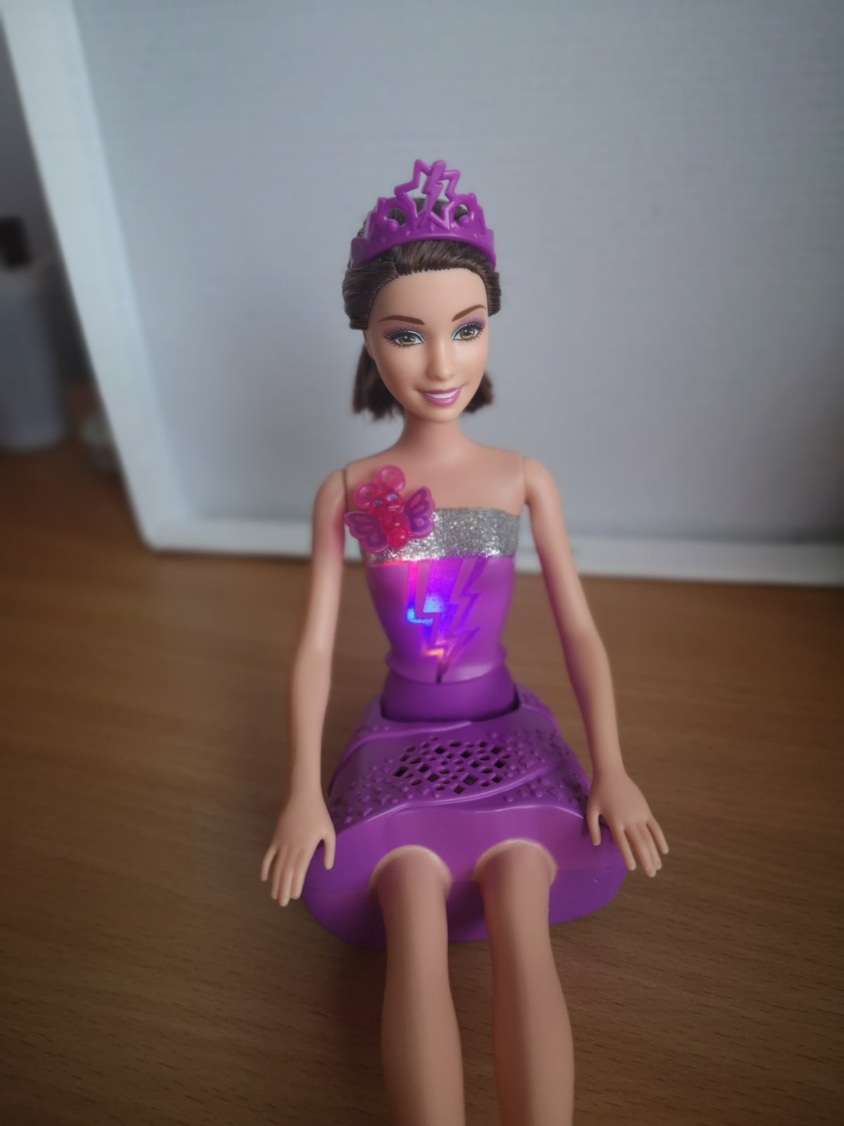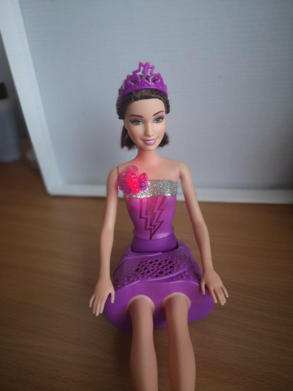 Na prednej strane je motýľ, po stlačení sa rozsvieti a vydá zvuk bozku a následne sa jej rozsvieti živôtik rôznymi farbami.