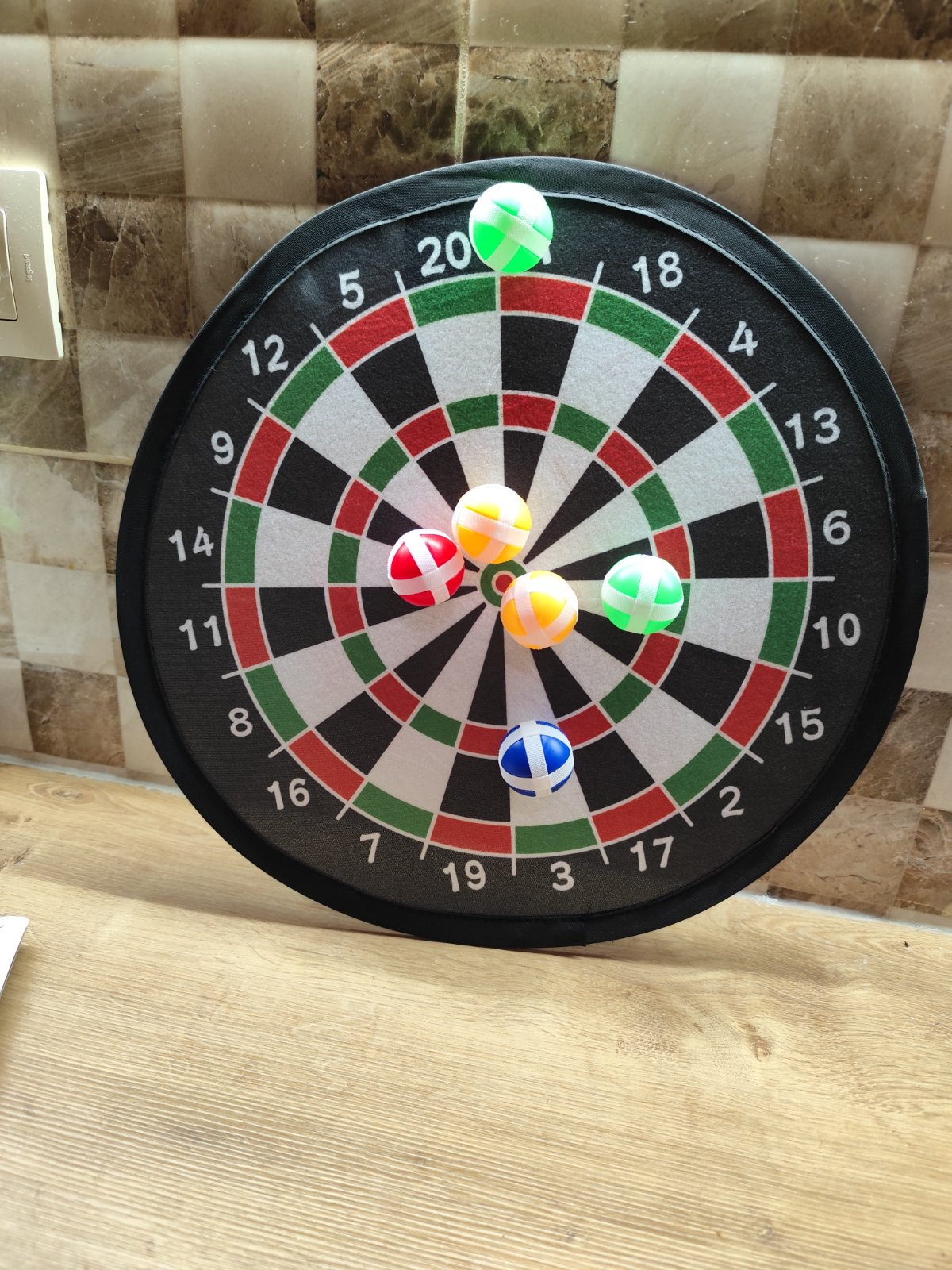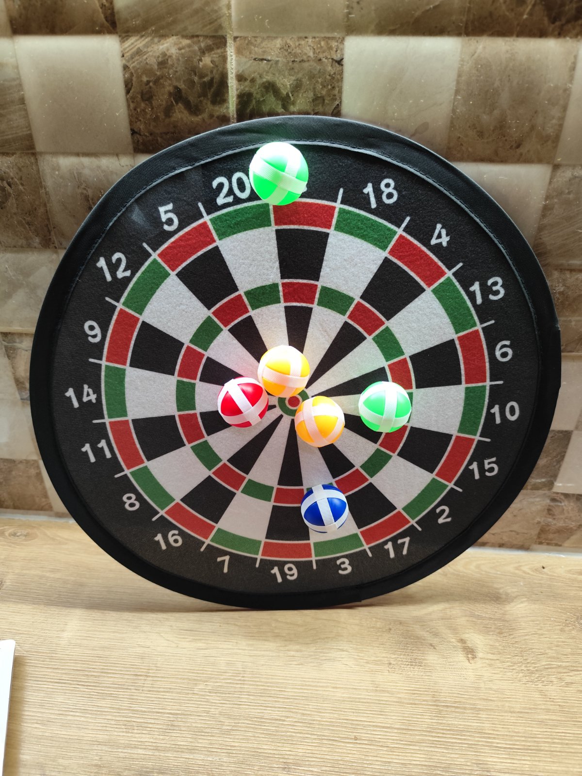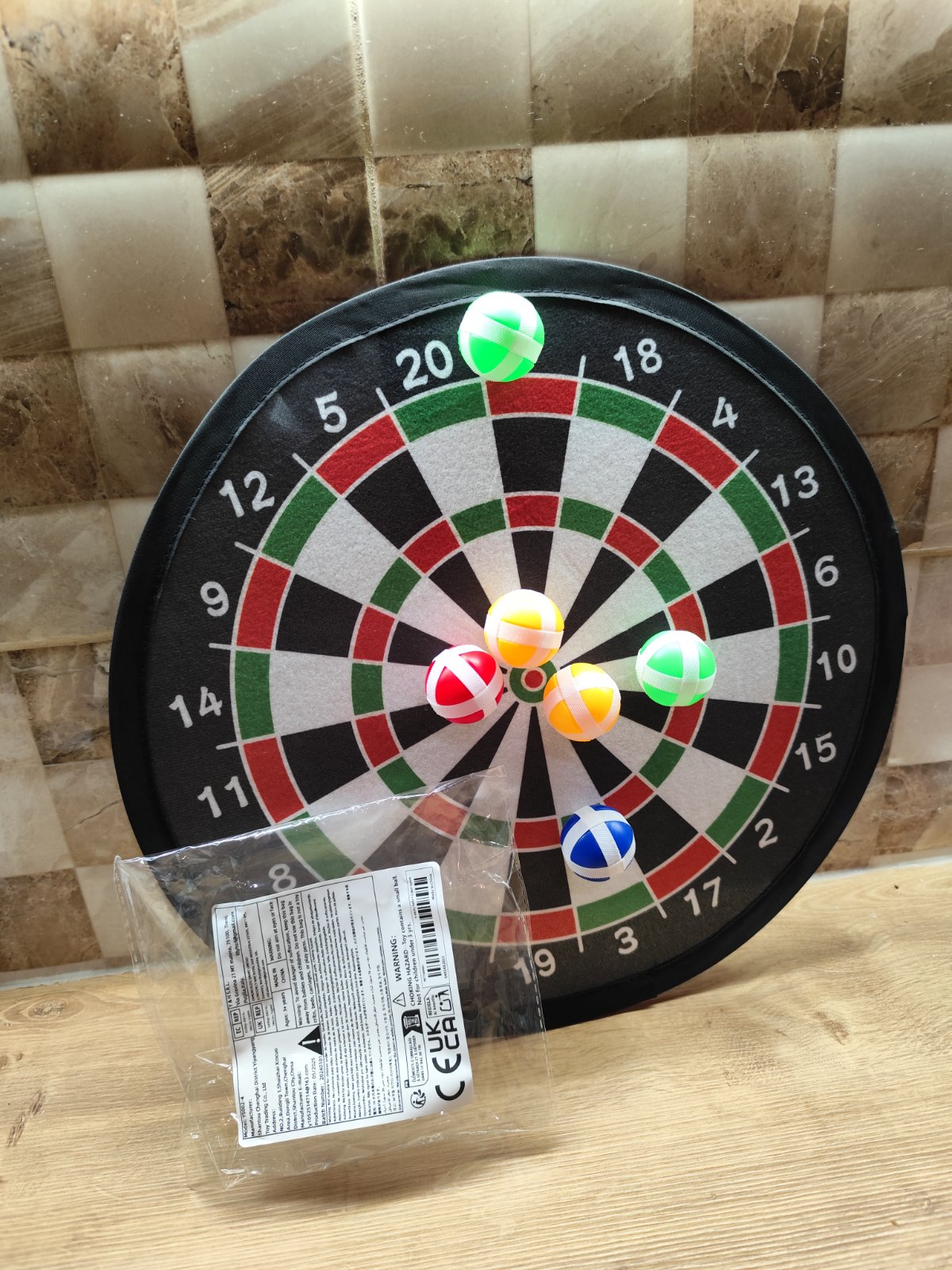 Predám bezpečný textilný terč pre deti. Namiesto ostrých šípok sa hádžu ľahké loptičky so suchým zipsom, takže nehrozí žiadne zranenie ani rozbitie vecí v byte.