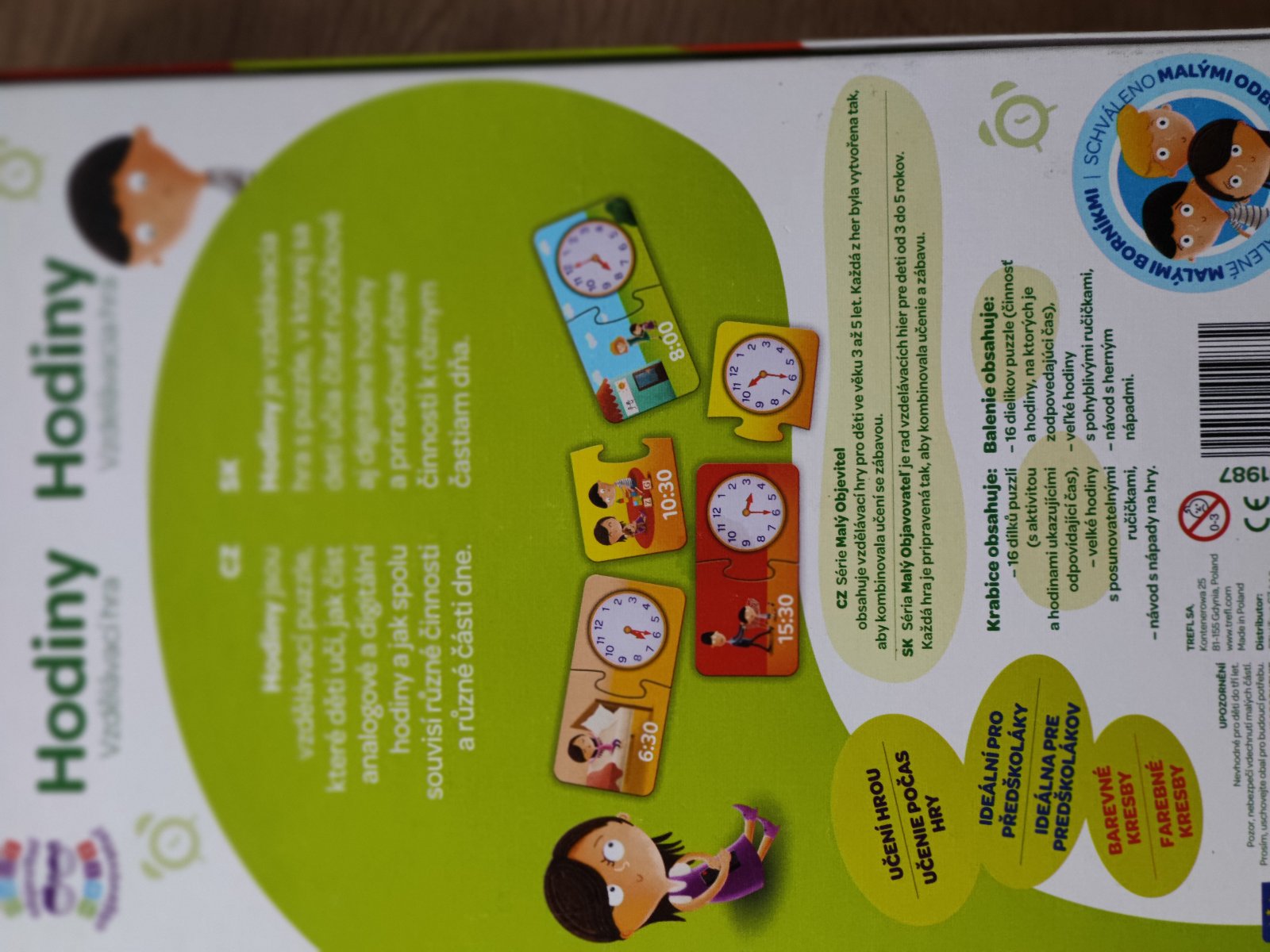 Hra na pochopenie hodin. Skatula je lepena, bola roztrhana od novoti. Komplet.