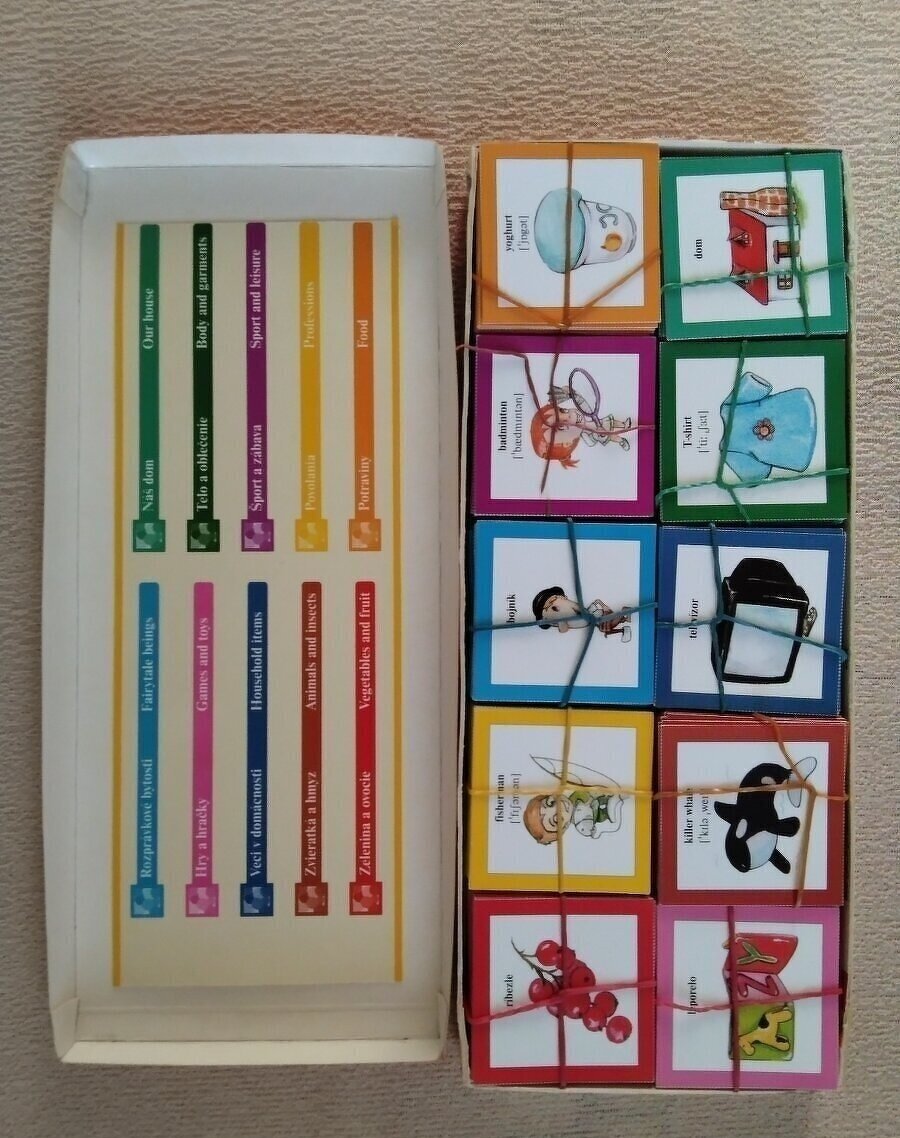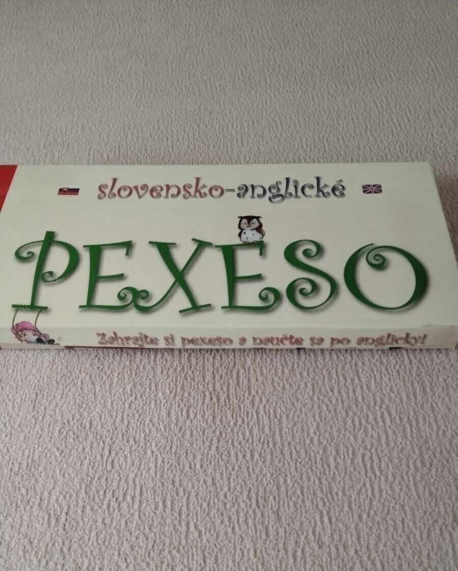 Predám slovensko-anglické pexeso vhodné pre deti, ktoré sa začínajú učiť anglický jazyk. Pomocou pexesa si dokážu hravou formou zapamätať slovnú zásobu z oblastí ako je šport, zvieratá, hmyz, jedlo, ovocie, zelenina, rozprávkové bytosti, hry, hračky, domácnosť a podobne.