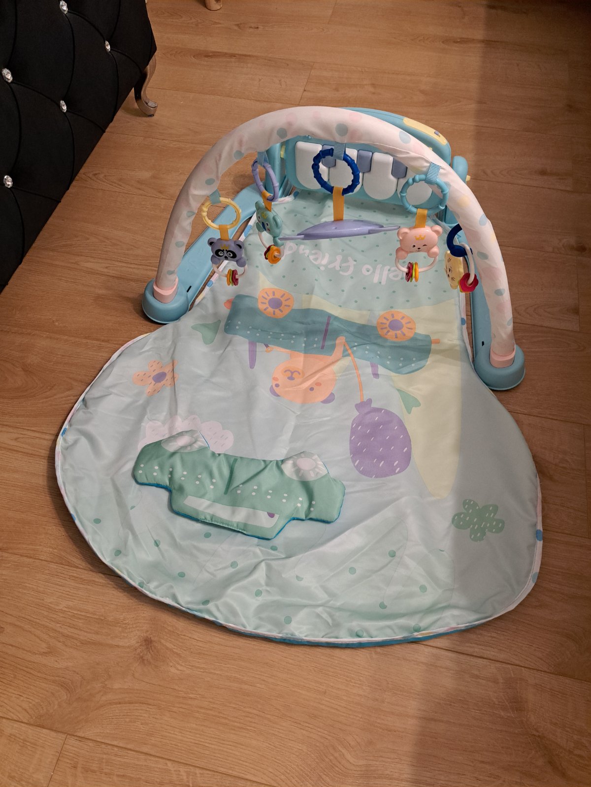 Hracia deka po 1 dieťati, v top stave. Telocvik s hudbou vhodné na otáčanie hlávky a celého tela za hračkami,zrkadielkom,klavírom s hudbou.
