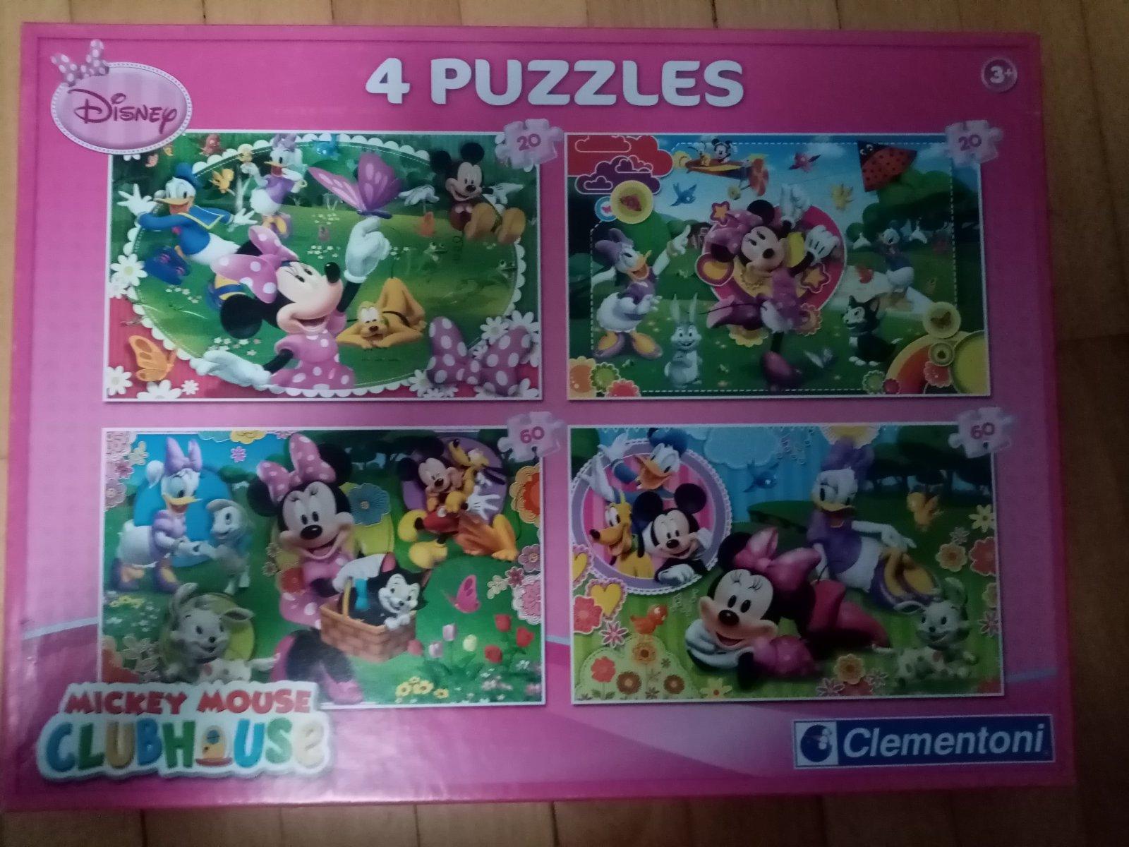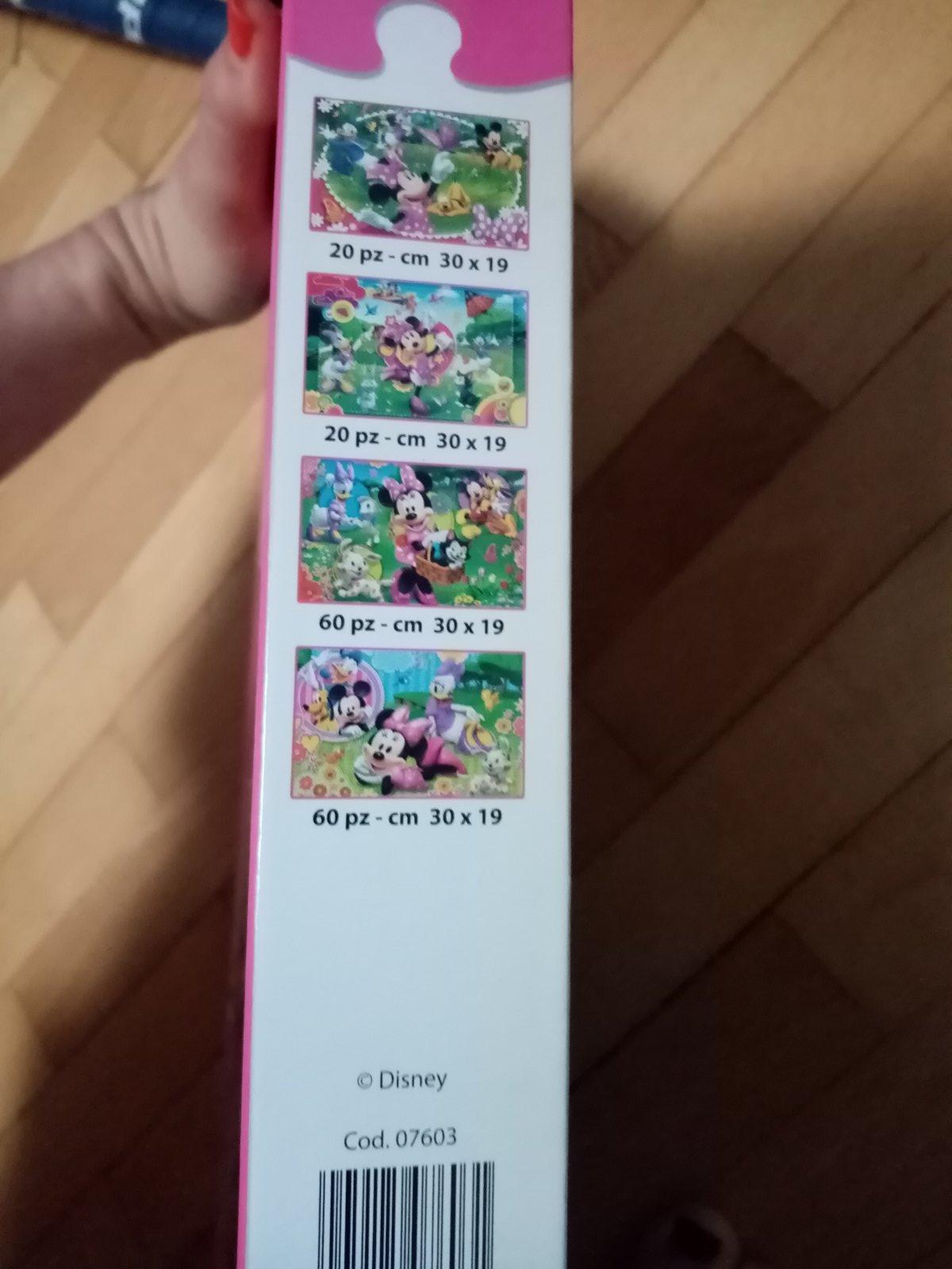 Krásne, asi dva krát poskladané puzzle s Minnie od 3 rokov. Dva obrázky sú z 20 dielikov a 2 zo 60 dielikov. Veľmi pekný stav, viď foto.