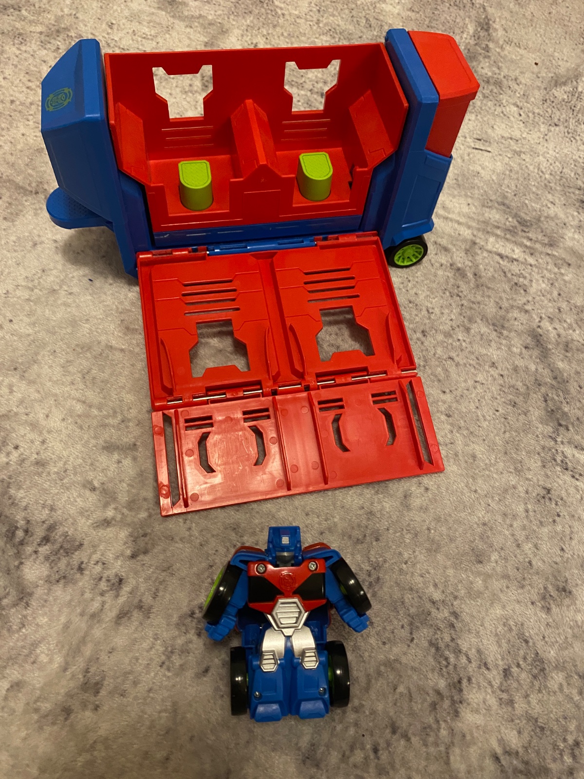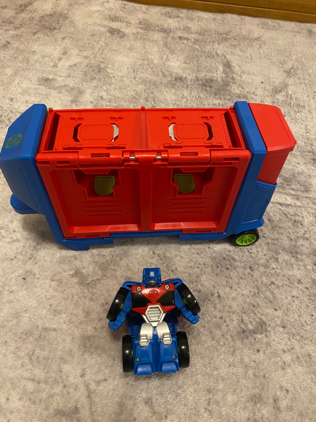 Mini transformer Optimus Prime s vlečkou - kamionom. Otvárací kamion. Figúrka sa vkladá dnu a zatlačí sa. Pohnutím pohyblivej časti vlečky figurka vyskočí. Plne funkčné, nepoškodené, ako nové.