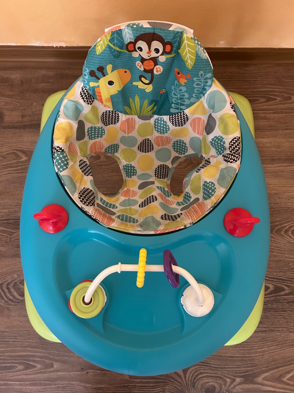 Bezove choditko s tyrkysovym stolcekom. Odopinatelny pultik na hranie. Hra 4 melodie, ma volant, otocny kvietok, koliesko, a dalsie dve hracky na cvicenie jemnej motoriky. Po odopnuty hracieho pult...