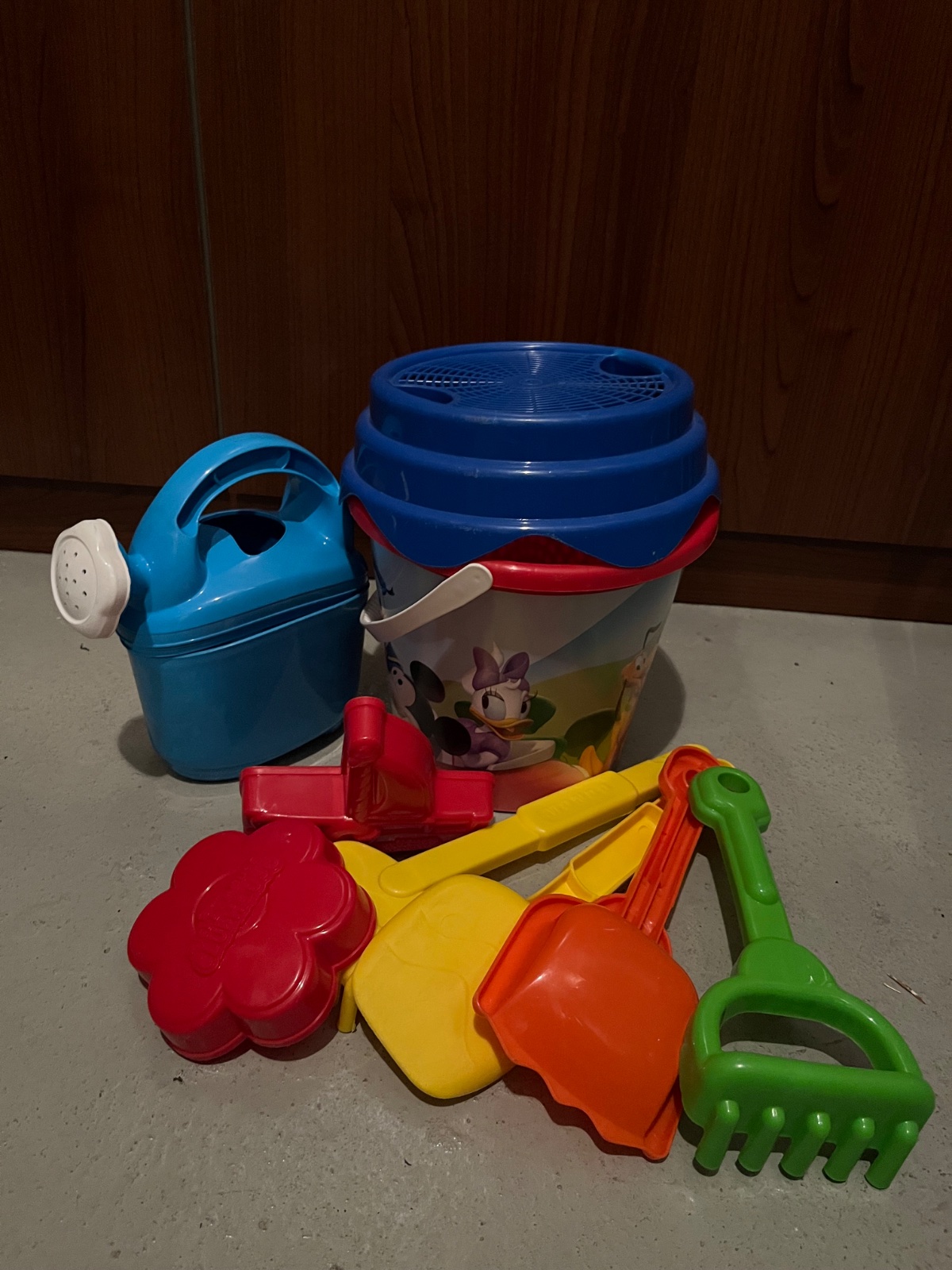 Predam set do pieskoviska alebo na plaz, vyska kyblika cca 23 cm. Obsahuje Kýblik (Disney-Pluto/Mickey) so sitkom/vrchnakom, 2 formicky, konvicka, 4 naradia na hrabanie/lopatky, symbolicka cena. Neposkodene, nic nie je zlomené, Kýblik nie je poskriabany. BA - Ruzinov.