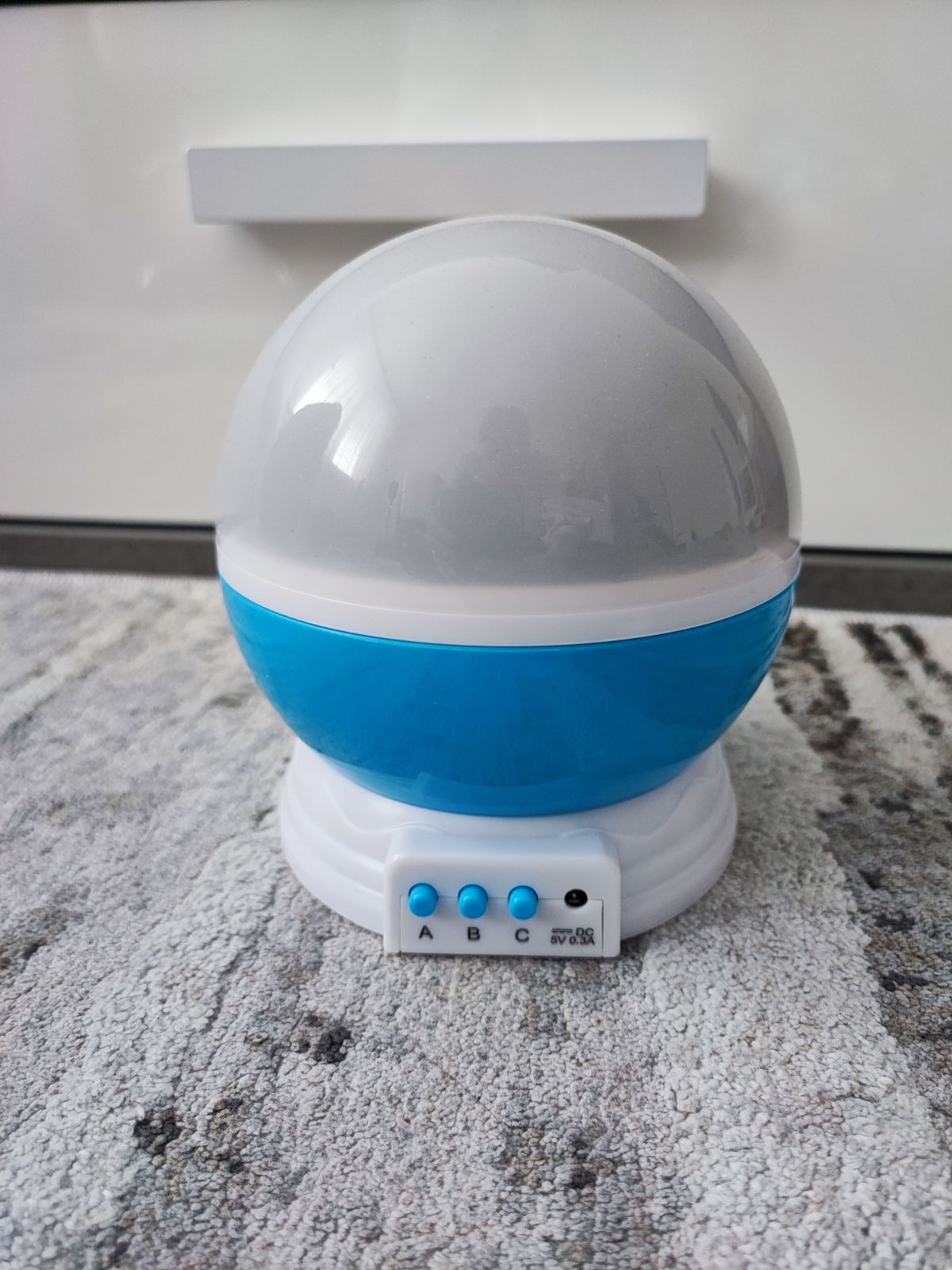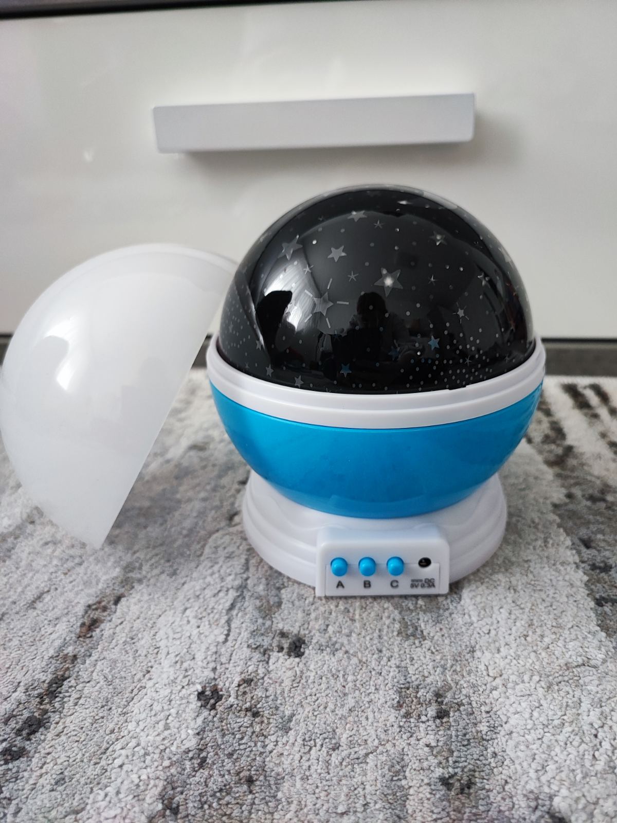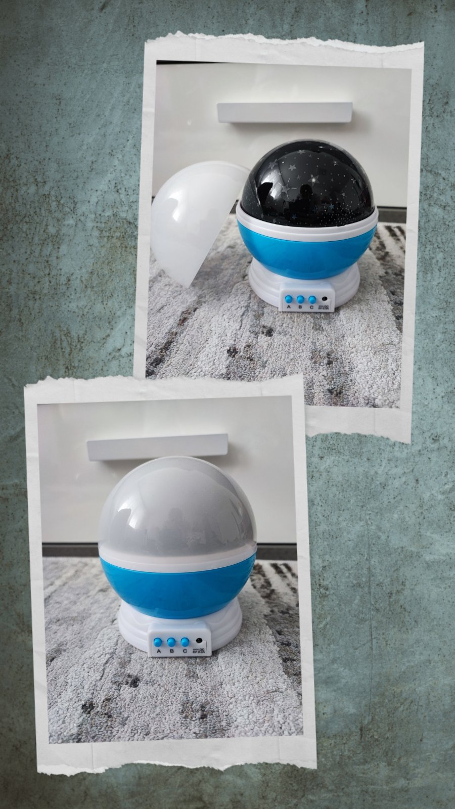 Dá sa vybrať z viacerých variantov....má farby a projekcia sa pohybuje alebo aj stojí....keď sa zavre poklop slúži ako malé nočné svetlo.