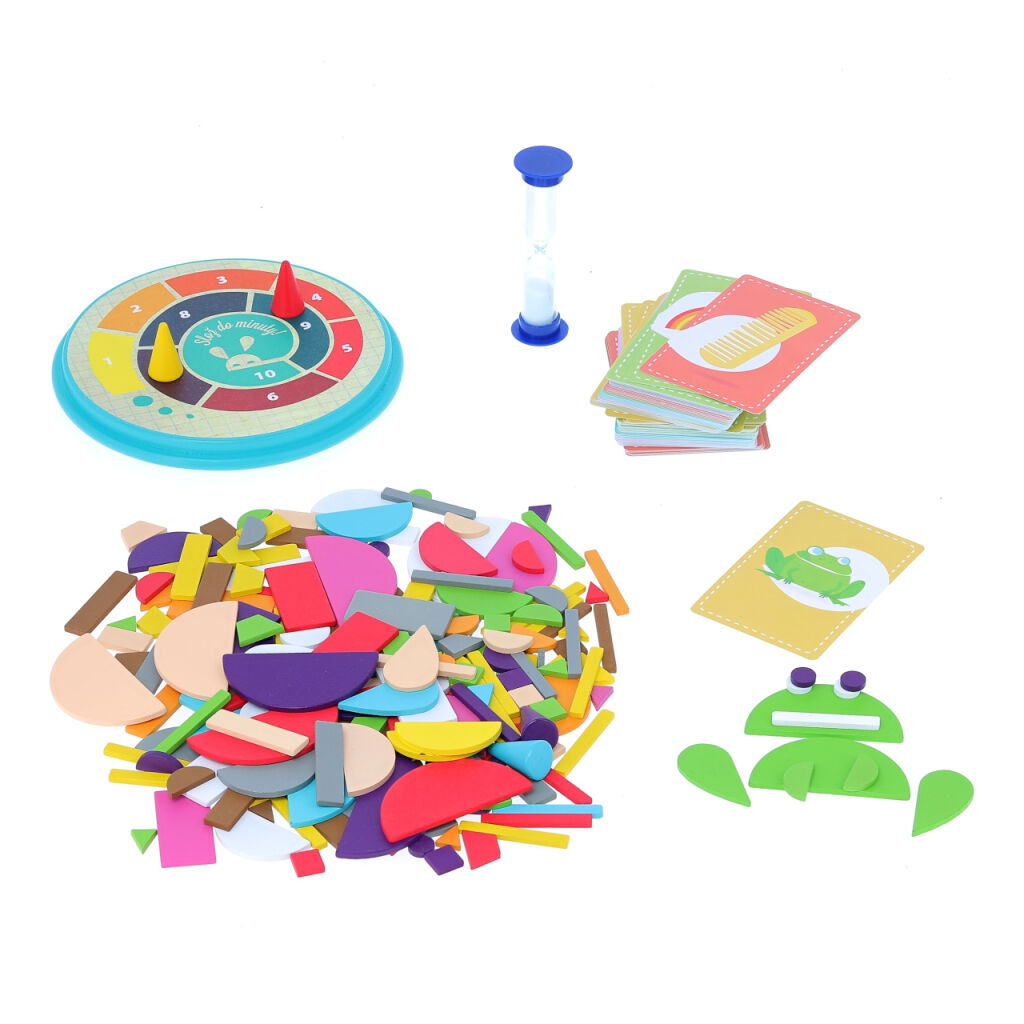 Obsahuje: základovú dosku pre posúvanie bodov, presýpacie hodiny (1 minúta), 250 drevených geometrických tvarov, 100 kartičiek sa zadaním