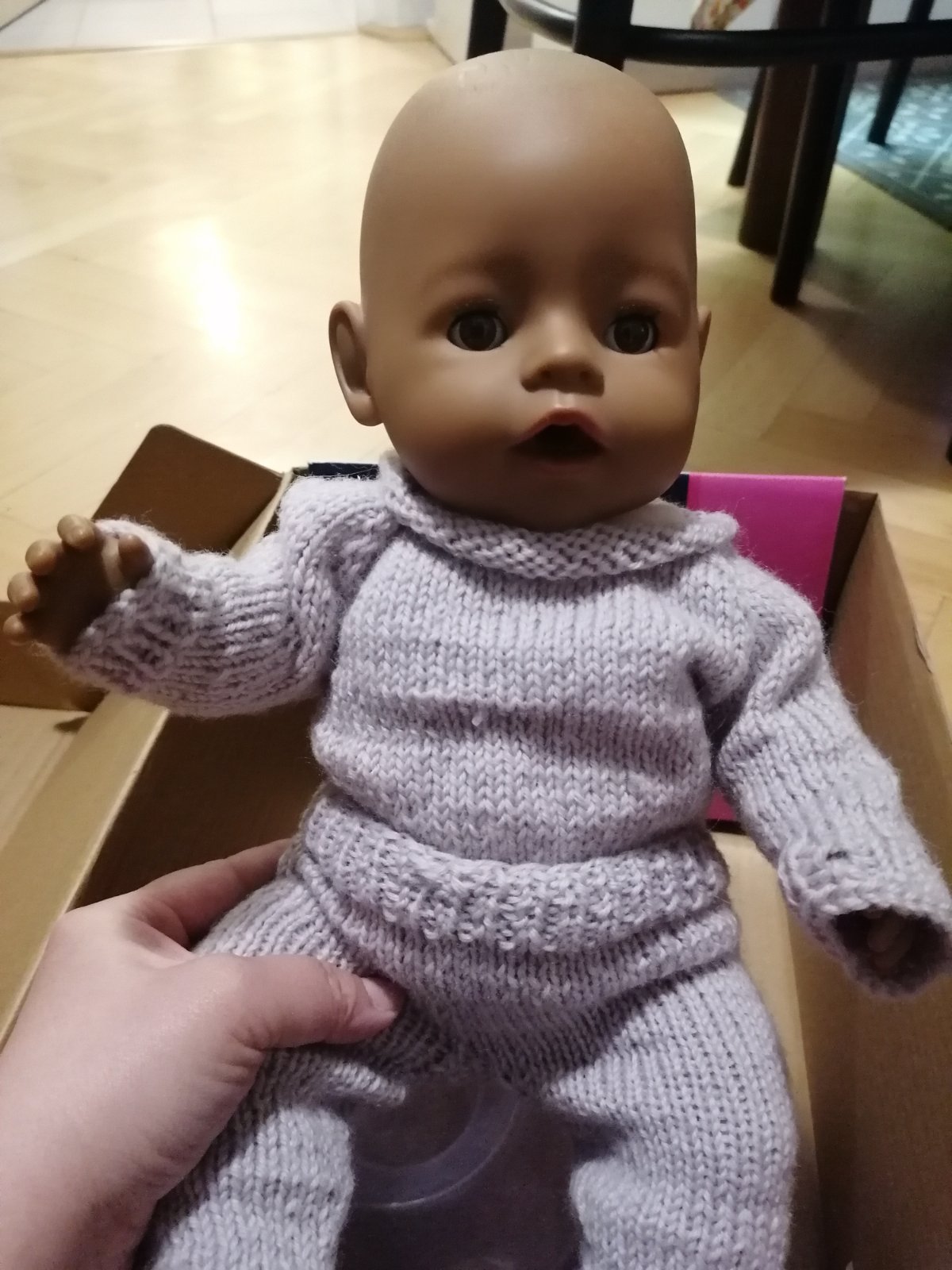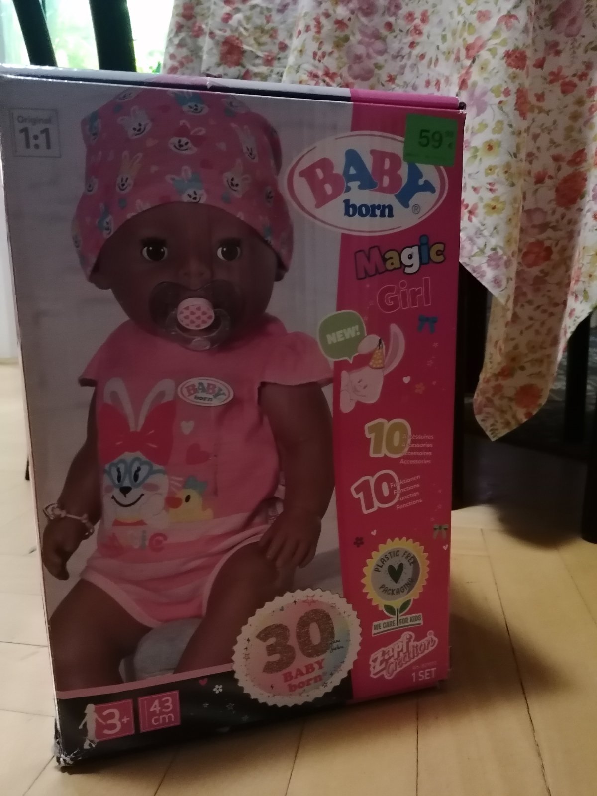 V perfektnom stave. Bábika plače (roní slzy), ciká, dá sa nakŕmiť špeciálnou kašou (sú pribalené), pije vodu. Po vložení dudlika zavrie očká. Ma tmavú pleť. PC60€.