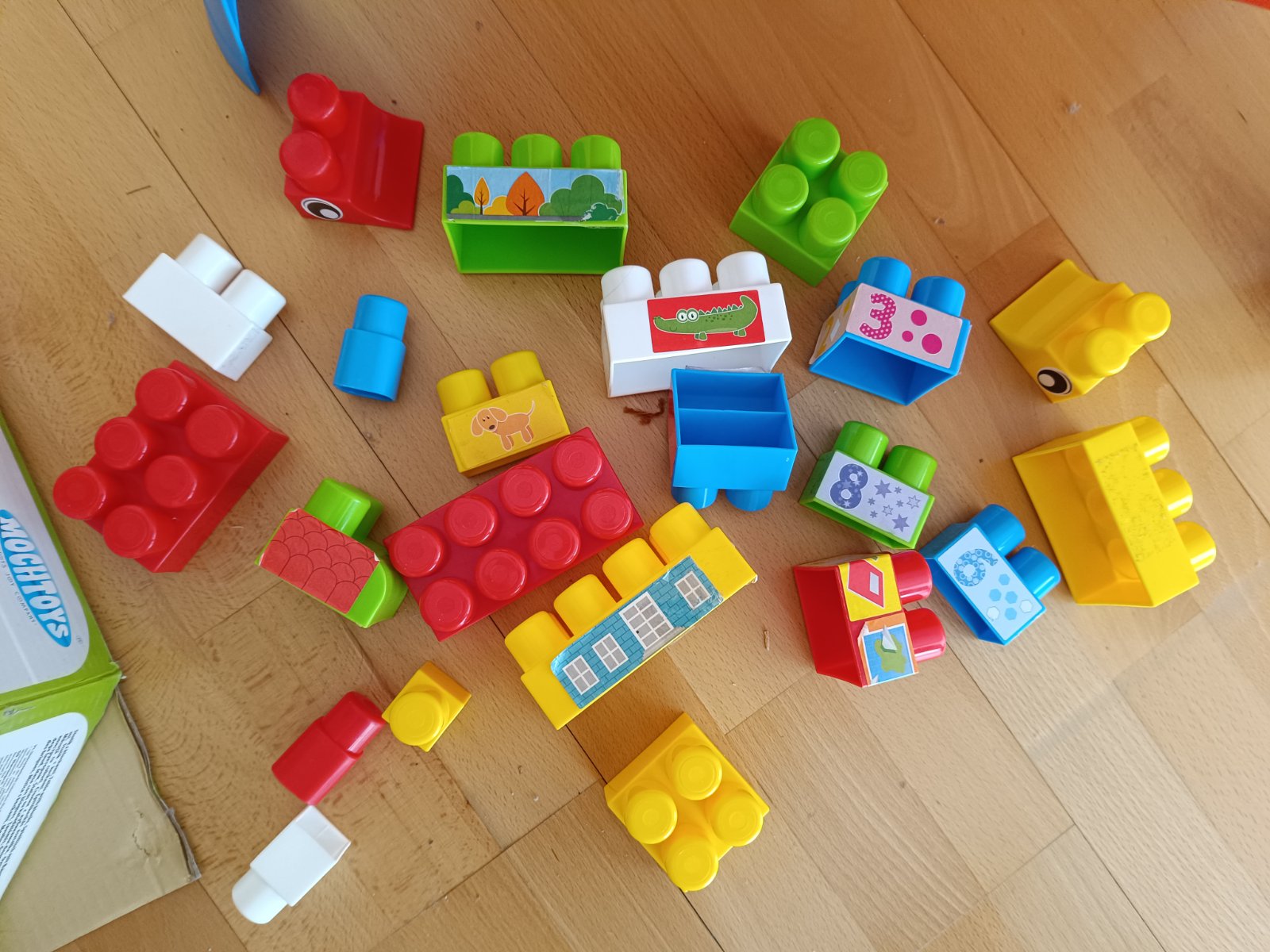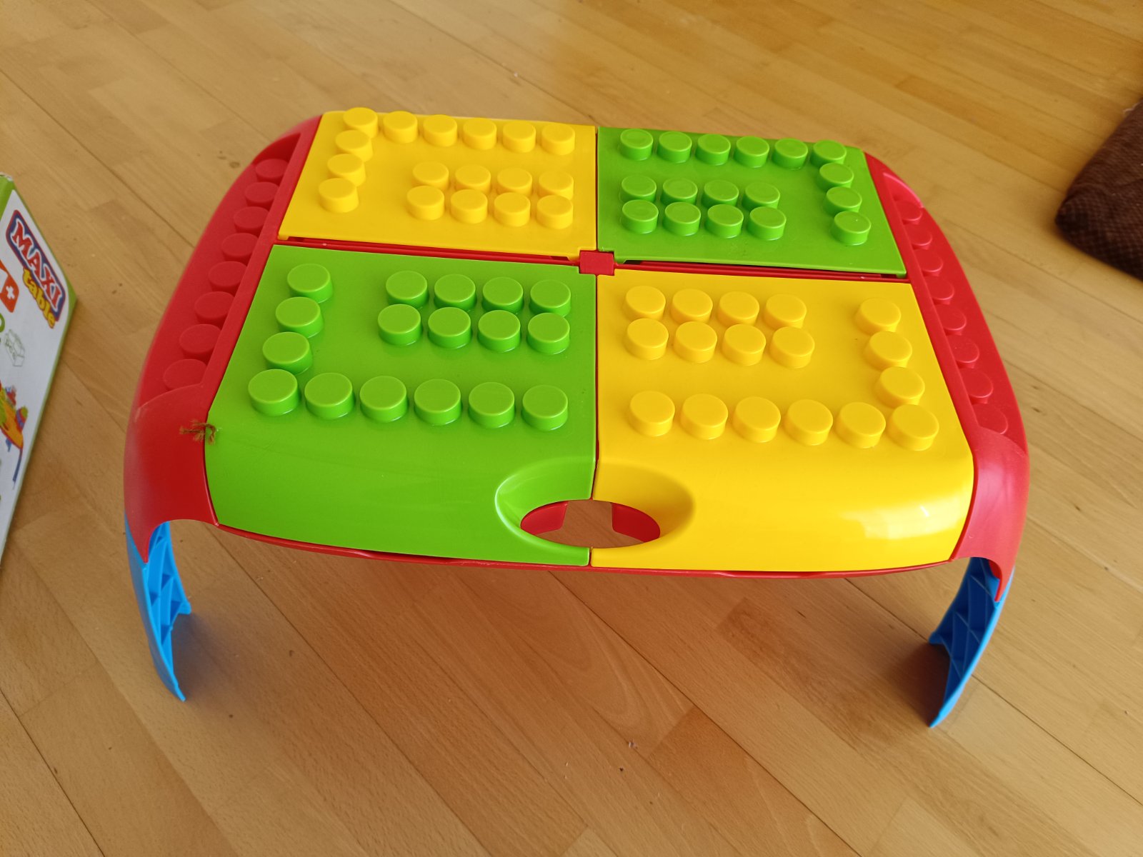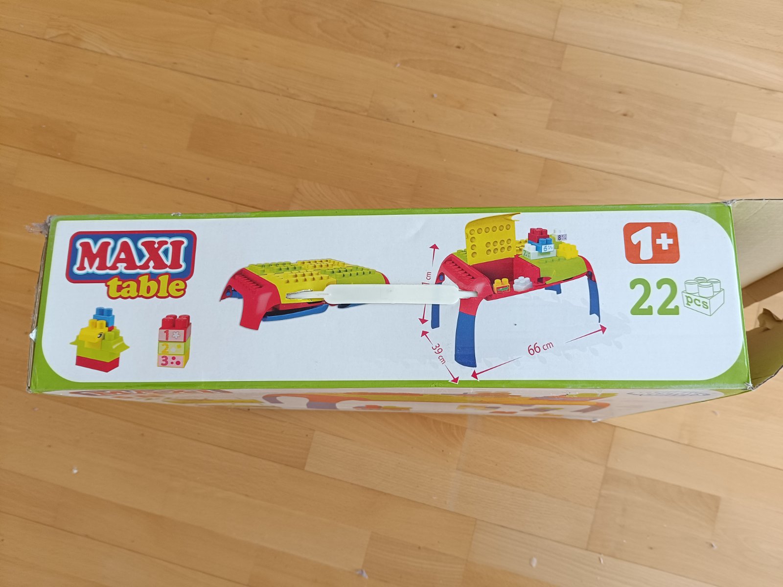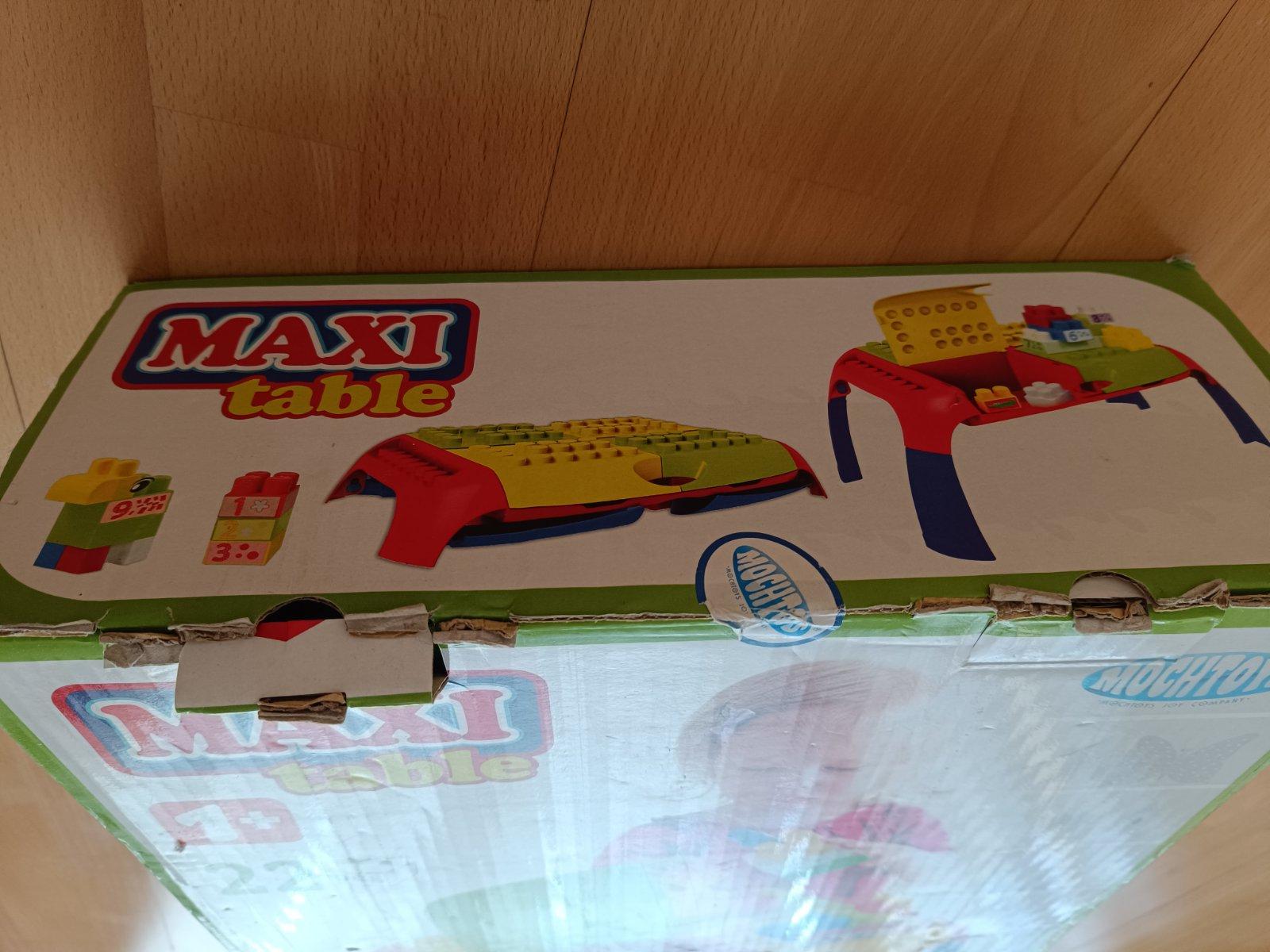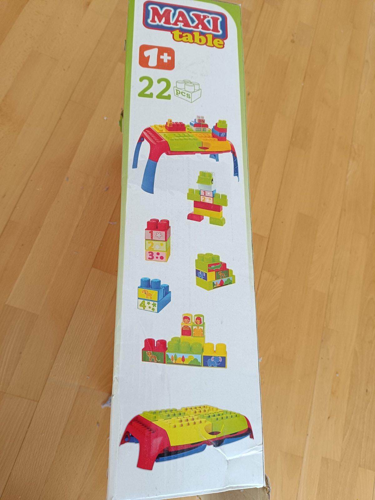 pekný stav, asi 2-3 krát hrany, neskory dar, deti si vedia stavať kocky na stolíku, ľahko prenosný, rozvíja motoricky pohyb, rozmery na fotke,