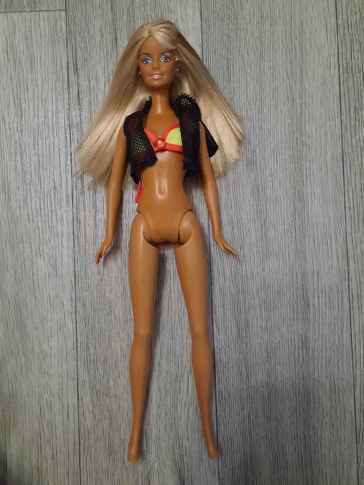 Barbie Mattel. Má gumené nohy, je ohybná v kolenách, upaží ruky. Má opálené telo a melírové, lesklé vlasy.