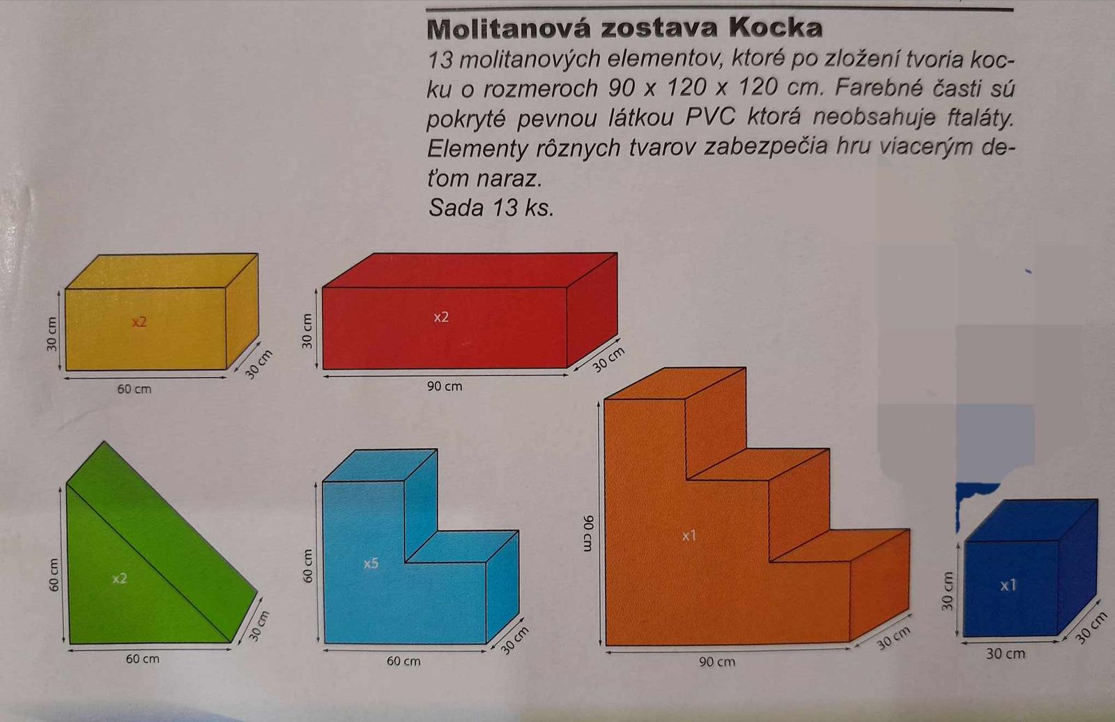 Molitanová zostava, 13 ks. Farebné časti sú pokryté pevnou látkou PVC. Ideálna pre detské kútiky, telocvične. Málo používaná.Dohoda na cene možná. Osobný odber