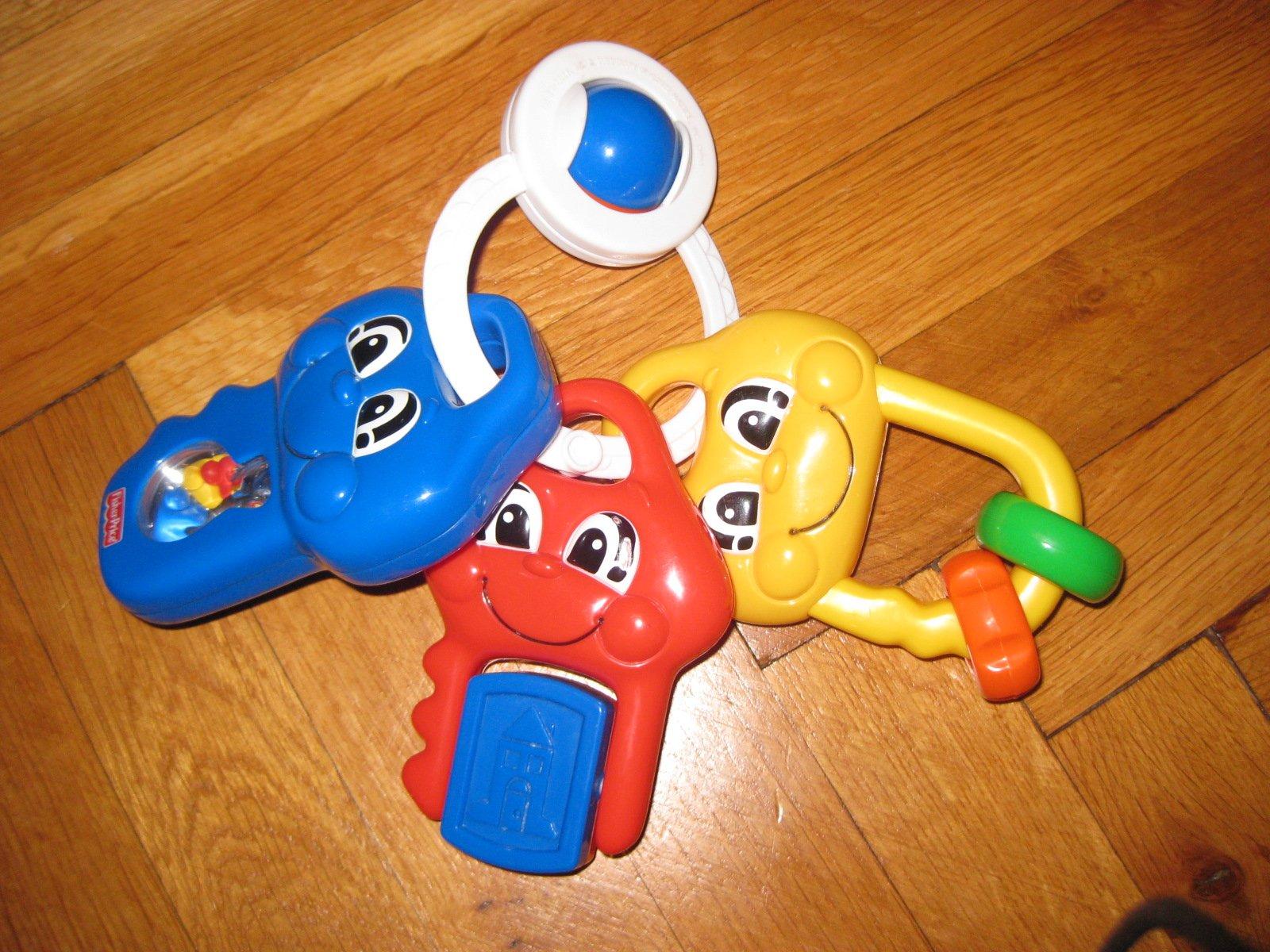 Hrajúce kľúčiky, každý kľúčik má inú funkciu, modrý hrá melódie. Možno ich zavesiť na kočík, dajú sa dať dole zo spony. Koliesko na spone je možné točiť.