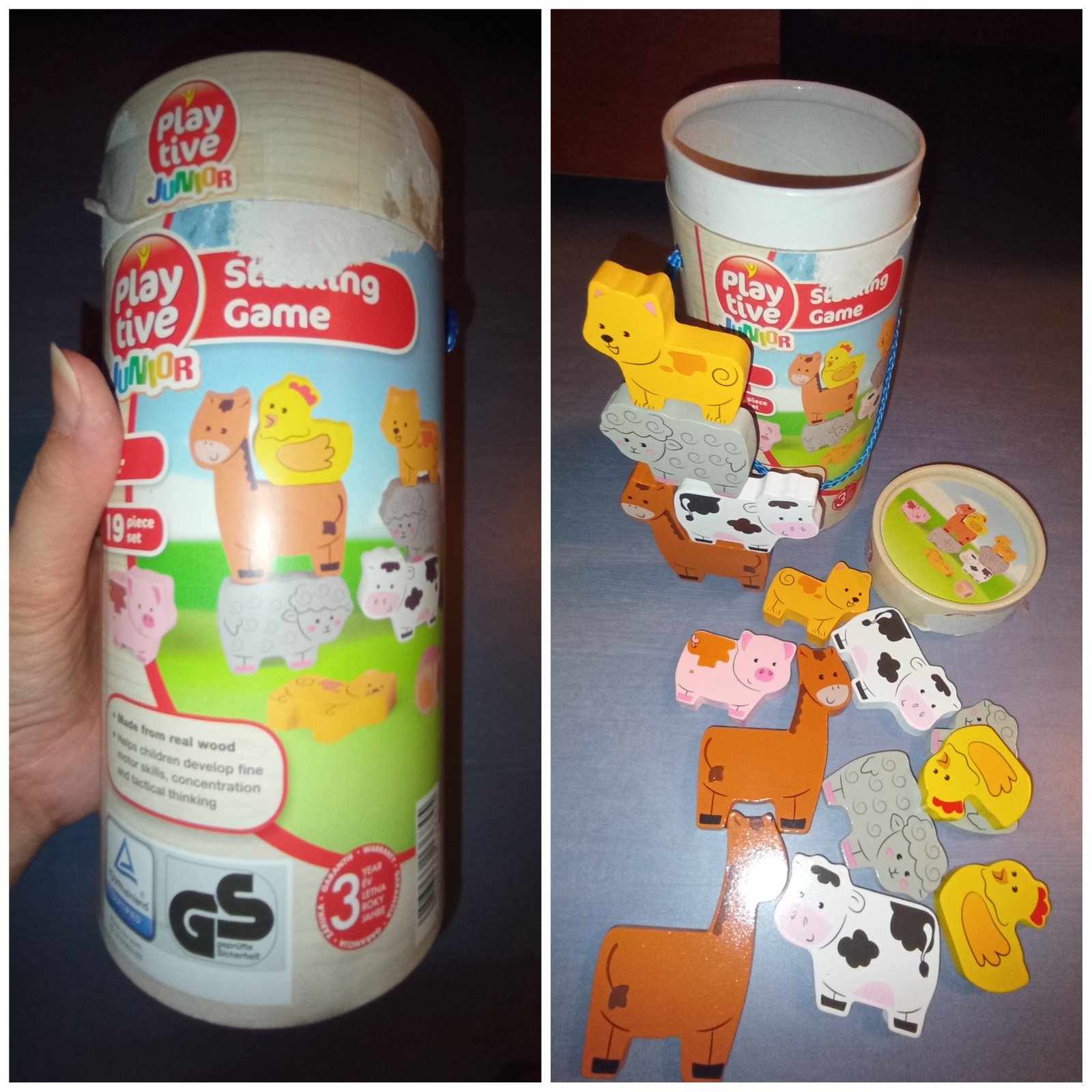 Predam box s drevenymi zvieratkami, je to kreativna skladacka na cvicenie jemnej motoriky, nakolko nie je lahke ich poukladat na seba aby nespadli ale da sa to.