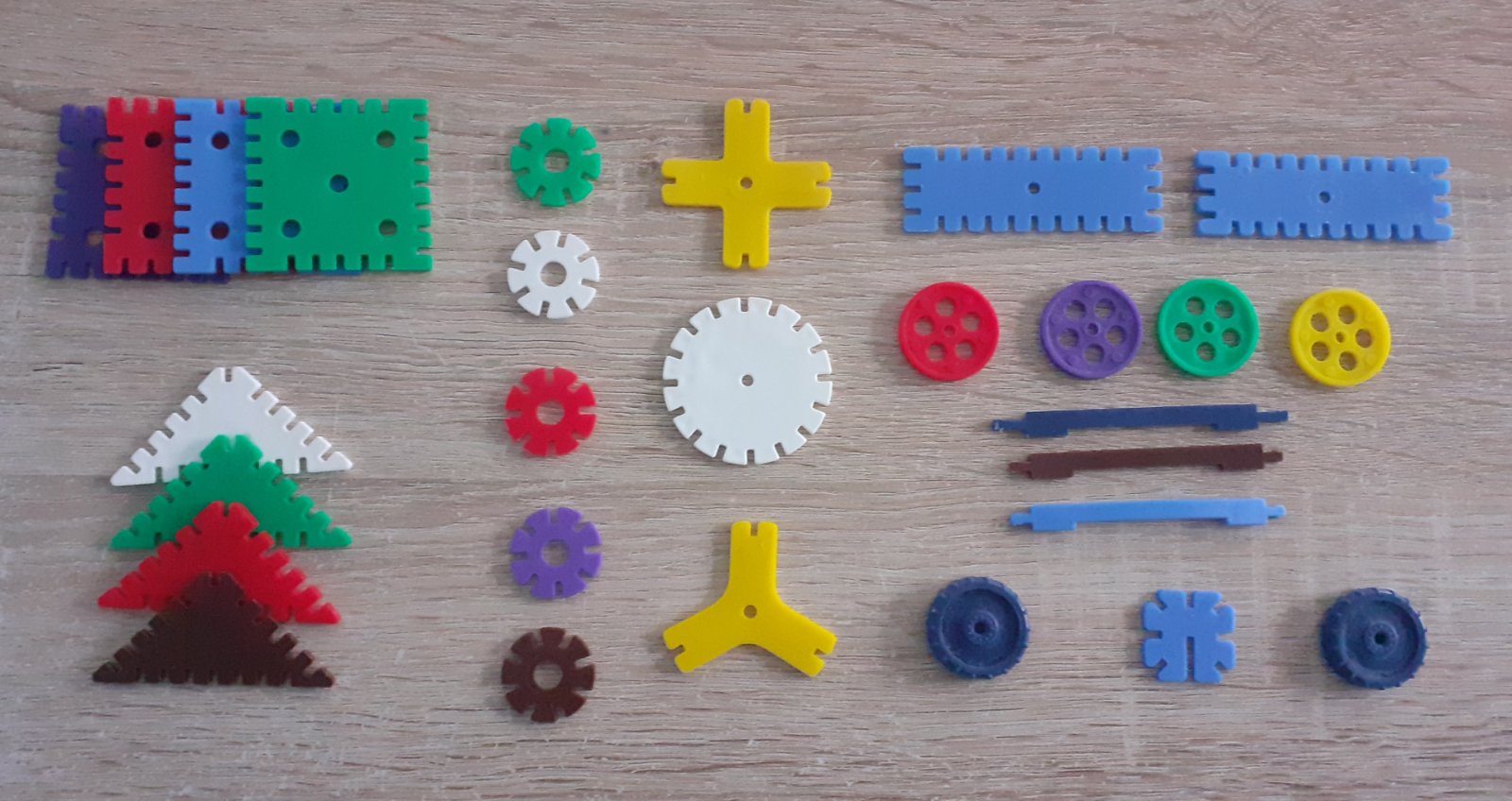 kolesá a ploché diely rôznych tvarov a farieb.