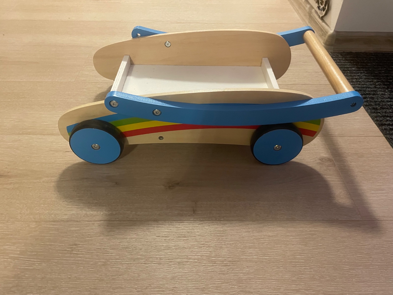 Dreveny vozicek super sa syn vyhral, ale je vo velmi peknom stave, koli skladovaniu ho mam uz zlozeny. Len sa presrobuje do dierky ( kde ukazujem na foto) a da sa tlacit.
