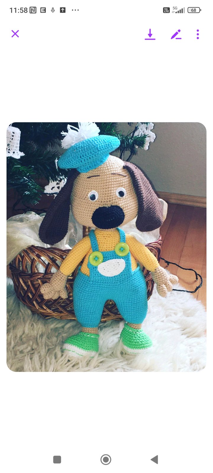 Predávam háčkovaného psíka pre malého chlapčeka vyrobeného z vlny jeans art plneného dutým vláknom.