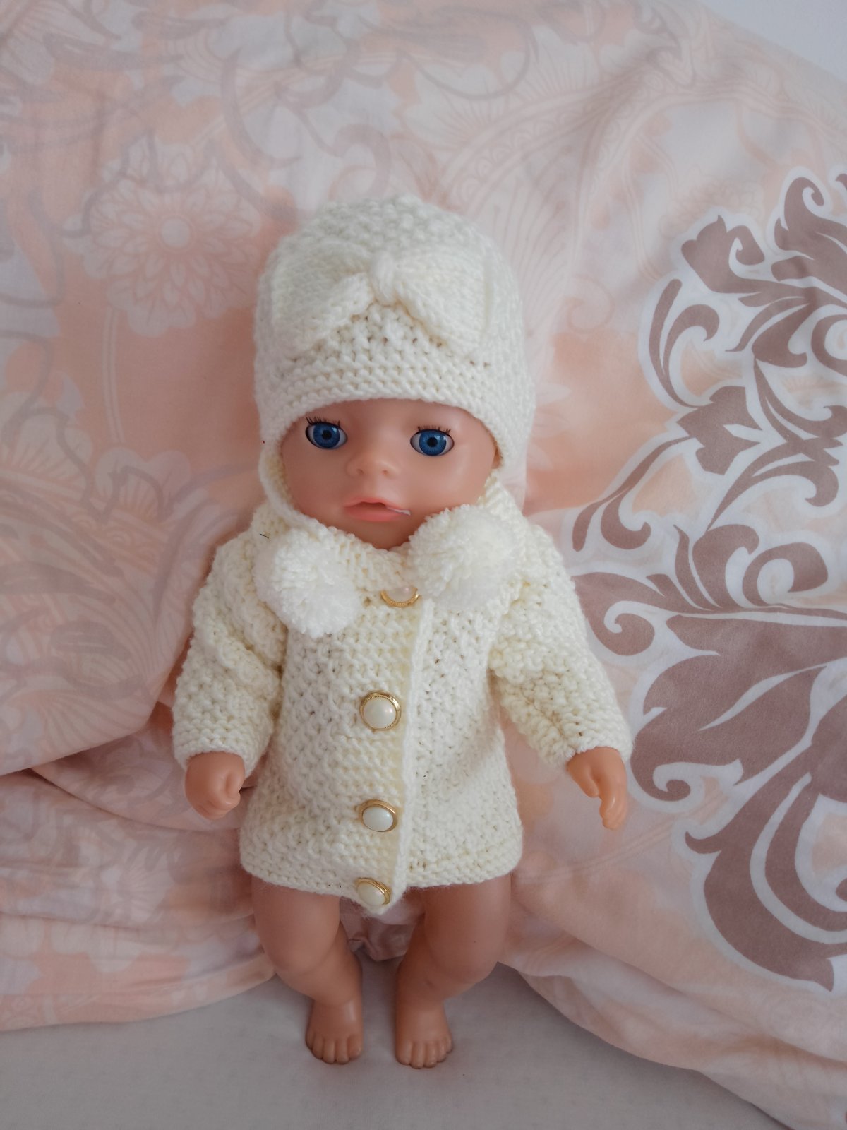 Posledné foto -kremovy strikovany kabátik, čiapka a šál pre baby born 36cm - 9€.