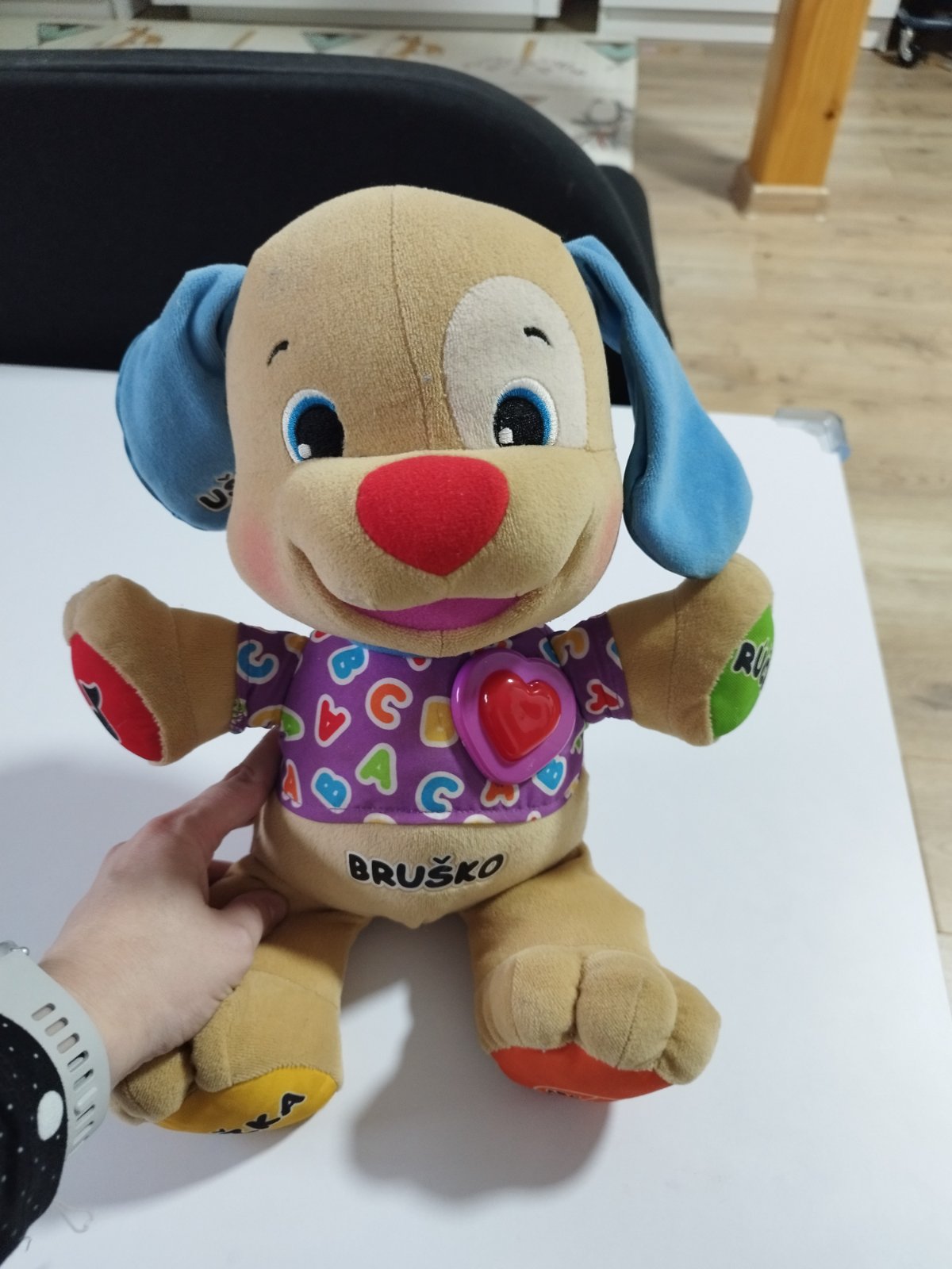 Značka Fisher price. Hrá upokojujúce melódie, bruško sa pohybuje hore dole, lampa svieti, hračka dýcha, bije mu srdiečko. Toto všetko sa dá zvlášť vypínať podľa potreby. Super pomôcka na zaspávani...