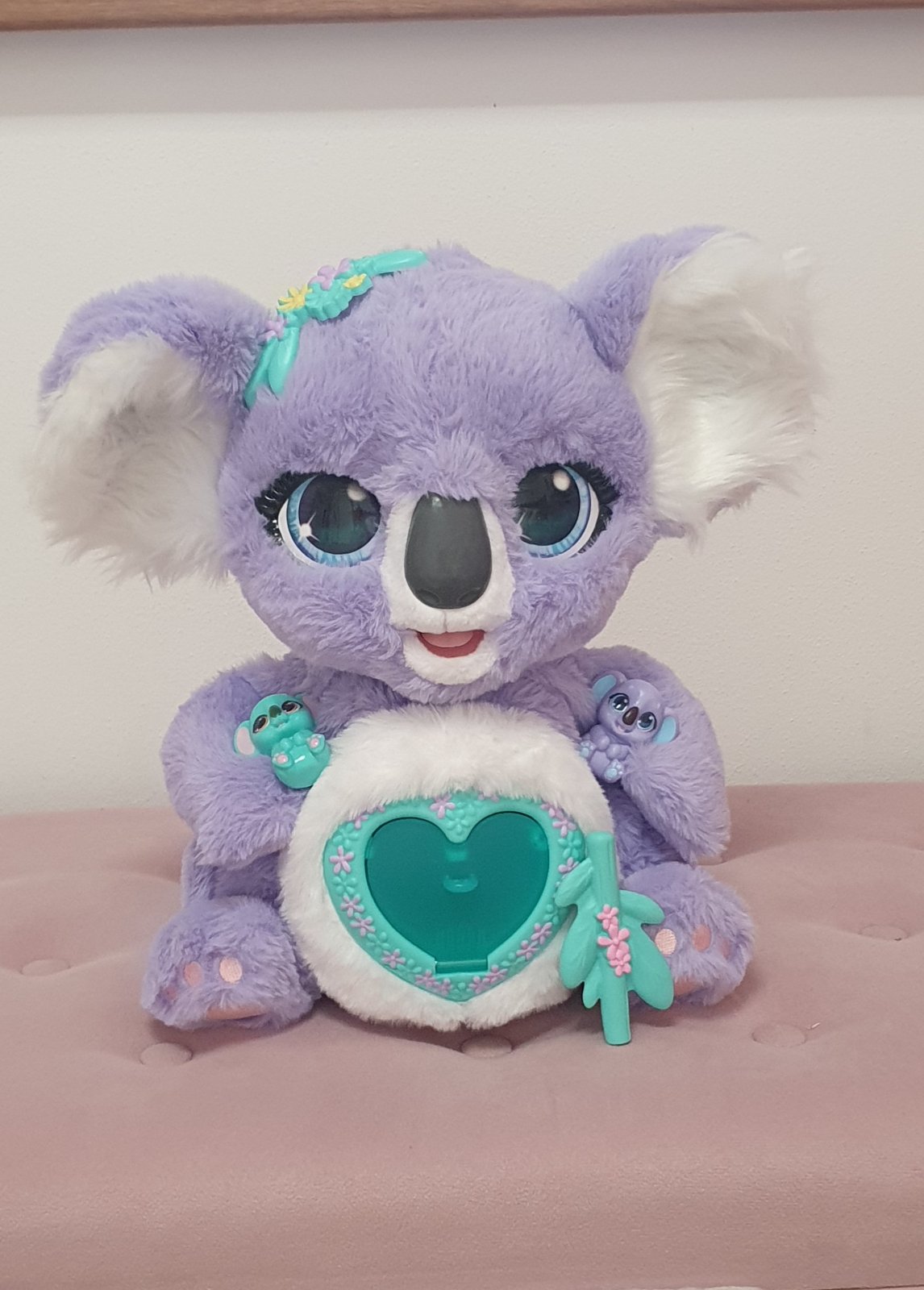 Keď ju dieťatko kŕmi, narodí sa jej v brušku mláďatko, 2 malé figúrky mladatka ...dajú sa vložiť zozadu do hlavy, po opakovanom kŕmení sa objaví v brušku bábätko. Kŕmi sa priloženým listom. Ako nová, použitá minimálne. Výška cca 40 cm