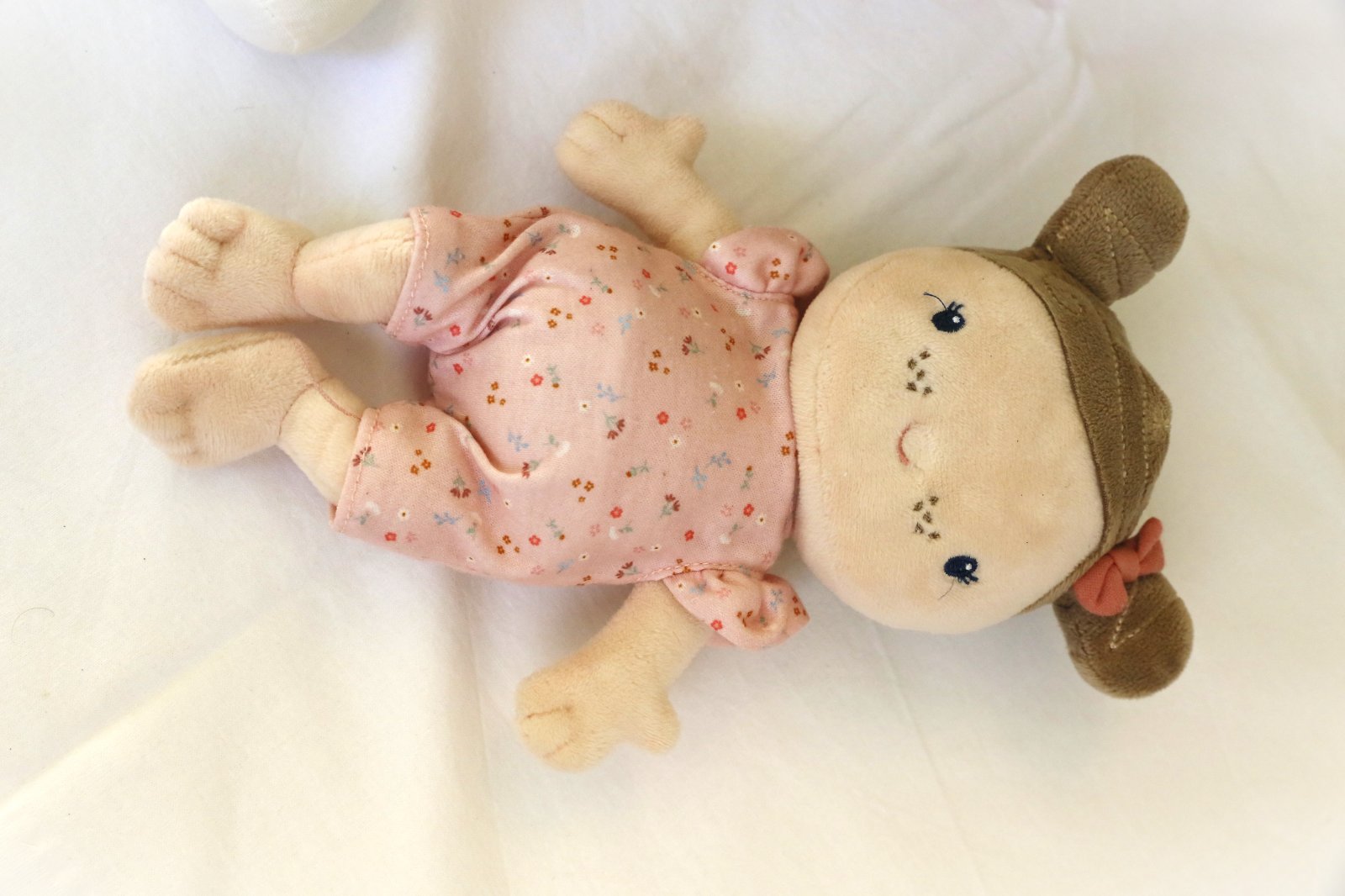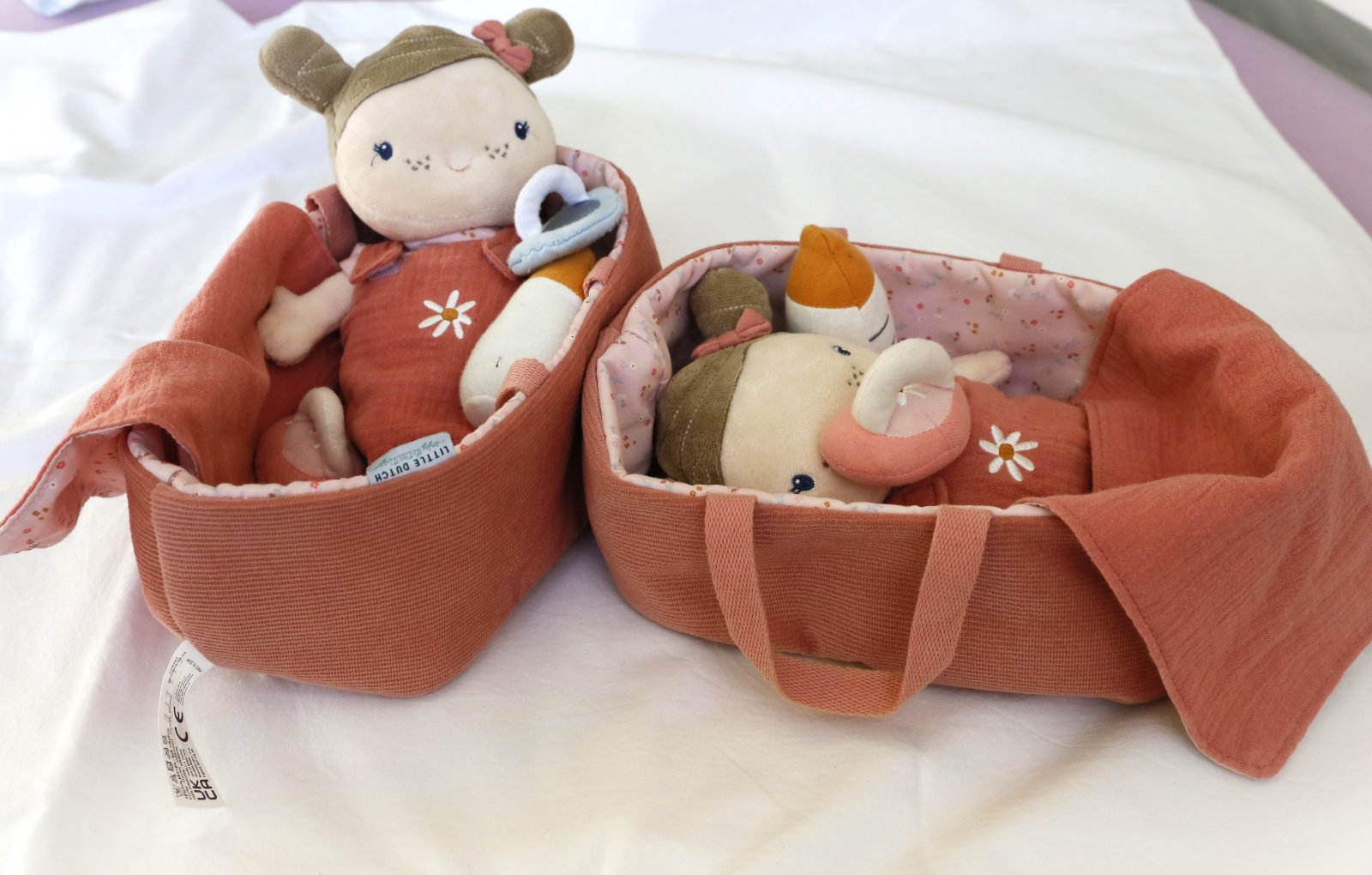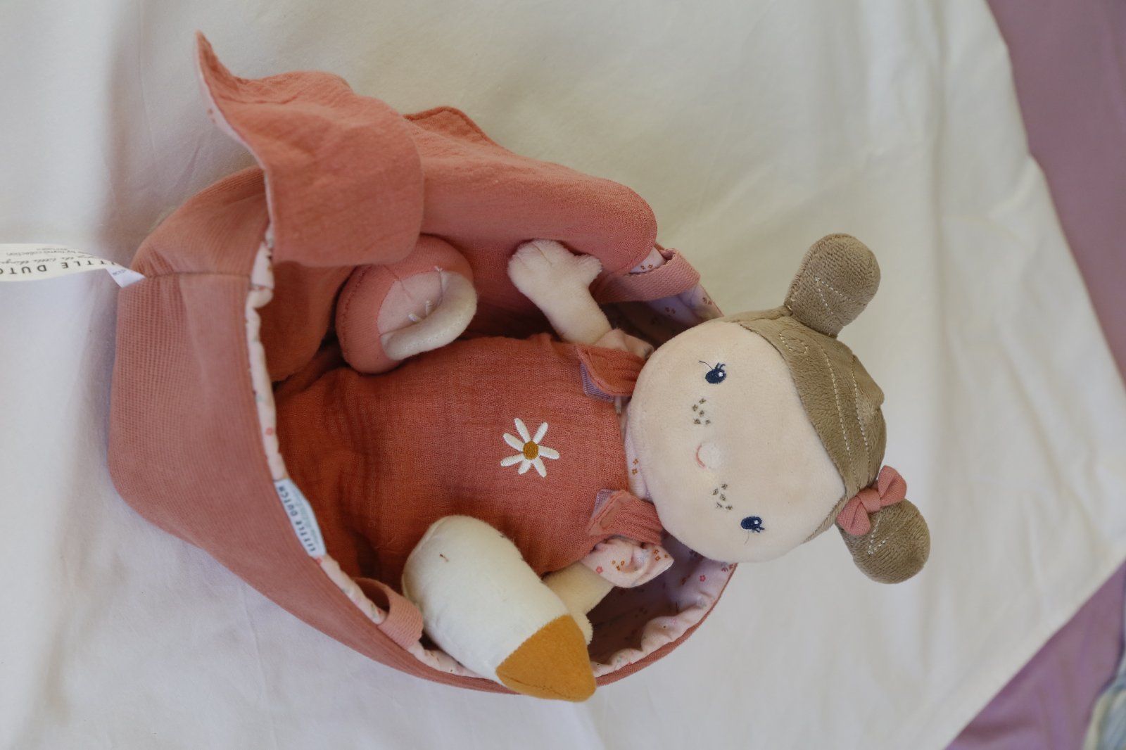 Jemná plyšová bábika, v praktickej vaničke/košíku s uškami na prenášanie. Cumlík aj fľaška je na magnet. Fusačik/spací vak sa dá ľahko vyzliect. Bábika má aj plienočku, ktorú ide ľahko dať dole a opäť zapnúť. Grátis ponúkam ďaľší vankúšik (plnený levanduľou) a perinku. Mám aj jeden cumlík navyše (dva ružové, jeden modrý). Dlžka je cca 24 cm